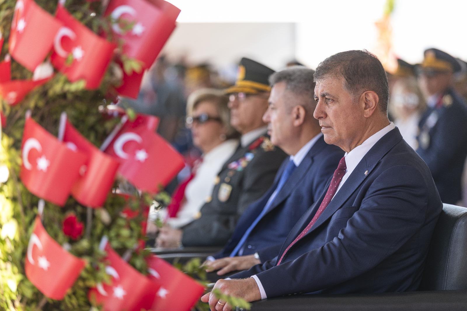 Törende konuşan İzmir Büyükşehir Belediye Başkanı Dr. Cemil Tugay, “Her kentin özel, güzel, değerli günleri vardır. Bu günlerin en güzelleri, Türkiye Cumhuriyeti’nin tarihine yazılmış özel günlerdir. Hepsi değerli, hepsi önemli, hepsi saygın ve onurludur. Ama bir kent vardır ki, tarihe işgaliyle kurtuluş ateşini yakan, kurtuluşu ile yepyeni bir ülkenin önsözünü yazan kent olarak yazılmıştır. İşte bu ayrıcalık, bu onur, bu gurur yeryüzünde sadece İzmir’e aittir ve İzmir onun bu değeri en yüksek düzeyde yaşayanların yaşatanların, dosta düşmana anımsatanların memleketidir. Kendimizle, kentimizle, eşsiz ayrıcalığımızla ne kadar övünsek azdır. Biz 9 Eylülleri bitmeyen düşmanlık, tükenmeyen kin, boş hamaset, kof böbürlenmeyle anmayız. Biz emperyalizme ve maşalarına unutulmaz bir ders verdikten sonra, tüm dünyaya “bir daha asla, isterseniz denemesi bedava” çağrısı yapanların çocuklarıyız. “Yurtta Barış, Dünyada Barış” sözüyle yeryüzünün bir kardeşlik sofrasına dönmesini öngören Gazi Mustafa Kemal Atatürk’ün yurttaşlarıyız. Biz önüne serilen düşman bayrağını görünce, “Kaldırın hemen! Bir ulusun bayrağı çiğnenemez” diyen bir centilmenin bu sözüne ev sahipliği yapmış İzmir’iz” dedi.