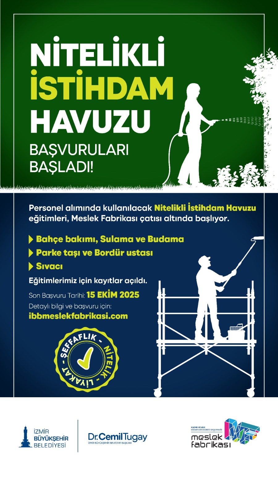 İzmir Büyükşehir Belediyesi, personel alımlarında yeni bir sistem başlatıyor. Meslek Fabrikası’nın bazı branşlarındaki eğitimleri başarıyla tamamlayan kursiyerler, artık Nitelikli İstihdam Havuzu’na dahil edilecek. Personel ihtiyacı oluştuğunda işe alım süreçleri bu havuz üzerinden objektif kriterlerle yürütülecek. Yeni başlatılacak eğitimler için son başvuru tarihi ise 15 Ekim olarak belirlendi.