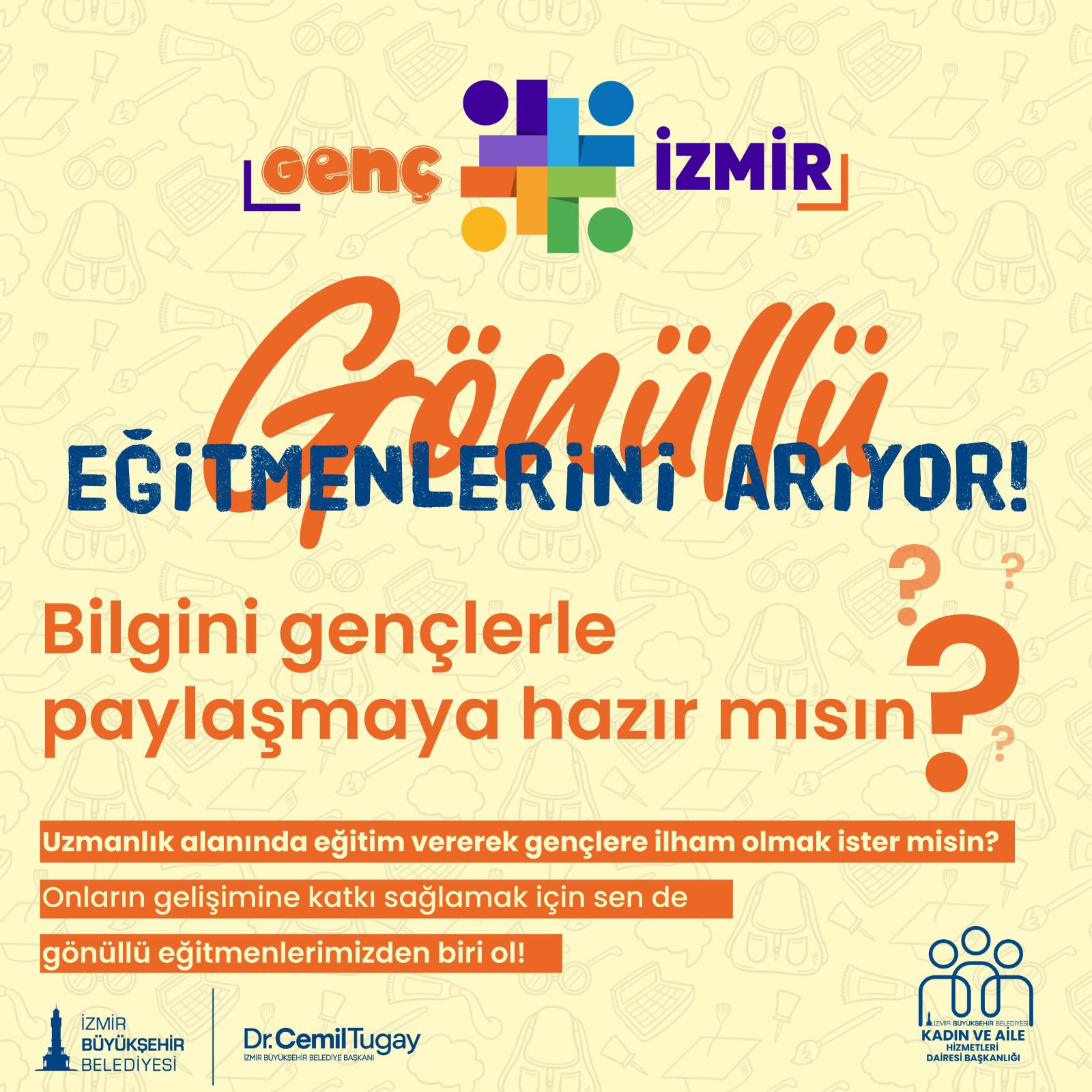 Genç İzmir çatısı altında düzenlenen atölye, kurs ve etkinliklerde görev alacak gönüllü eğitmenler; kendi uzmanlık alanlarını gençlerle paylaşma, deneyimlerini aktarma ve gençlerin gelişimine katkı sağlama imkânı bulacak. Bu süreçte gönüllü eğitmenler yalnızca bilgi aktaran değil, aynı zamanda gençlerle birlikte üreten, öğrenen ve paylaşan bir rol üstlenecek.