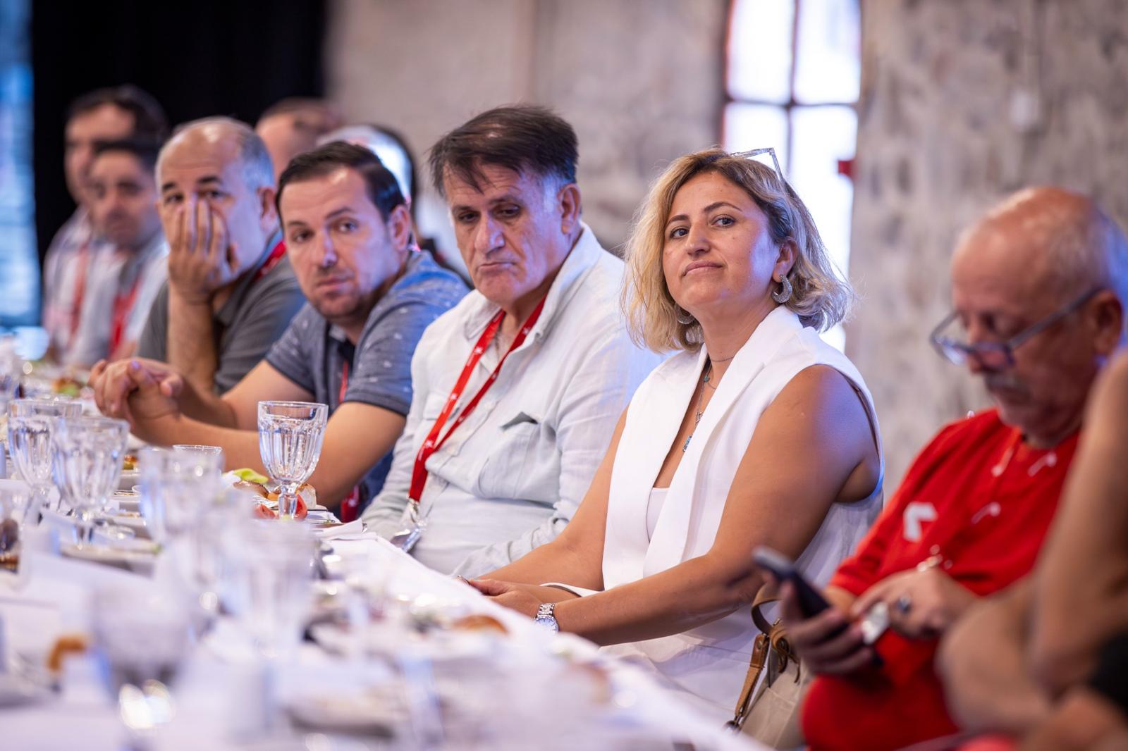 Kendisine milli takım forması ve atkısı hediye edilmesinden duyduğu mutluluğu dile getiren Başkan Tugay, Türkiye’nin son yıllarda sporda çok büyük başarılar elde ettiğini hatırlattı. Kadın voleybol ve erkek basketbolda oynanan finallere değindi. İzmir Büyükşehir Belediyesi Spor Kulübü’nün sporcusu olan ya da bünyesinde yetişen Taha Akgül, Buse Tosun Çavuşoğlu, Ferhat Arıcan, Duygu Çete, İzzettin Kanat isimleri örnek gösteren Başkan Tugay, sporcuların olimpiyatlardan madalyalarla ve derecelerle dönmesini halkın göğsünü kabartan bir olay olarak nitelendirdi. Ferhat Arıcan’ın 108 yıl sonra olimpiyata giden ilk Türk jimnastikçi olmasını da hatırlatan Başkan Tugay ayrıca, “Bu çocuklar İzmir’in çocukları. Her birisi bizim evladımız. Her birisi döktükleri terin karşılığında sadece kendilerine değil bizlere de büyük onur yaşatan sporcularımız. Onlara ve onlar gibi başka çocuklara sahip çıkmak her birimizin görevi. Sizlerin, bizlerin elinden tuttuğu, hayaline ortak olduğu o çocuklar, yarın bir gün olimpiyat madalyasını, dünya kupasını ülkemize getirecek belki. Spor yapma isteği, yeteneği olan çalışkan çocukları keşfetmeli ve onlara sporu sevdirmelisiniz. Sizler böyle çocukları, gençleri bulduğunuzda bize söyleyin, ‘ışık saçıyor, başarılı olacak’ deyin onlara ekstra destek olalım. Biz de bir şeyler yapalım. Bunun maddi karşılığı yok. İnanmanız gerekiyor. Hep beraber inanmamız gerekiyor. İnşallah ileride bir gün birbirimize anlatacağımız hikayelerimiz, parçası olduğumuz çok güzel başarılar olsun” dedi.