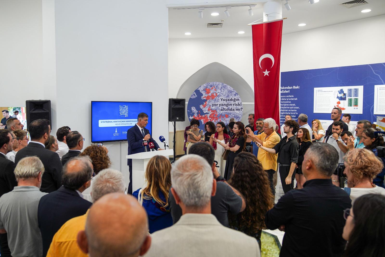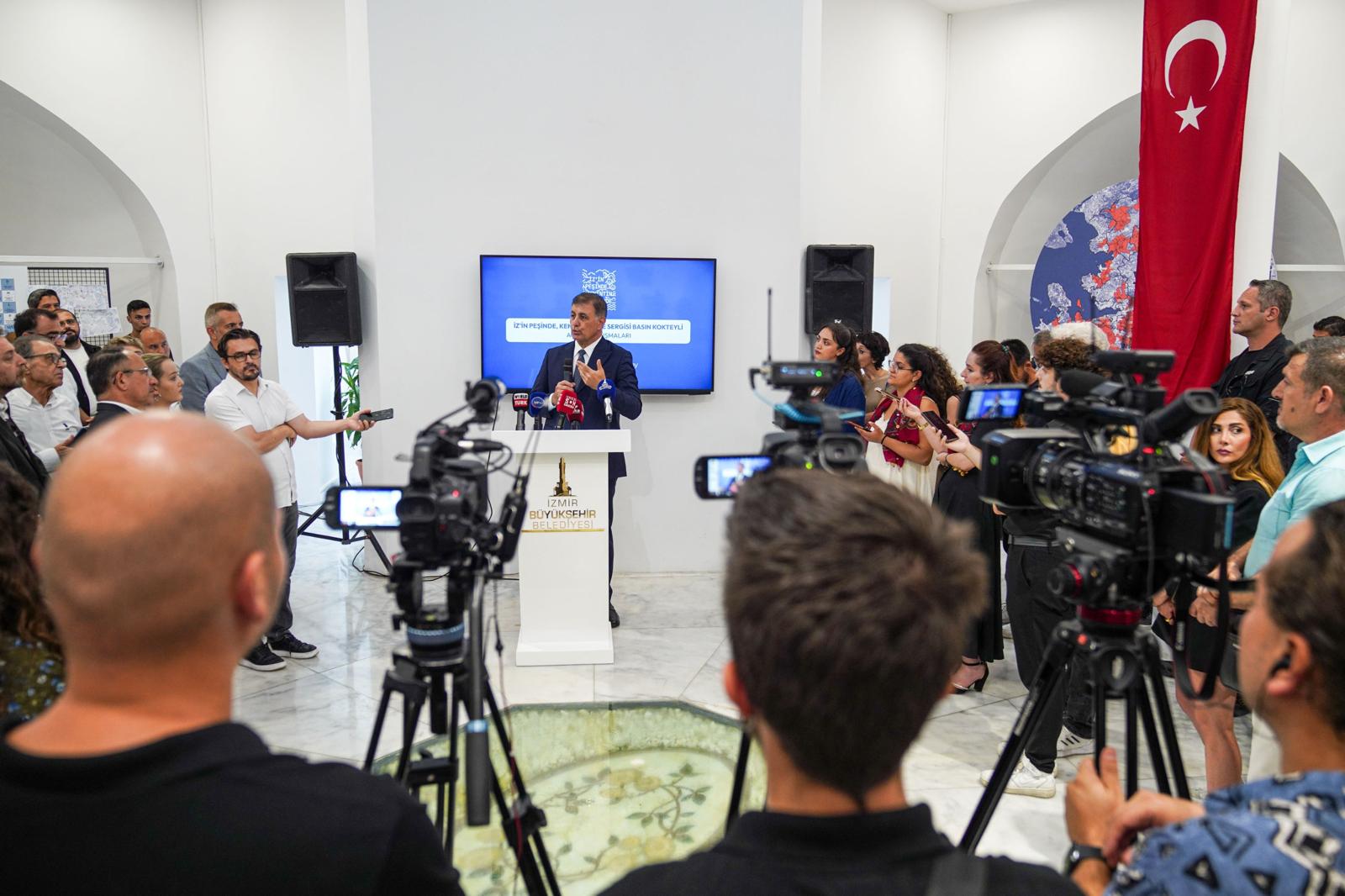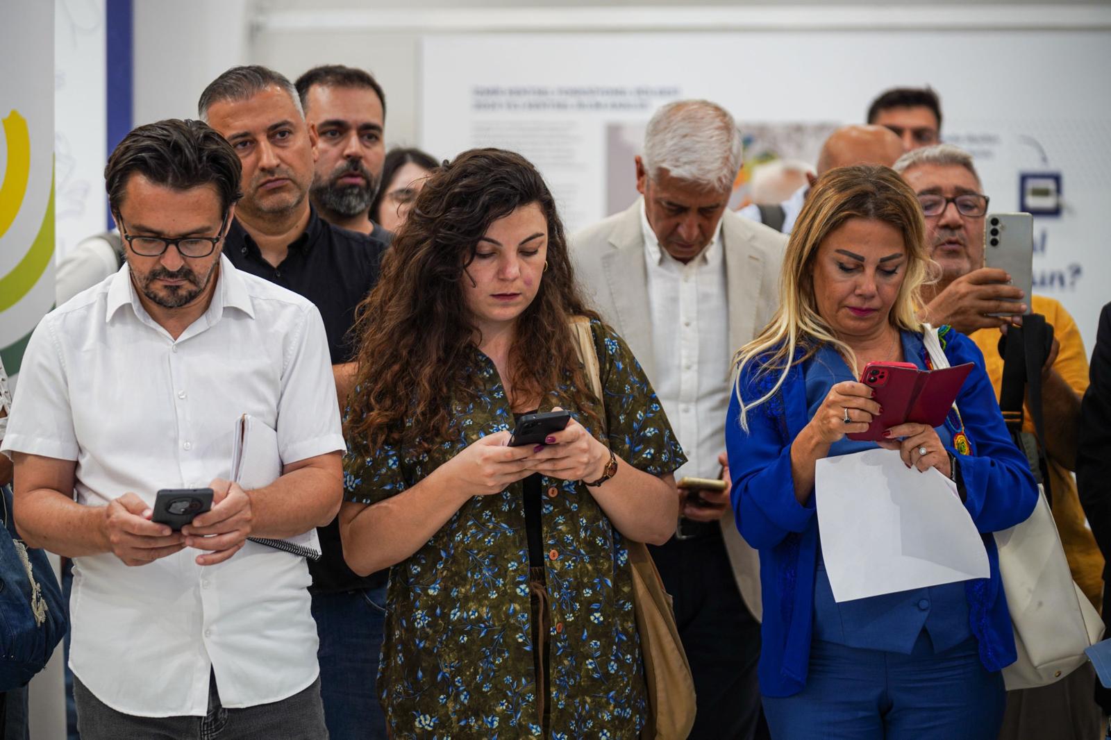 Koray Velibeyoğlu, sergide yer alan çalışmalar hakkında basın mensuplarını bilgilendirdi. Sergiyi 10 gün içinde 15 bin ziyaretçinin gezdiğini ifade eden Velibeyoğlu, sergide karekod ile İzmir’in sorunları ve ihtiyaçlarına dair yapılan anketler hakkında verileri anlattı. Ardından basın mensuplarını ankete katılmaya davet eden Velibeyoğlu, canlı olarak cep telefonları aracılığıyla basın mensuplarının görüşlerini aldı. Canlı ekranda basın mensuplarının İzmir ile ilgili ankete dair verileri yansıtılırken en önemli sorunlar arasında deprem, ulaşım, iklim krizi, çevre sorunları gibi konular yer aldı.