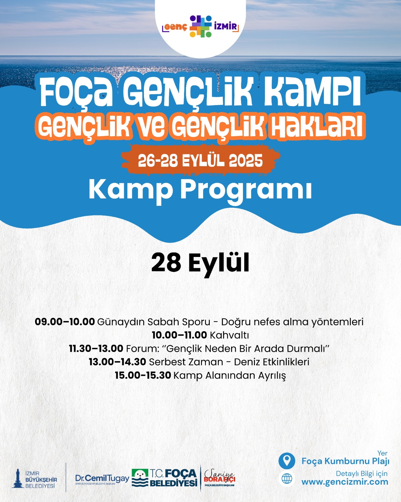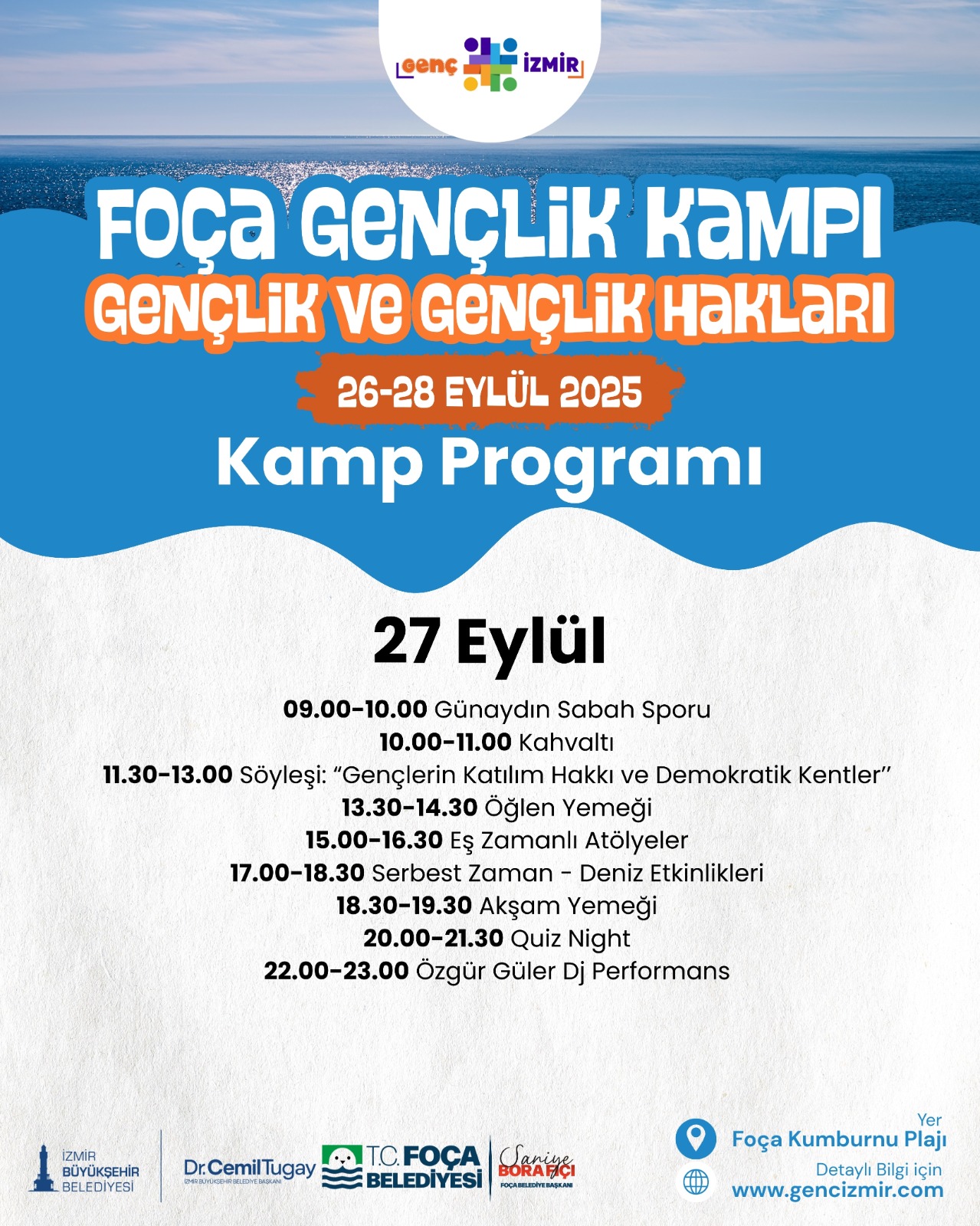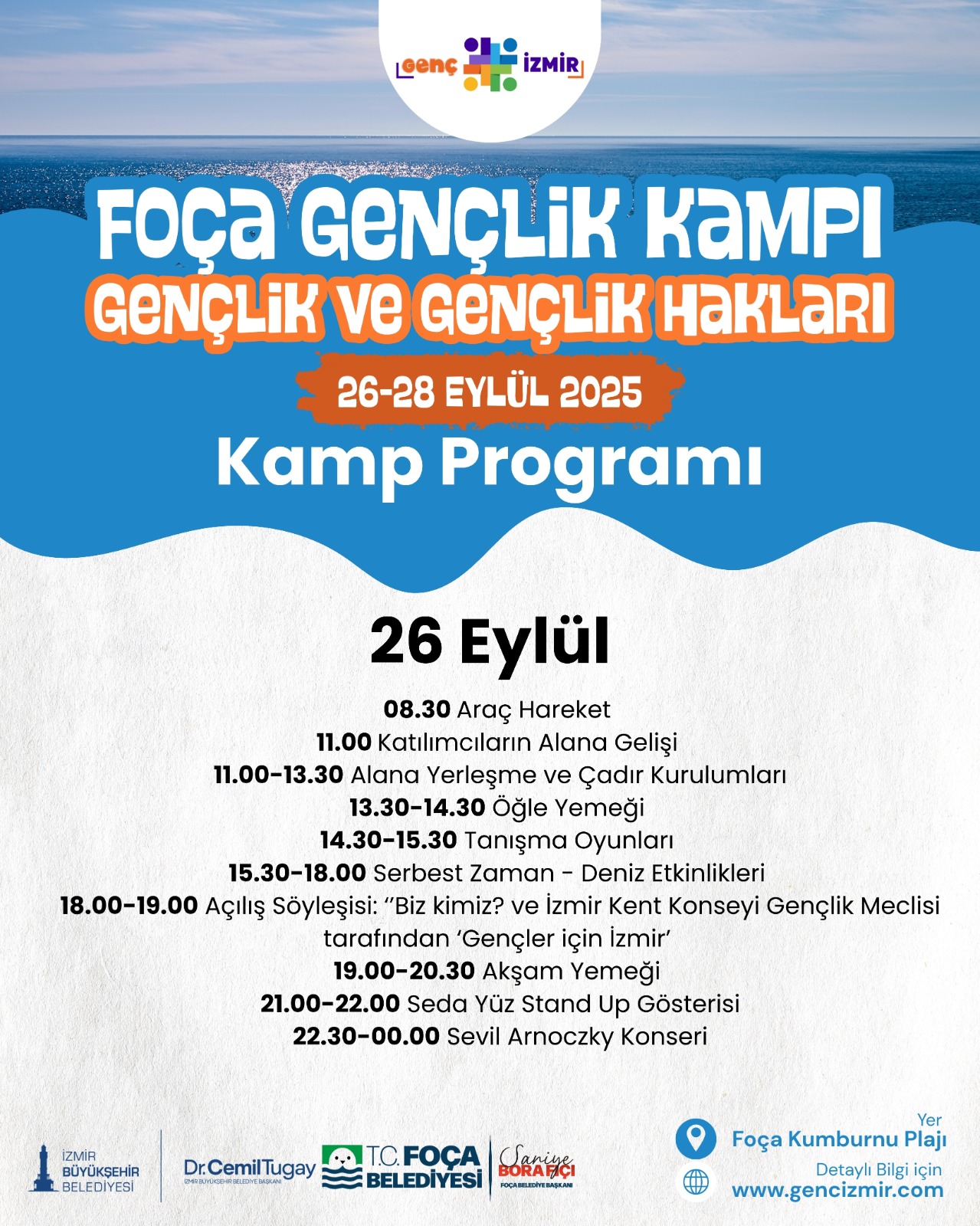 İzmir Büyükşehir Belediyesi ve Foça Belediyesi iş birliğiyle Kumburnu Plajı’nda 26-28 Eylül tarihlerinde gençlik kampı düzenlenecek. “Gençlik ve Gençlik Hakları” temasıyla 3 gün sürecek etkinlik ücretsiz olacak.