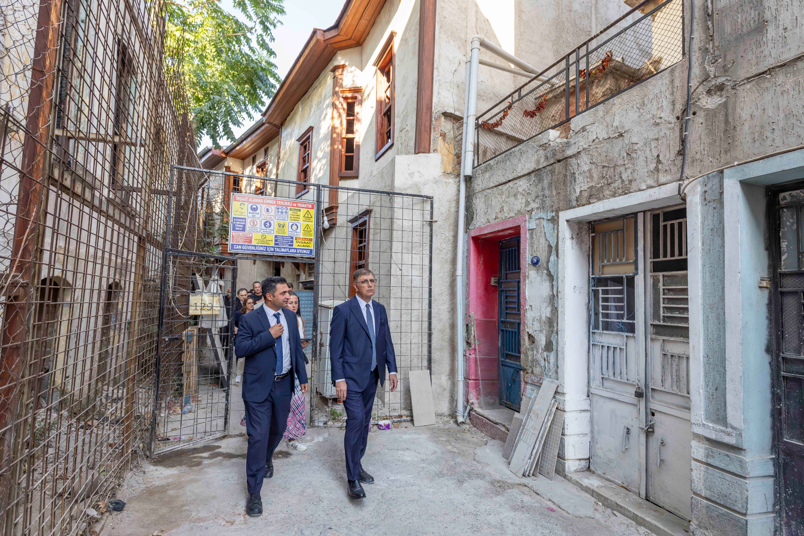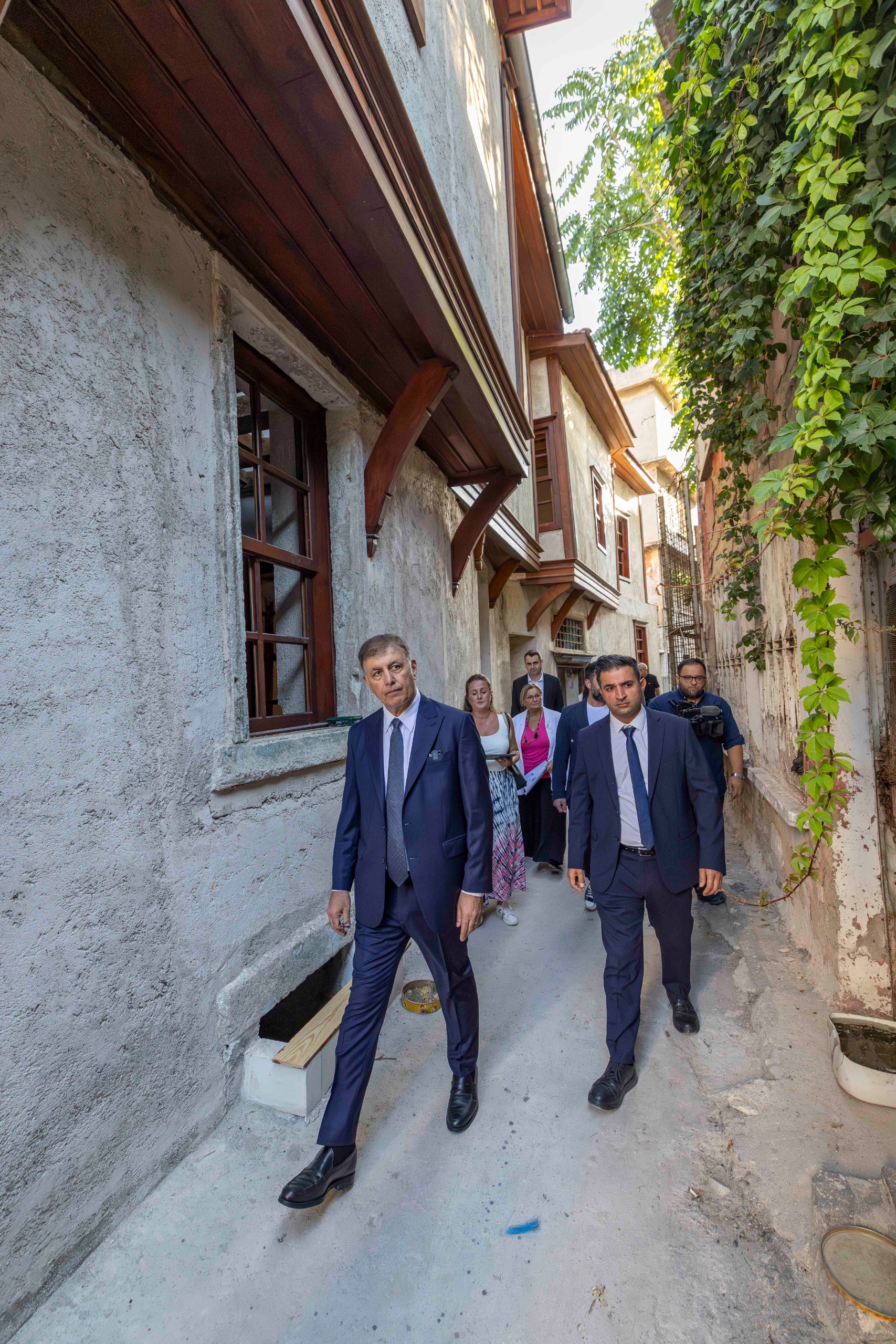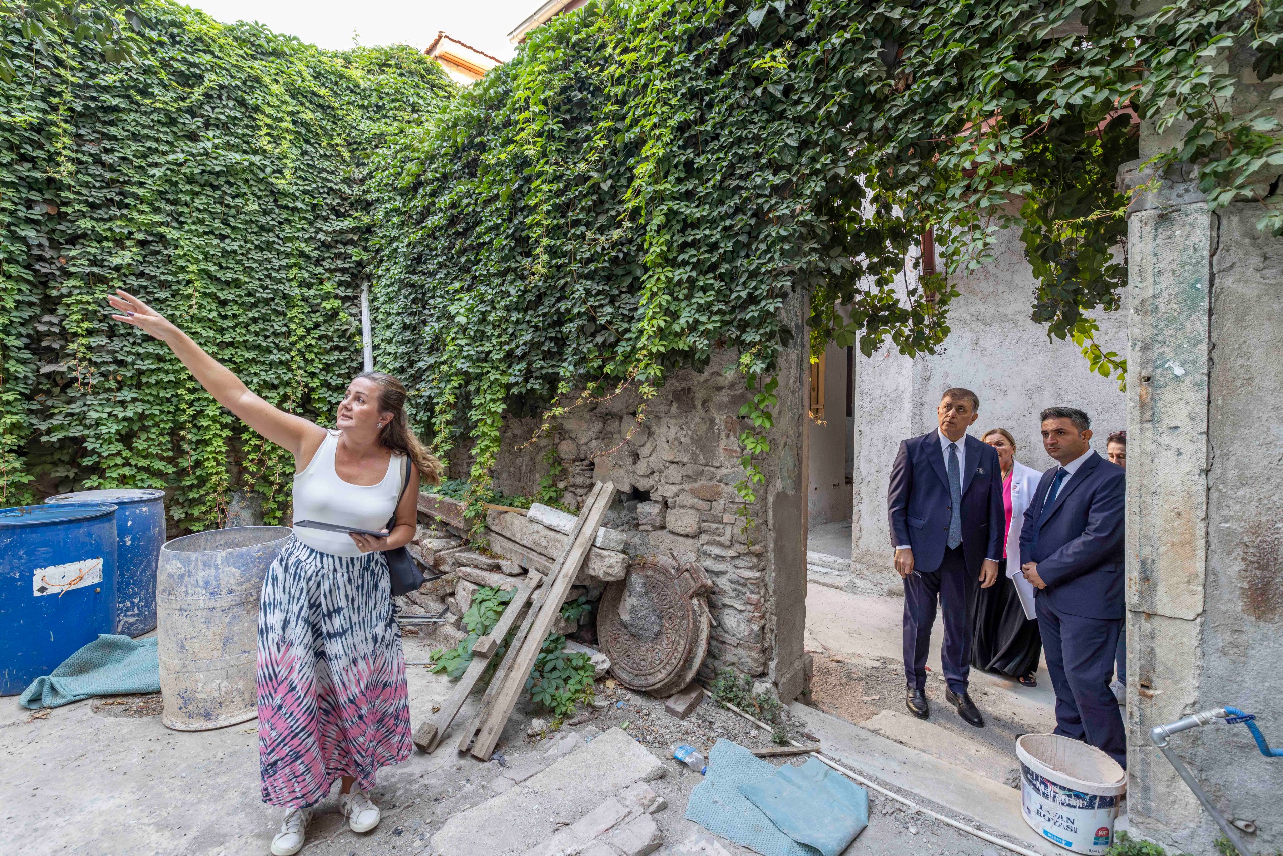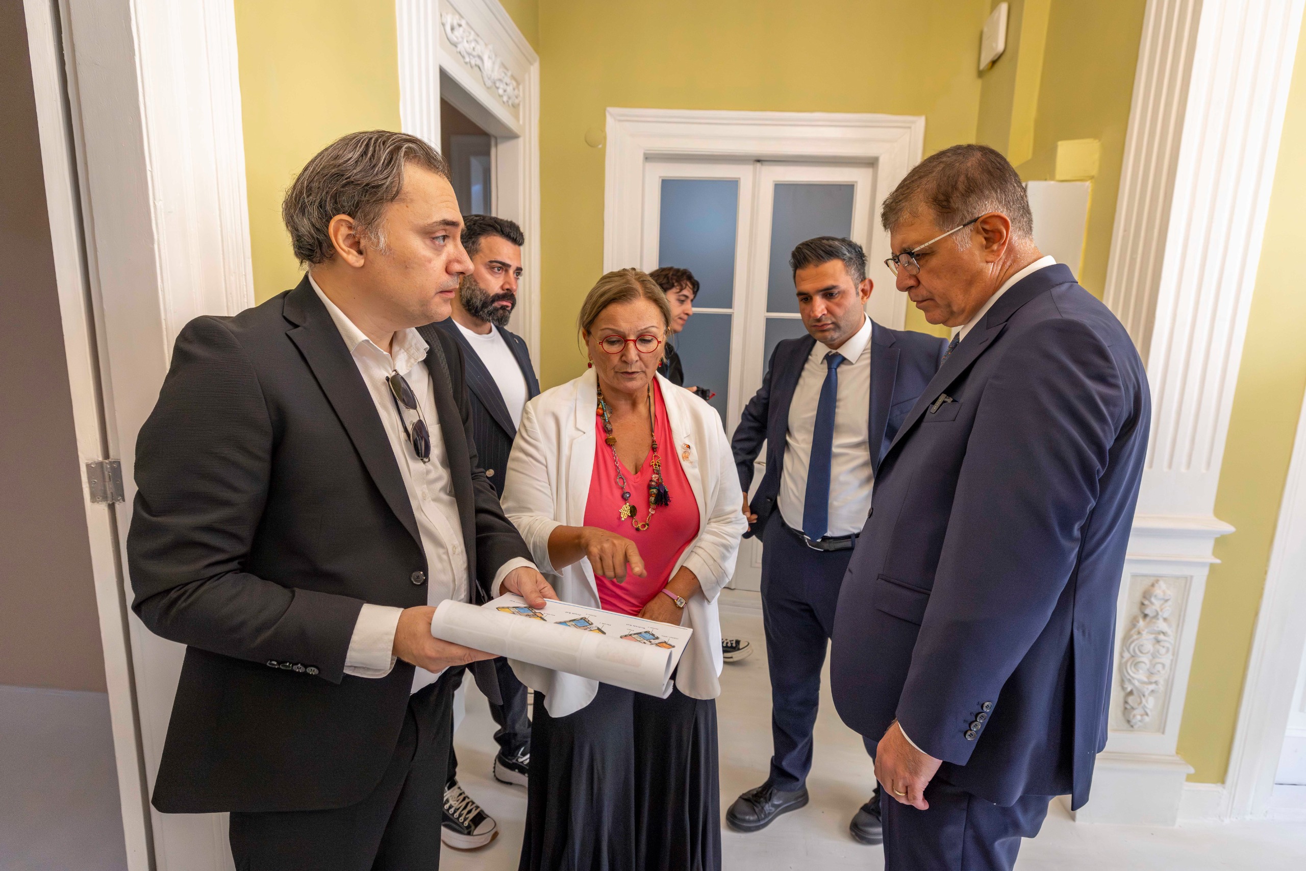 Başkan Tugay, ilk olarak Basmane bölgesinin en büyük tarihi konakları arasında yer alan Tevfik Paşa Konağı’nı ve restorasyon çalışması kapsamında yer alan Gevrekçi Kız Sokağı 1’inci etap projesine dahil olan parselleri ziyaret etti. 19. yüzyılda konak olarak inşa edilen ve 20. yüzyılın ilk çeyreğinde otele dönüştürülen Tevfik Paşa Konağı’nın restorasyonuna yönelik ilk çalışmalar 2022 yılında başlamıştı. 3 katlı ana yapı, 3 adet müştemilat binası, 1 kıraathane ve 1 dükkandan oluşan, Dönertaş Sebili ile Hatuniye Camisi’ne komşu olan bu yapı ve çevresinde bulunan parsellerdeki yapıların mevcut durumunu inceleyen Başkan Tugay, İzmir Büyükşehir Belediyesi tarafından günümüze kadar yürütülen çalışmalar hakkında bilgi aldı. Başkan Tugay, tarihi konak ve beş parseldeki tescilli yapıların yeniden ayağa kaldırılarak kente kazandırılması için restorasyon süreci hakkında yol haritası belirledi.