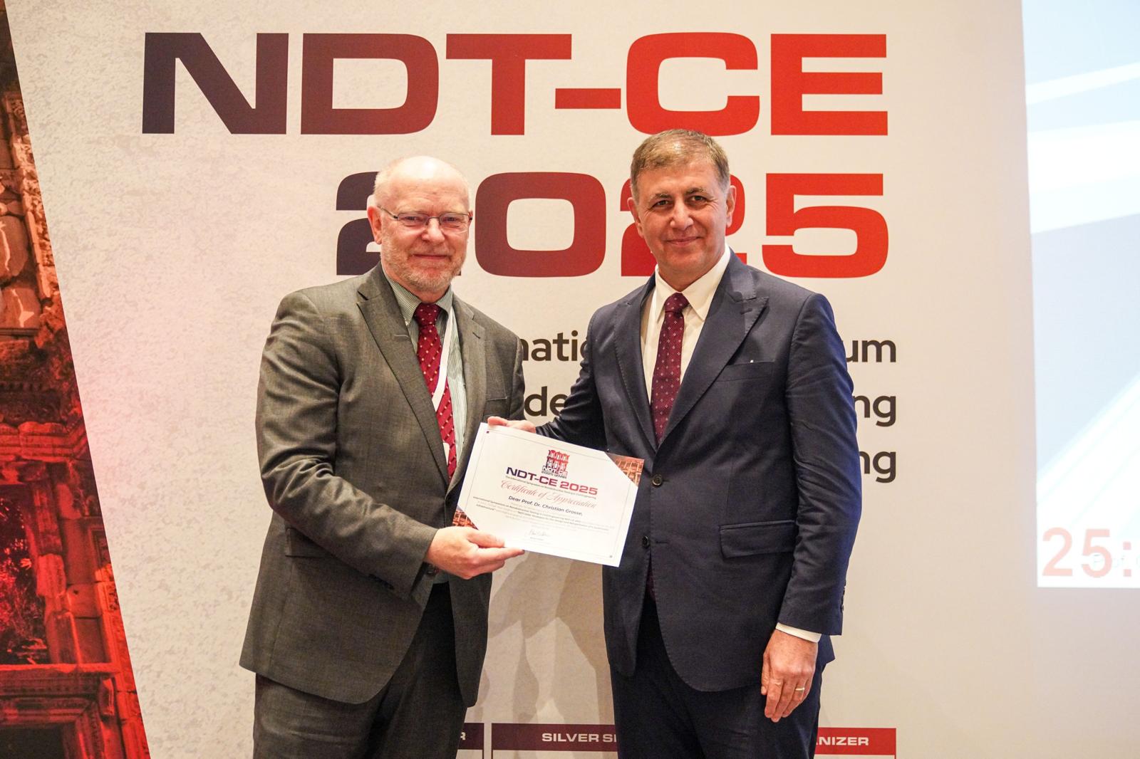 Sempozyuma davetli konuşmacı olarak katılan Münih Teknik Üniversitesi’nde görevli Prof. Dr. Christian Grosse ise “Sürdürülebilir Bir Altyapının Tasarımı ve Rehabilitasyonuna Yönelik Stratejiler” başlığı altında bir sunum yaptı. Grosse sunumunda yapıların güvenilirliği ve sürdürülebilirliği için tahribatsız muayene ve yapısal sağlık izleme teknolojilerinin uygulanabilirliği ile gerekliliğinin önemini vurguladı. Bu yöntemlerle hasar tespiti yapmanın doğal afetlere karşı daha dayanıklı yapılar inşa edilmesine katkı sağlayacağını belirten Grosse ayrıca tahribatsız muayene yöntemleri ile yapıların bakım-onarımlarına ayrılan sürenin ve maliyetin de azaltılmasının mümkün olacağını ifade etti. Grosse, “Bu sayede ülke çapında tüm yönetim birimleri için bütçe açısından önemli ölçüde tasarruf sağlanır. Tahribatsız hasar belirleme yöntemleri, deprem sırasında hasar görme riski yüksek olan metro, tünel gibi yapılar için erken uyarı sistemi imkanını sunar” açıklamasında bulundu.