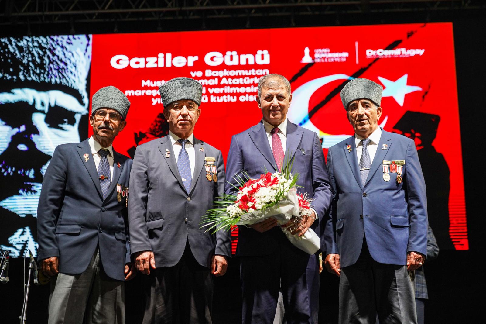 İzmir Büyükşehir Belediye Başkanı Dr. Cemil Tugay, 19 Eylül Gaziler Günü kapsamında, gazi, gazi yakınları ile şehit ailelerini Tarihi Havagazı Fabrikası Kültür Merkezi çim alanda ağırladı. İlçe belediye başkanları, sivil toplum örgütleri ve askeri kadroların da katıldığı programda konuşan Dr. Cemil Tugay, gaziliğin vatanseverler için cesaretin, vatan uğruna göğüslenen acıların ve bağımsızlık için ortaya konan kararlılığın simgesi olduğunu söyledi. Gazilerin vatanı ve vatandaşı korumak için kendi bedenlerini siper ettiğini vurgulayan Başkan Tugay, “Gazi Mustafa Kemal Atatürk’ün de dediği gibi gaziler bu milletin yaşayan anıtlarıdır. Gösterdikleri cesaret bugün hala bekçisi olduğumuz özgürlüğümüzün ve cumhuriyetimizin teminatıdır. Ben bu değerlerle büyüyen bir mirasa sahip çıkmak için yetiştirilen bir insanım. Bir gazi çocuğuyum. Kıbrıs gazisi bir babanın oğluyum. Babamdan ve büyüklerimden, vatansever öğretmenlerimden bağımsızlığın değerini, dayanışmanın kıymetini ve vatan sevgisinin ağırlığını öğrendim. Bugünleri görebilmemiz için Cumhuriyet tarihi boyunca bu ülkenin evlatlarının verdiği mücadeleyi, onların fedakarlıklarını dinledim” dedi.