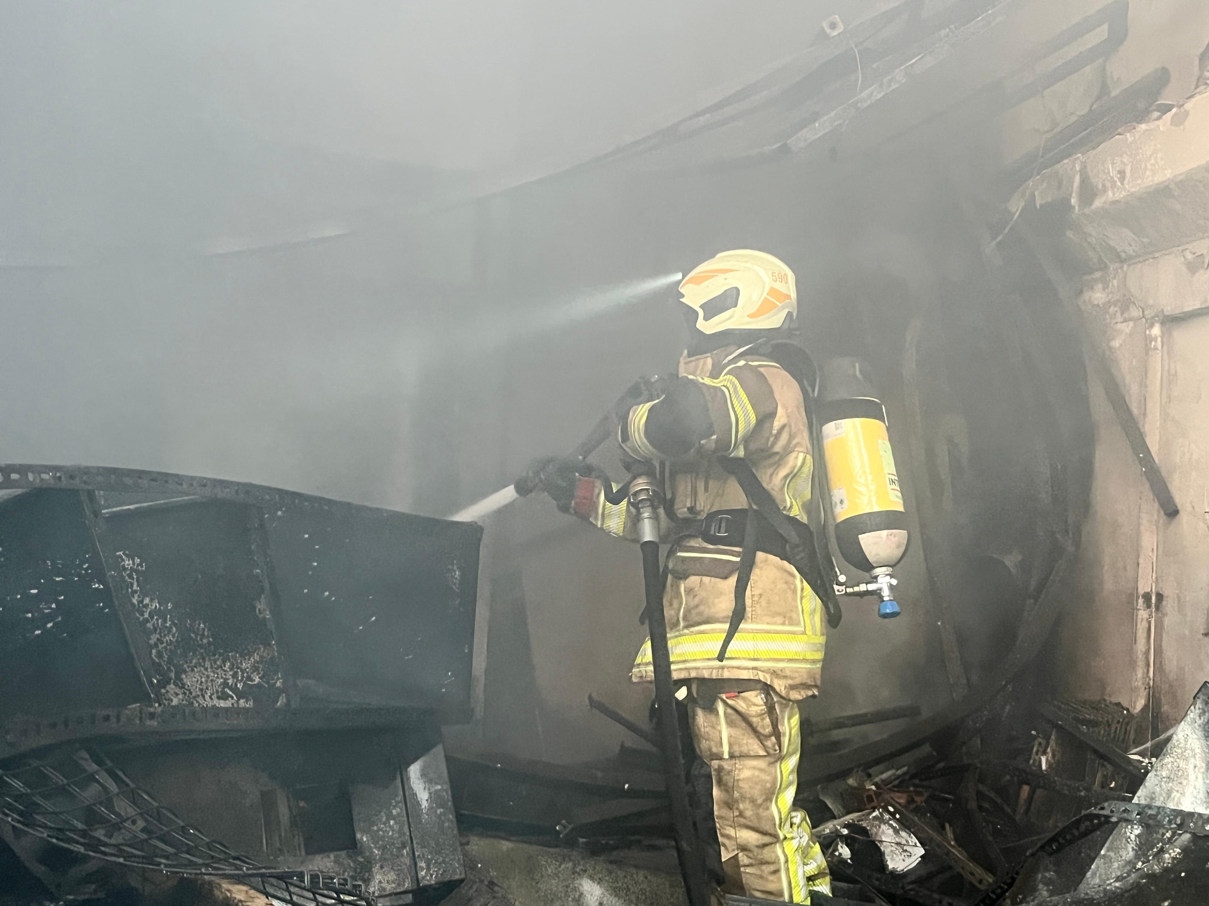 İzmir’in Bornova ilçesinde demir atölyesi olarak kullanılan iş yerinde çıkan yangına, İzmir Büyükşehir Belediyesi İtfaiyesi çok sayıda araç ve personelle müdahale etti. Yangını kontrol altına alan ekipler soğutma çalışmalarını sürdürüyor.