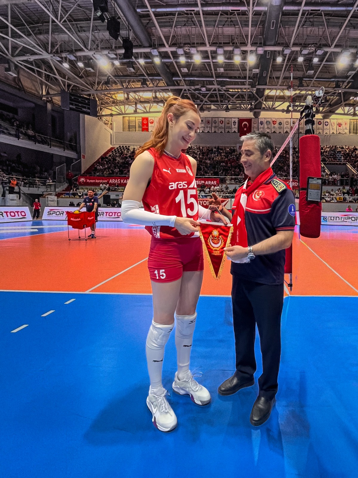 Vodafone Sultanlar Ligi’nde 2025-2026 sezonunun ilk haftası 12 Ekim’de oynanan karşılaşmalarla tamamlandı. Aras Spor Kulübü’nün Fenerbahçe Medicana ile karşı karşıya geldiği mücadele, Alsancak Atatürk Spor Salonu’nda yapıldı. Karşılaşma öncesinde Aras Spor Kulübü, yaz aylarında meydana gelen orman yangınlarında gösterdikleri özverili çalışmalar nedeniyle İzmir Büyükşehir Belediyesi İtfaiye Dairesi Başkanlığı’na anlamlı bir jestte bulundu. İtfaiye Dairesi Başkanı Yaşar Korkmaz ve beraberindeki itfaiye personeli, alkışlar eşliğinde sahaya davet edilerek plaketle onurlandırıldı. Plaketi, Aras Kargo Genel Müdürü ve Yönetim Kurulu Üyesi Utku Ayyarkın takdim etti. Ayrıca İtfaiye Dairesi Başkanı Yaşar Korkmaz, Türkiye A Milli Kadın Voleybol Takımı ve Fenerbahçe kaptanı Eda Erdem Dündar ile Aras Spor Kulübü kaptanı Hazal Selin Uygur’a İzmir İtfaiyesi’nin flamasını takdim ederek, iki takıma da başarılı bir sezon geçirmeleri temennisinde bulundu.