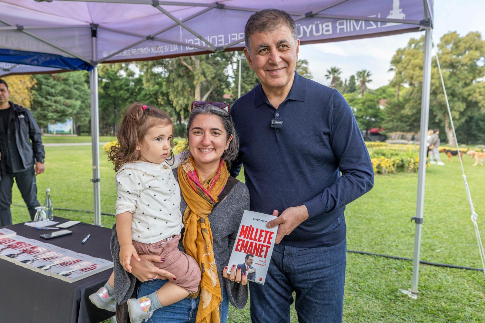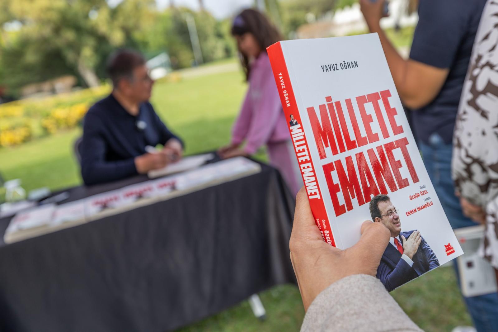 İzmir Büyükşehir Belediye Başkanı Dr. Cemil Tugay, Kültürpark’ta kapılarını açan İZKİTAPFEST - 6. İzmir Kitap Fuarı kapsamında, tutuklu İstanbul Büyükşehir Belediye Başkanı Ekrem İmamoğlu adına gazeteci Yavuz Oğhan’ın kaleme aldığı “Millete Emanet” kitabını İzmirliler için imzaladı. Ekrem İmamoğlu’nun yaşamını, mücadelesini ve ortaya koyduğu çalışmaları anlatan kitabın imza günü, İZKİTAPFEST’in ikinci gününde, Pakistan Pavyonu yanındaki imza alanında gerçekleştirildi. İmza öncesi Kültürpark’a gelen kitapseverlerle kucaklaşan Başkan Tugay, ardından İzmirlilerin kitaplarını imzaladı. Uzun kuyrukların oluştuğu imza etkinliği yaklaşık iki saat sürdü.