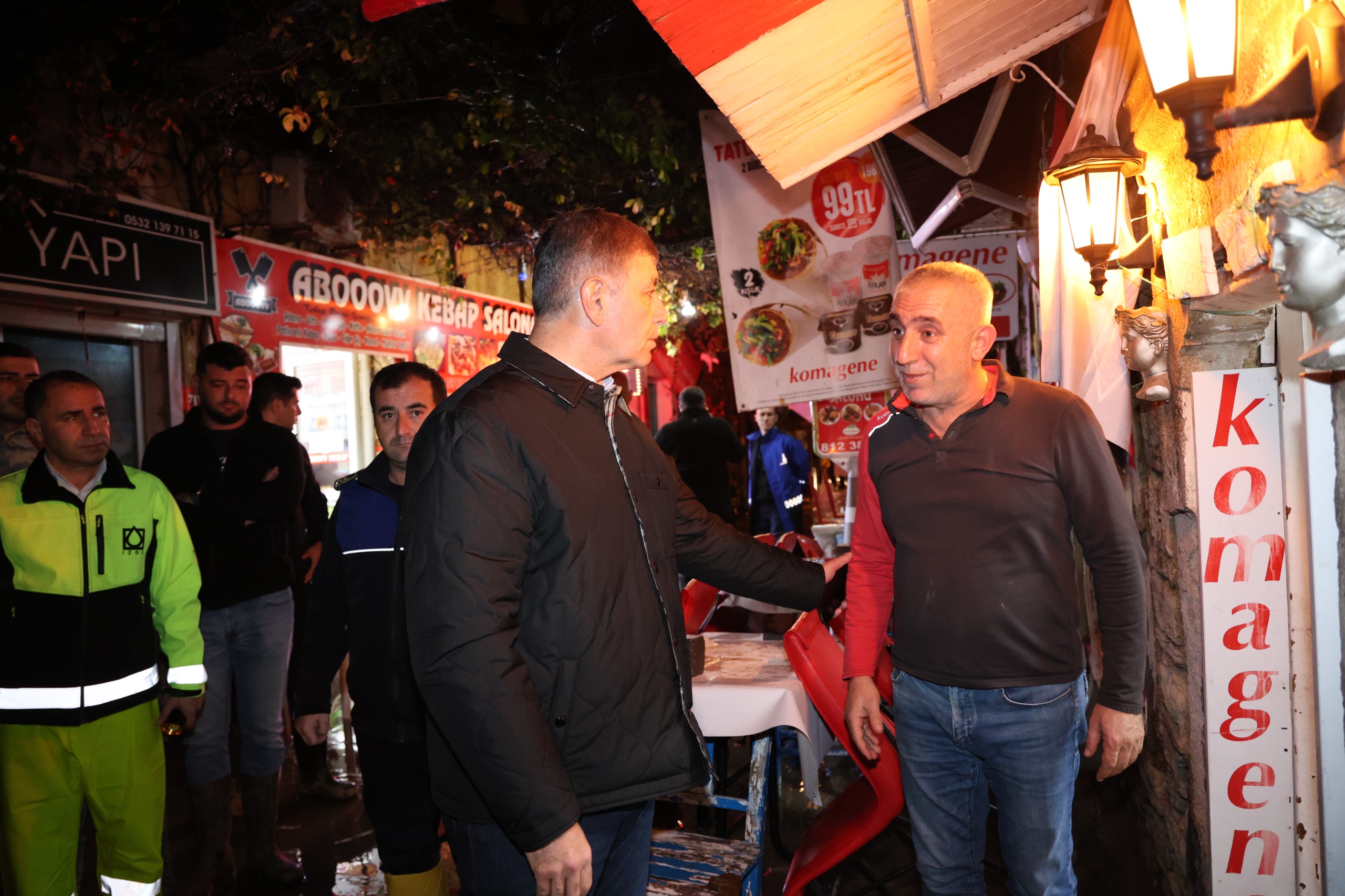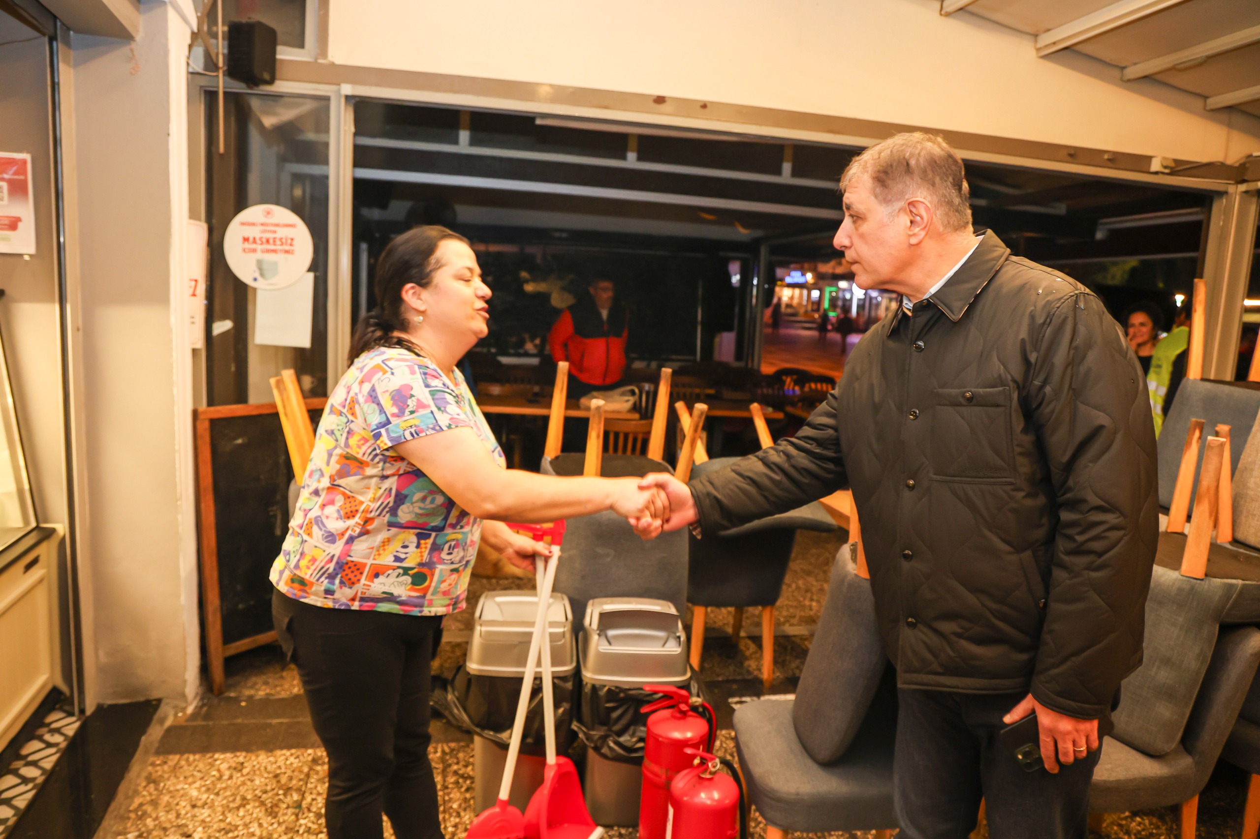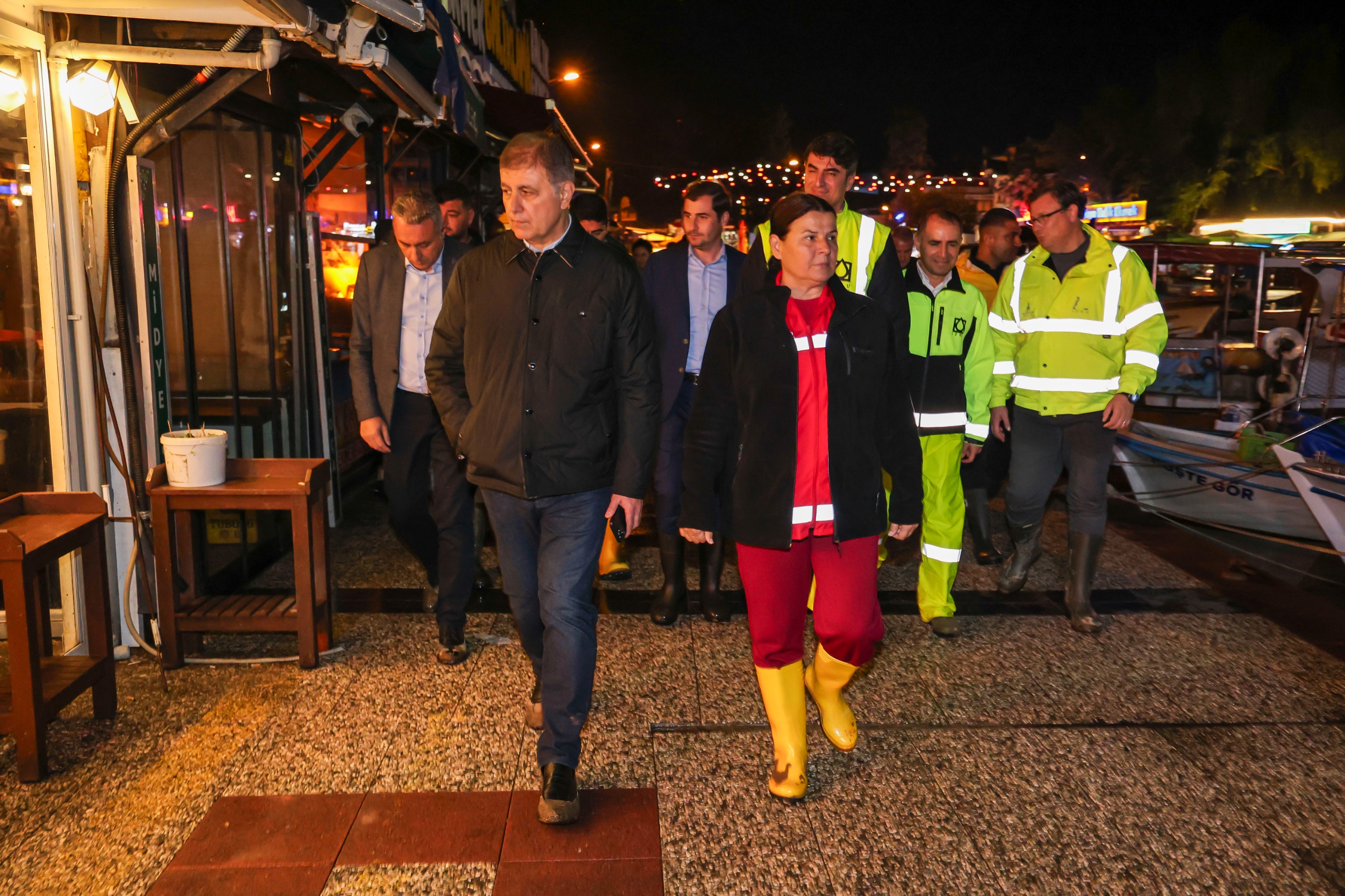 Başkan Tugay Yeni Foça sahilde ekiplerin yürüttüğü su tahliyesi, mazgal temizleme, kanal açma gibi çalışmaları inceledi. Başkan Tugay, deniz taşması sonucu bölgede yaşanan durum hakkında bilgi aldıktan sonra Foça merkeze geldi. Burada esnafı ziyaret eden Başkan Tugay, eksikliklerin giderilmesi için ilgili birimlere talimat verdi. Esnafın yanı sıra Foça sokaklarında evleri su basan yurttaşlarla da bir araya gelen Başkan Tugay, talepleri ve ihtiyaçları dinledi.