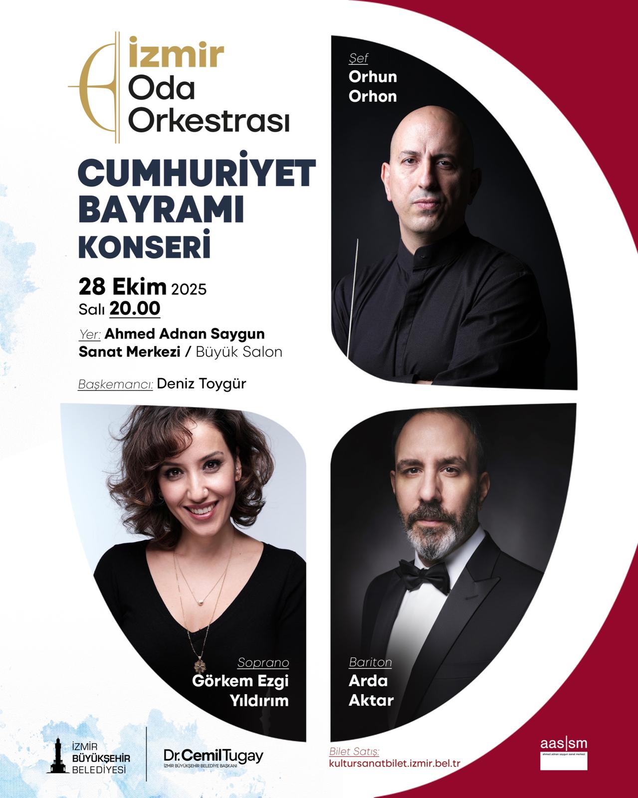 İzmir Oda Orkestrası Cumhuriyet Bayramı konseri, 28 Ekim Salı saat 20.00'de Ahmed Adnan Saygun Sanat Merkezi Büyük Salon'da sahnelenecek. İzmir Oda Orkestrası, Cumhuriyet’in 102. yılını coşkuyla kutlamak için sahnede olacak. Şef Orhun Orhon yönetiminde, soprano Görkem Ezgi Yıldırım ve bariton Arda Aktar’ın solistliğinde gerçekleşecek konserde, klasik batı müziğinin Türk öncü bestecilerinin eserleri ve seçkin aryalar yer alacak. Konserin bilet satışları, kultursanatbilet.izmir.bel.tr adresi üzerinden yapılıyor.