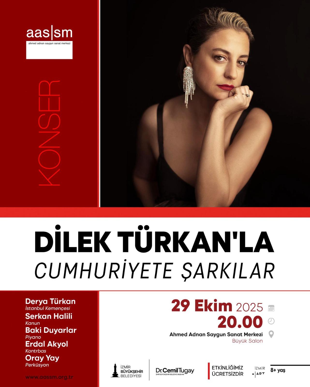 Klasik Türk Müziği yorumcusu Dilek Türkan ile Cumhuriyet’e Şarkılar konseri, 29 Ekim Çarşamba günü saat 20.00’de Ahmed Adnan Saygun Sanat Merkezi`nde gerçekleştirilecek. Dilek Türkan’ın solist olarak yer alacağı konserde Derya Türkan (İstanbul kemençesi), Serkan Halili (kanun), Baki Duyarlar (piyano), Erdal Akyol (kontrbas) ve Oray Yay (perküsyon) seyirciyle buluşacak. Konserde, geçmişten günümüze Cumhuriyet döneminin Türk müziği eserleri seslendirilecek. Konsere katılım ücretsiz olacak.
