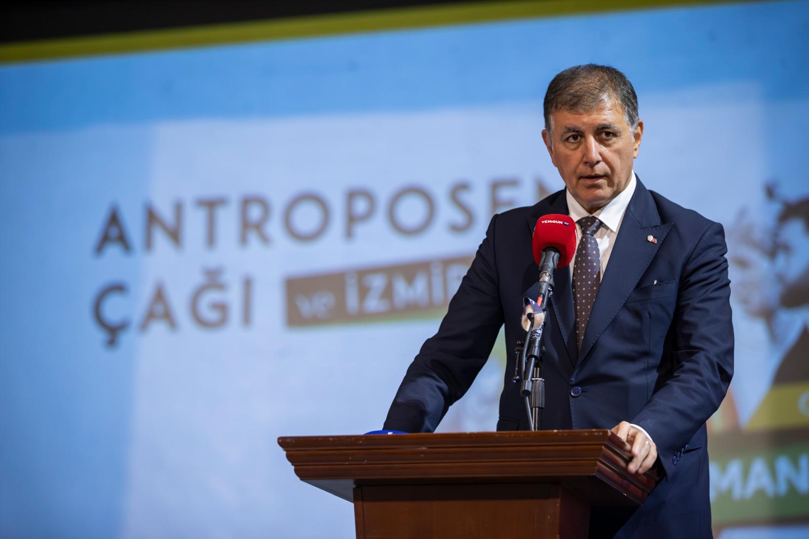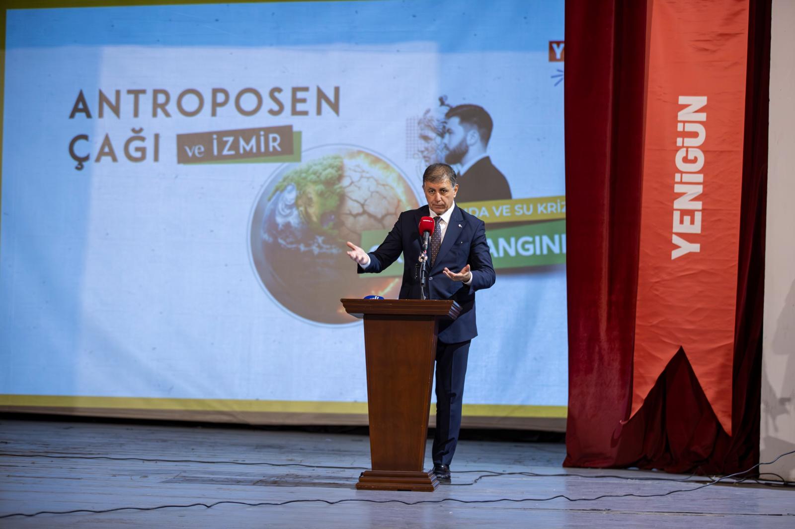 İzmir Büyükşehir Belediye Başkanı Dr. Cemil Tugay, Yenigün Gazetesi tarafından düzenlenen “Antroposen Çağı ve İzmir” söyleşisine katıldı. Gıda, su krizi, orman yangınlarının ele alındığı söyleşide konuşan Başkan Dr. Cemil Tugay, “Herkesi kapsayan, çözümler üreten siyaset yapmak zorundayız. İnsanlara, canlılara değer veren, dünyanın dengesini, ekosistemini bozmamayı amaçlayan yeni dünya düzenini konuşmalıyız. Bunu değiştirmenin yolu insanların kurduğu sistemin değişmesidir. O sistemi değiştirecek olan da düşünen beyinlerdir” dedi.