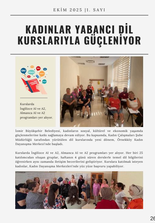 İzmir Büyükşehir Belediyesi, özellikle gençler ve çocuklar için sosyal, kültürel ve eğitimsel fırsatlar sunarken, kadınlar için de sağlık, istihdam ve kişisel gelişim alanlarında birçok etkinlik düzenliyor. Dünya Kız Çocukları Günü kutlamalarından, kadınlara yönelik sağlık seminerlerine, gençlere yönelik dijital eğitimlerden halk oyunları kurslarına kadar farklı alanlardaki hizmetler, İzmir'in sosyal dokusunu güçlendiriyor. Aylık yayımlanan bülten hizmetlere ilişkin farkındalığı ve katılımı artırmayı hedefliyor.