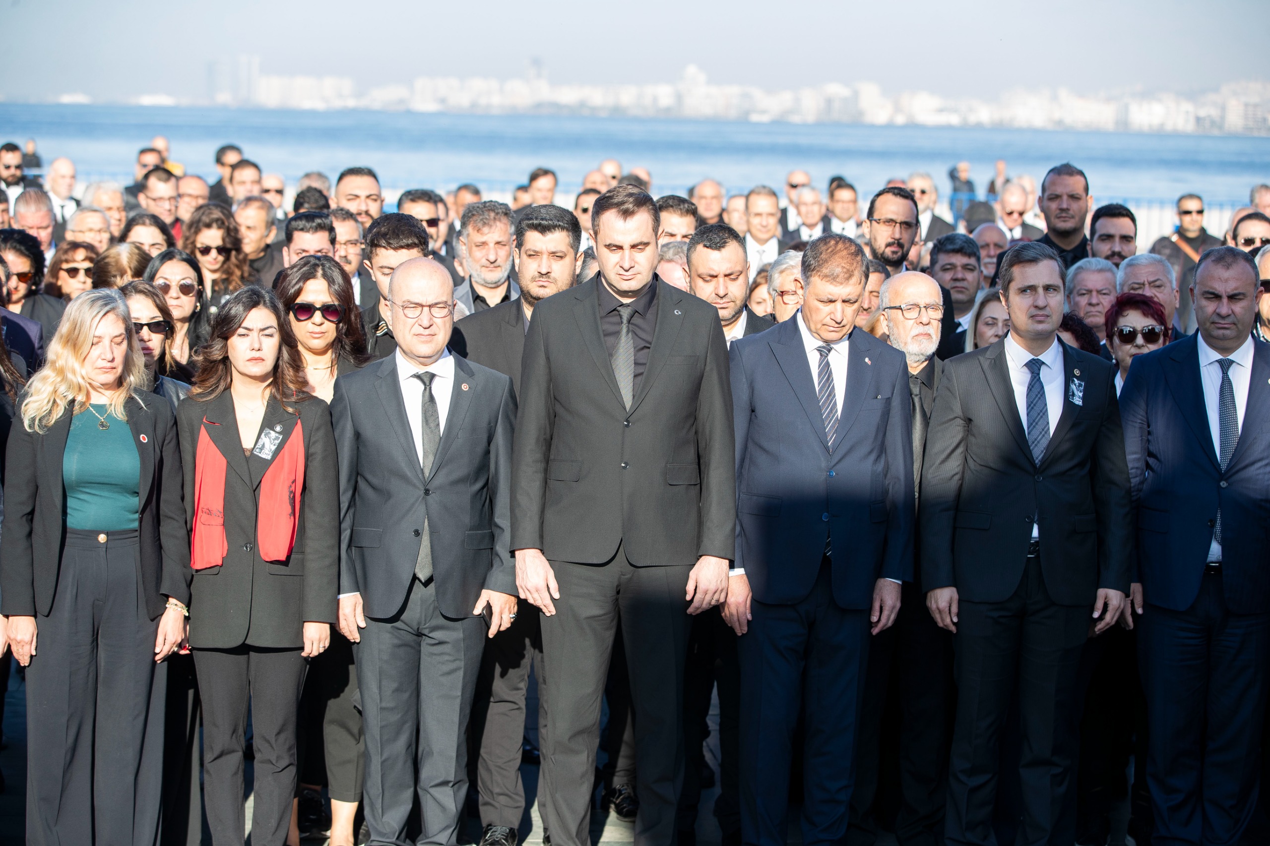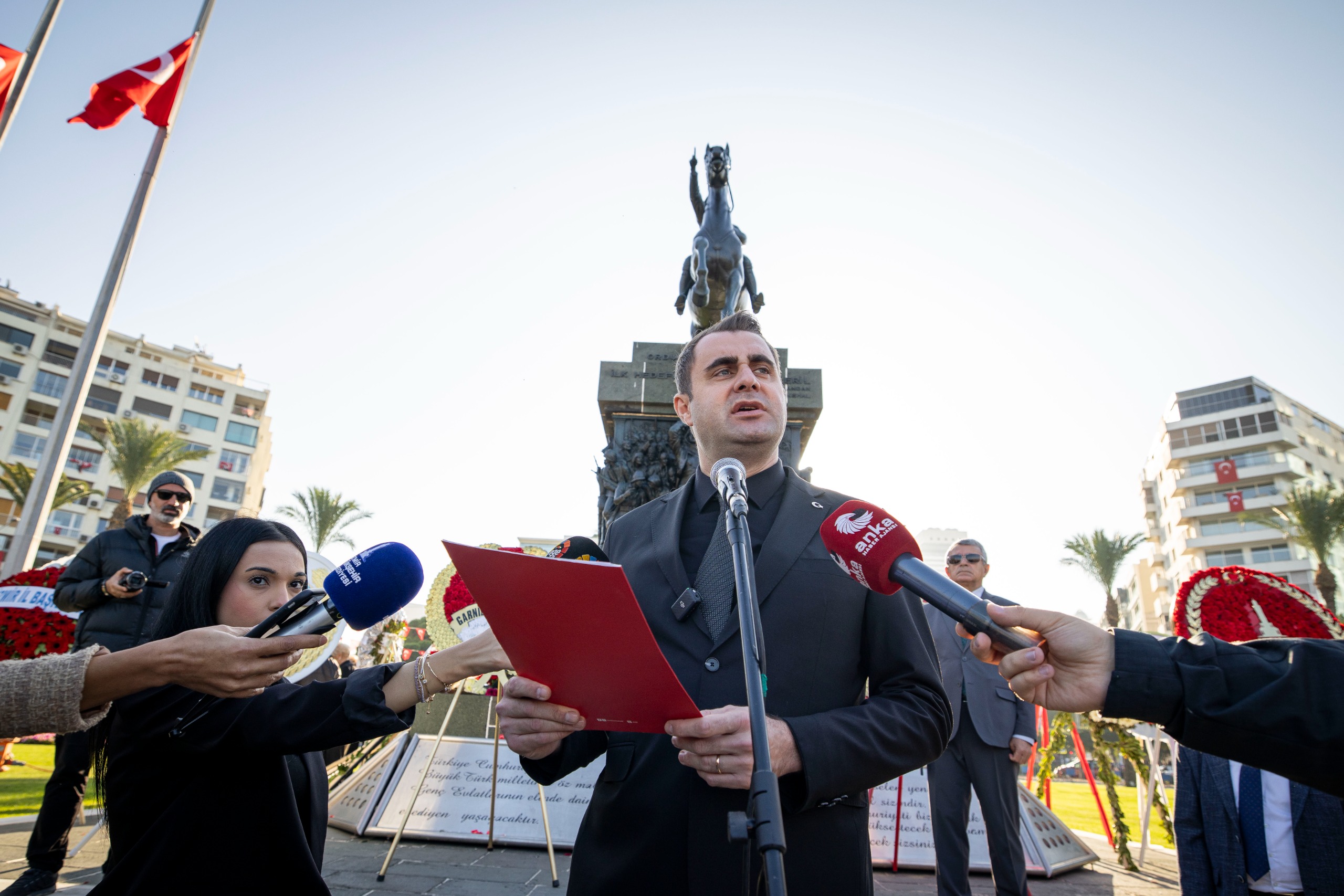 Saygı duruşunda bulunulması ve İstiklal Marşı’nın okunmasının ardından Atatürk Anıtı’na çelenk sunuldu. Törende bir konuşma yapan CHP İzmir İl Başkanı Çağatay Güç, bugün burada, bir milletin kaderini değiştiren, umutsuzluğu umuda çeviren, yoksul bir halktan onurlu bir Cumhuriyet yaratan büyük lider Gazi Mustafa Kemal Atatürk’ü anmak için toplandıklarını söyledi. Güç, “Atatürk yalnızca bir komutan, bir devlet kurucusu değil; ulusuna özgüven kazandıran, çağdaşlaşmanın yolunu açan, bilimi, aklı ve hür düşünceyi bir milletin pusulası haline getiren bir devrimcidir. Onun önderliğinde bu ülke, yokluk içinden çıkıp bağımsızlığına kavuştu, çağdaş dünyayla eşit bir seviyeye gelme iradesi kazandı, yurttaşlık bilincini, laikliği, hukuku ve fırsat eşitliğini temel alan bir devlet düzeni kurdu” dedi.