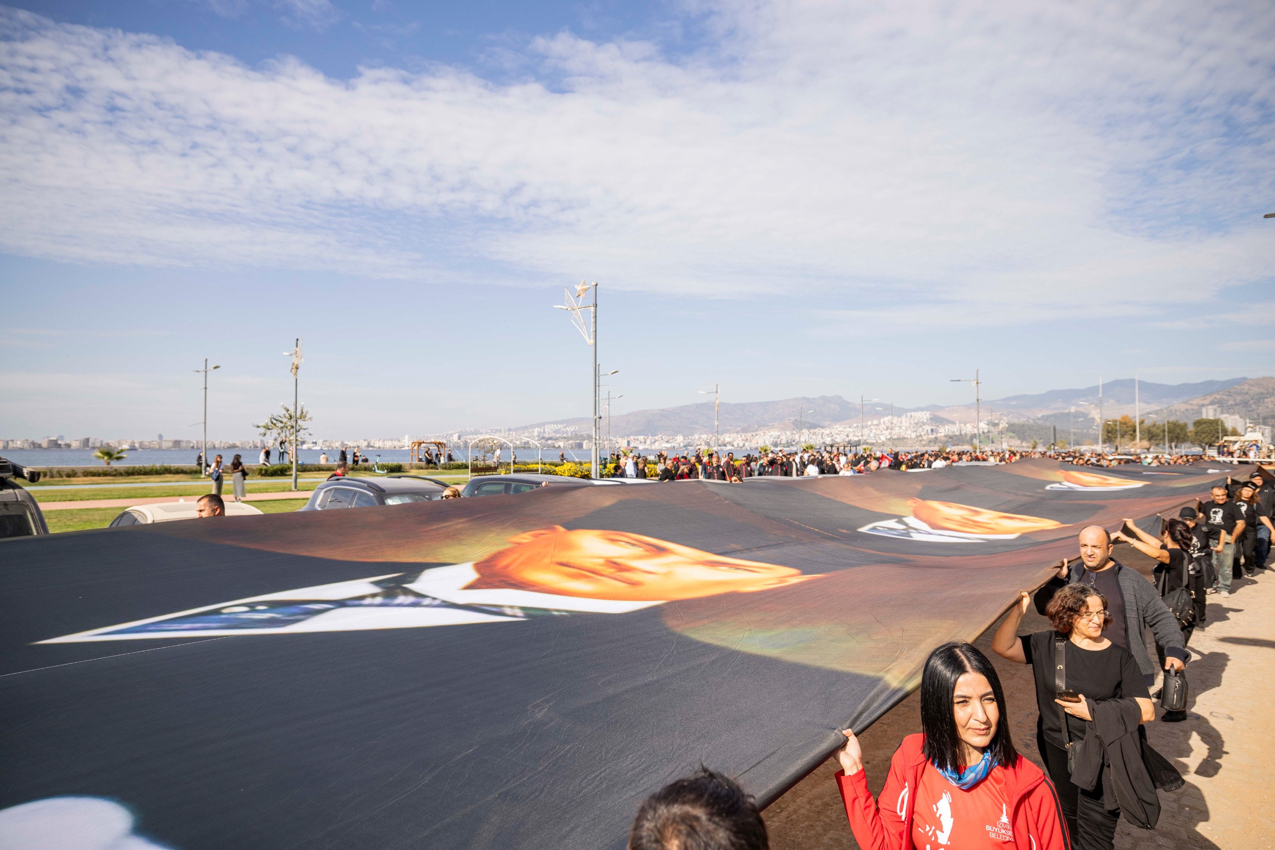 Türkiye Cumhuriyeti’nin kurucusu Ulu Önder Gazi Mustafa Kemal Atatürk, aramızdan ayrılışının 87. yılında çok sayıda etkinlikle anılıyor. Bu kapsamda 350 metrelik dev Atatürk posteri ile “Ata’ya Saygı Yürüyüşü” düzenlendi. İzmir Büyükşehir Belediyesi Başkan Vekili Dr. Zafer Levent Yıldır, CHP İzmir Milletvekili Ednan Arslan, CHP İzmir İl Başkanı Çağatay Güç, İzmir Büyükşehir Belediye Meclisi CHP Grup Başkanvekili Altan İnanç, İzmir Büyükşehir Belediye Meclisi CHP Grup Sözcüsü Yağmur Yurdakul Özkan, Selçuk Belediye Başkanı Filiz Ceritoğlu Sengel, Bornova Belediye Başkanı Ömer Eşki, Gaziemir Belediye Başkanı Ünal Işık, Foça Belediye Başkanı Saniye Bora Fıçı, siyasi parti temsilcileri, spor kulüplerinin sporcuları, sivil toplum kuruluşları, odalar, derneklerin başkanları ile temsilcileri ve vatandaşlar katıldı.