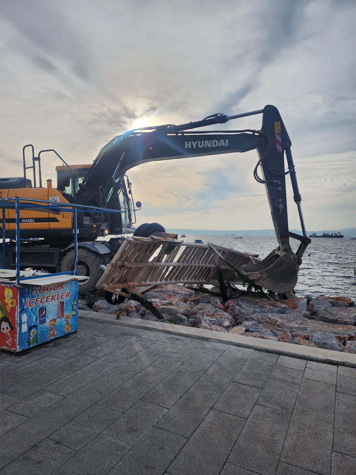 İzmir Büyükşehir Belediyesi, Karşıyaka sahilinde Kıyı ve İmar Kanunu’na aykırı şekilde inşa edilen izinsiz platform ve ahşap iskelelerin yıkımına başladı.