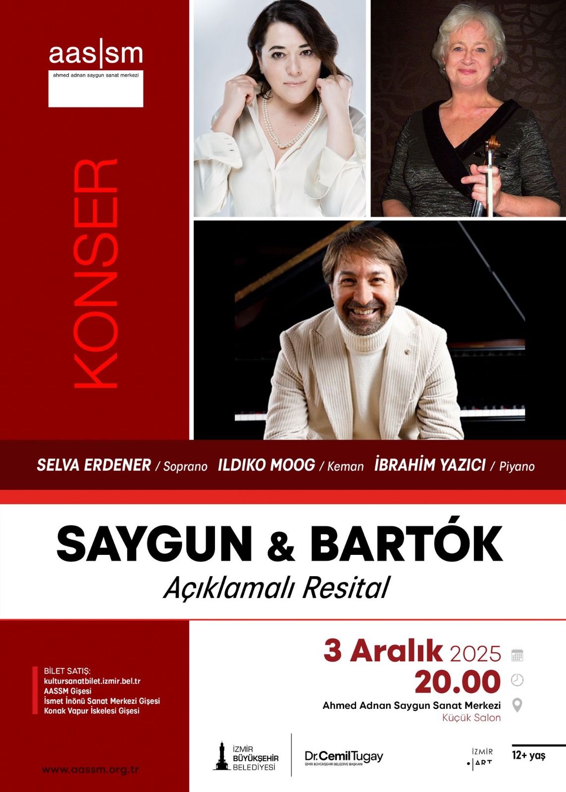 Saygun&Bartók Açıklamalı Resital, 3 Aralık’ta Küçük Salon’da saat 20.00’de başlayacak. 20. yüzyılın iki büyük bestecisi Béla Bartók ve Ahmed Adnan Saygun’un halk müziğini evrensel müzikle buluşturan yolculuğu, Selva Erdener (soprano), Ildiko Moog (keman) ve İbrahim Yazıcı’nın (piyano) sahnede olacağı bu özel resital ve anlatımla sahneye taşınıyor. Biletler, kultursanatbilet.izmir.bel.tr adresi üzerinden alınabiliyor. İzmir Devlet Senfoni Orkestrası, şef Alessandro Cedrone ve soprano Hyesang Park ile 5 Aralık’ta Büyük Salon’da olacak. Bilet satışlarının biletinial.com üzerinden yapıldığı konser, saat 20.00’de başlayacak.