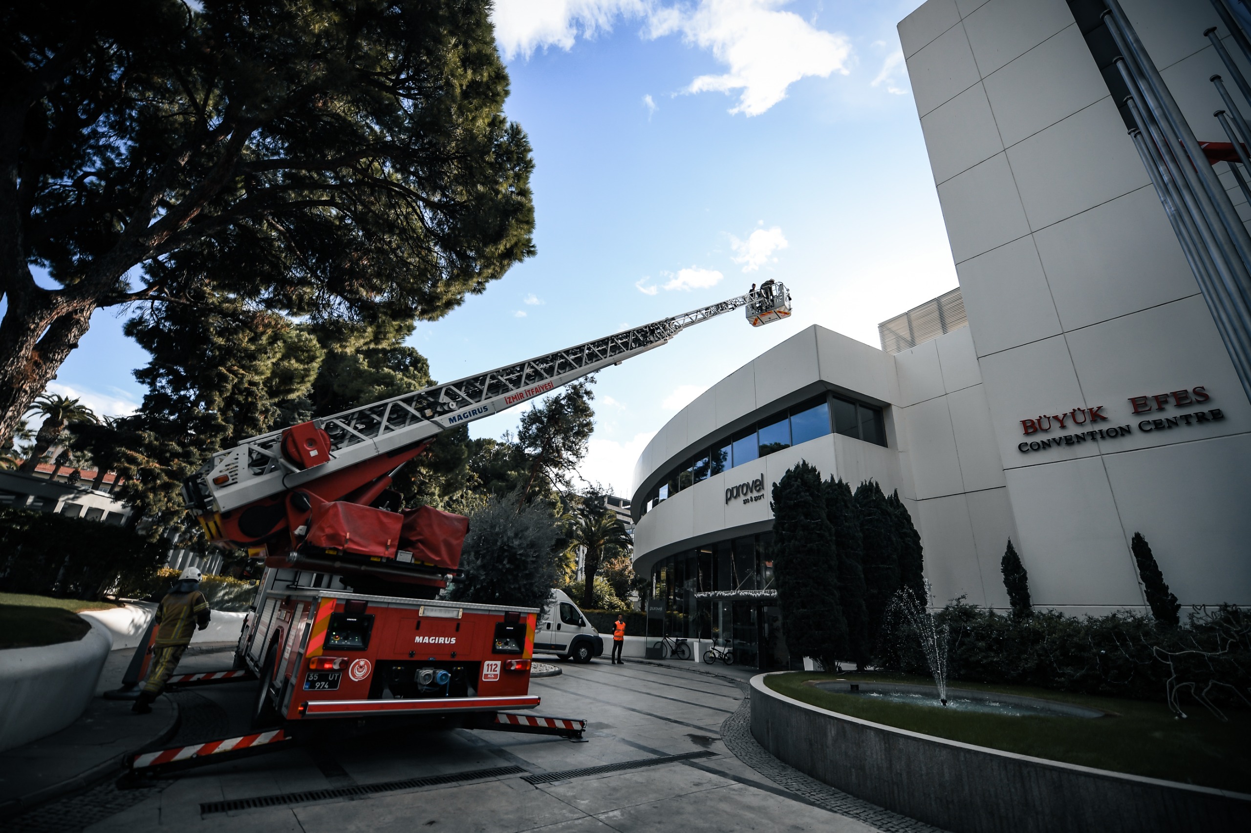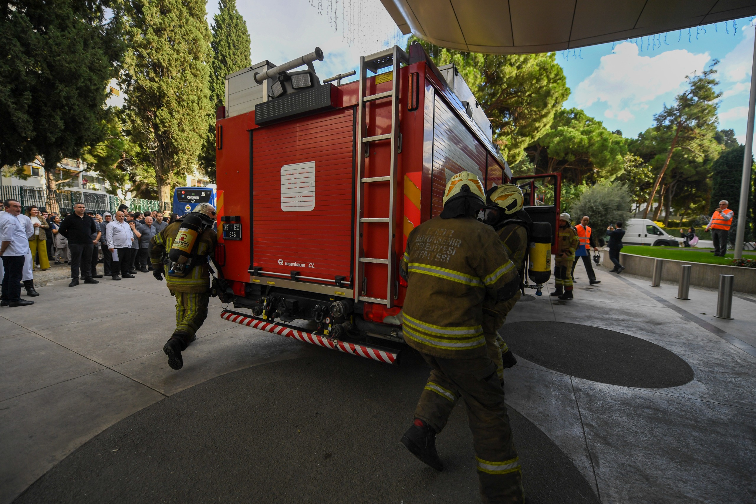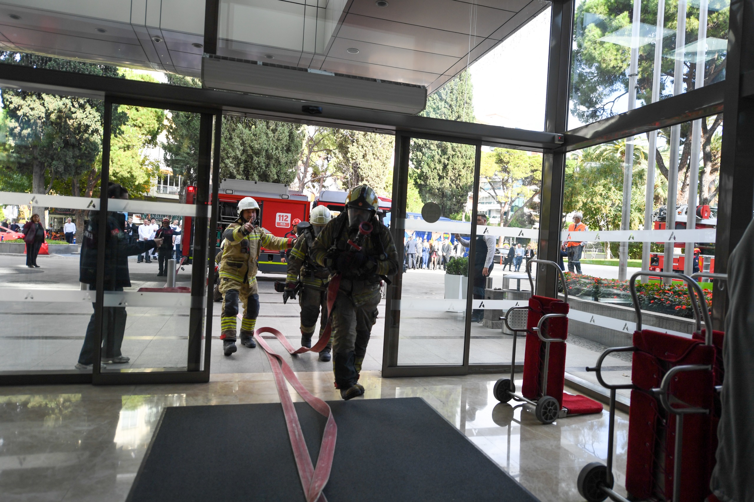 İzmir’in Konak ilçesine bağlı Alsancak Mahallesi Gazi Osman Paşa Bulvarı üzerinde bulunan Swissotel Büyük Efes’te, İzmir Büyükşehir Belediyesi İtfaiye Dairesi Başkanlığı ekipleri yangın ve tahliye tatbikatı düzenlendi. Otel personelinin olası acil durumlara hazırlık seviyesini artırmayı amaçlayan tatbikat senaryosuna göre, yedi katlı binanın giriş katındaki toplantı ve konferans salonunda belirlenemeyen bir nedenle yangın çıktı. Yangın alarmının devreye girmesiyle birlikte otelin acil durum ekipleri 112 Acil Çağrı Merkezi’ne ihbarda bulundu ve yangına ilk müdahaleyi gerçekleştirdi. Bu sırada otel içinde bulunan personel ve misafirler tahliye prosedürlerine uygun şekilde binadan dışarı çıkarıldı. İhbar üzerine kısa sürede bölgeye ulaşan itfaiye ekipleri ise hızla büyüyen alevleri kısa sürede kontrol altına aldı. Otelin üst katlarında mahsur kalan bir otel personeli ise itfaiye ekipleri tarafından merdivenli araç kullanılarak güvenli bir şekilde tahliye edildi.