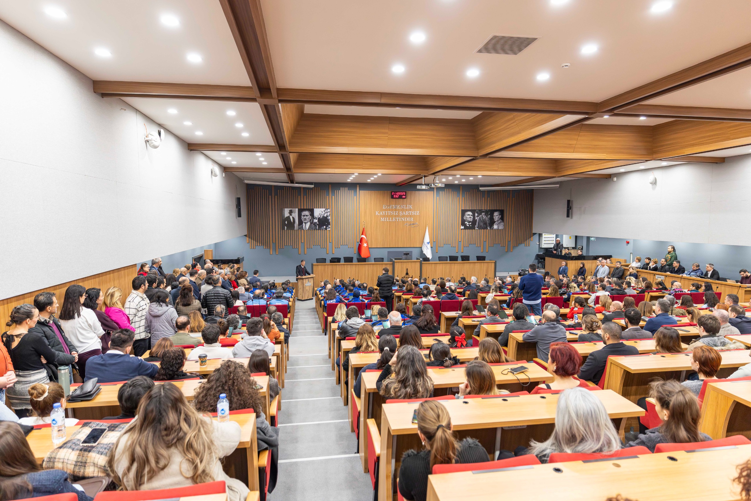 Üst yönetime de özverili çalışmaları için teşekkür eden Başkan Tugay, yönetim kültürü değişimlerinin hizmet kalitesine olan yansımasını anlattı. Tugay, “Rica ettim; 'Makam odalarınızı bırakıp açık ofiste çalışır mısınız' dedim. Hiçbiri itiraz etmedi, herkes konforundan vazgeçti ve şimdi bir arada çalışmanın keyfini yaşıyoruz. İletişim kolaylaşınca işler daha iyi yürüyor; bu durum, daha iyi işleyen bir idari yapının tüm çalışma arkadaşlarımıza olumlu yansımasını sağlıyor. 2026 yılına giriyoruz; ancak bu yıla dar bir bakış açısıyla bakmamalıyız. Dünyanın nereye gittiğini, Türkiye’nin içinde bulunduğu durumu, şehrimizin çağa ne kadar ayak uydurduğunu ve nasıl bir gelecek hayal ettiğini hepimizin düşünmesi gerekiyor. Bir şeyler yaparsanız dünya değişecek, her şey daha iyi olacak. Belki de bütün dünyaya ilham verecek işlere imza atacaksınız. Bu mümkün; benim desteğim her zaman sizinle, yeter ki buna inanın ve gayret gösterin” şeklinde konuştu.