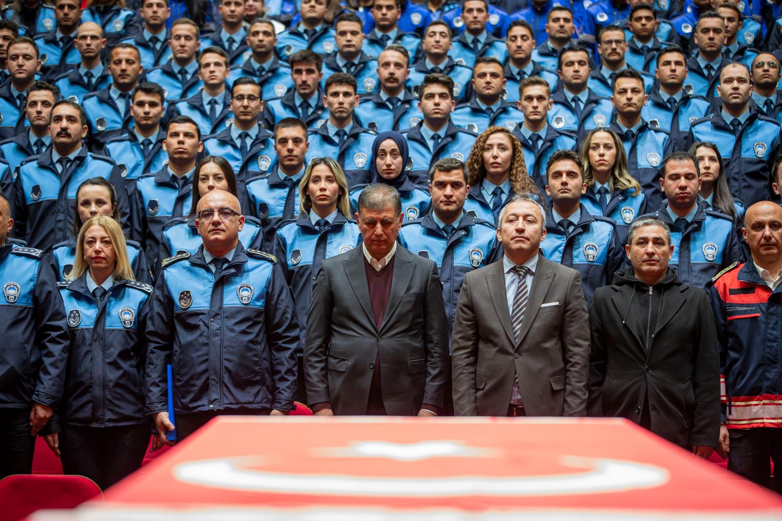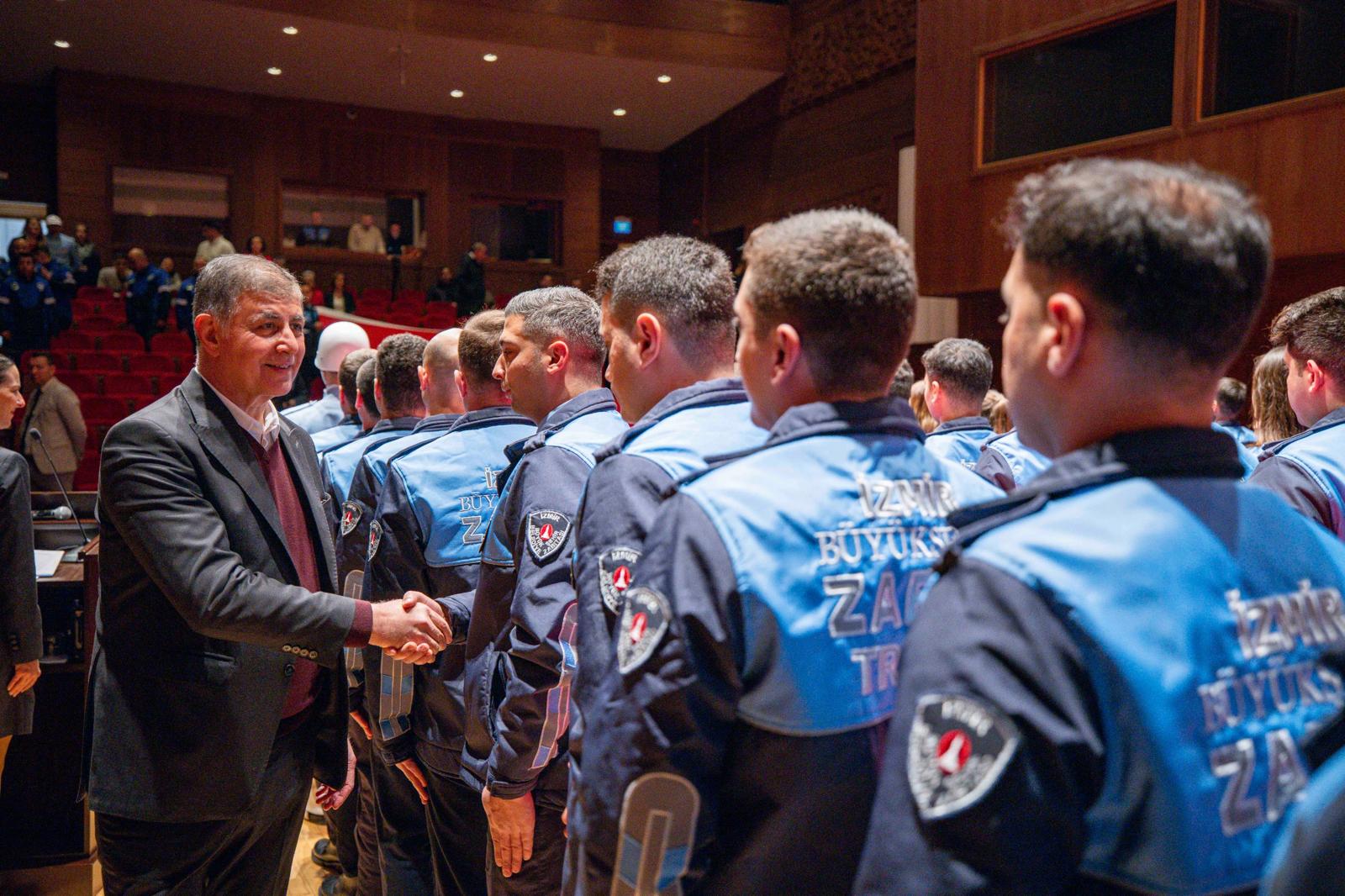 İzmir Büyükşehir Belediye Başkanı Dr. Cemil Tugay, kentin her noktasında daha hızlı, etkin ve güven veren bir zabıta hizmeti sunma hedefiyle teşkilata katılan 86 yeni memur için düzenlenen yemin törenine katıldı. Tugay, yeni memurları tebrik ederek “Her zaman haklının ve doğrunun yanında yer almamız lazım. Üstlendiğiniz bu sorumlulukla sadece İzmir değil Türkiye’ye örnek bir dönemi hep birlikte yaşayalım” dedi.