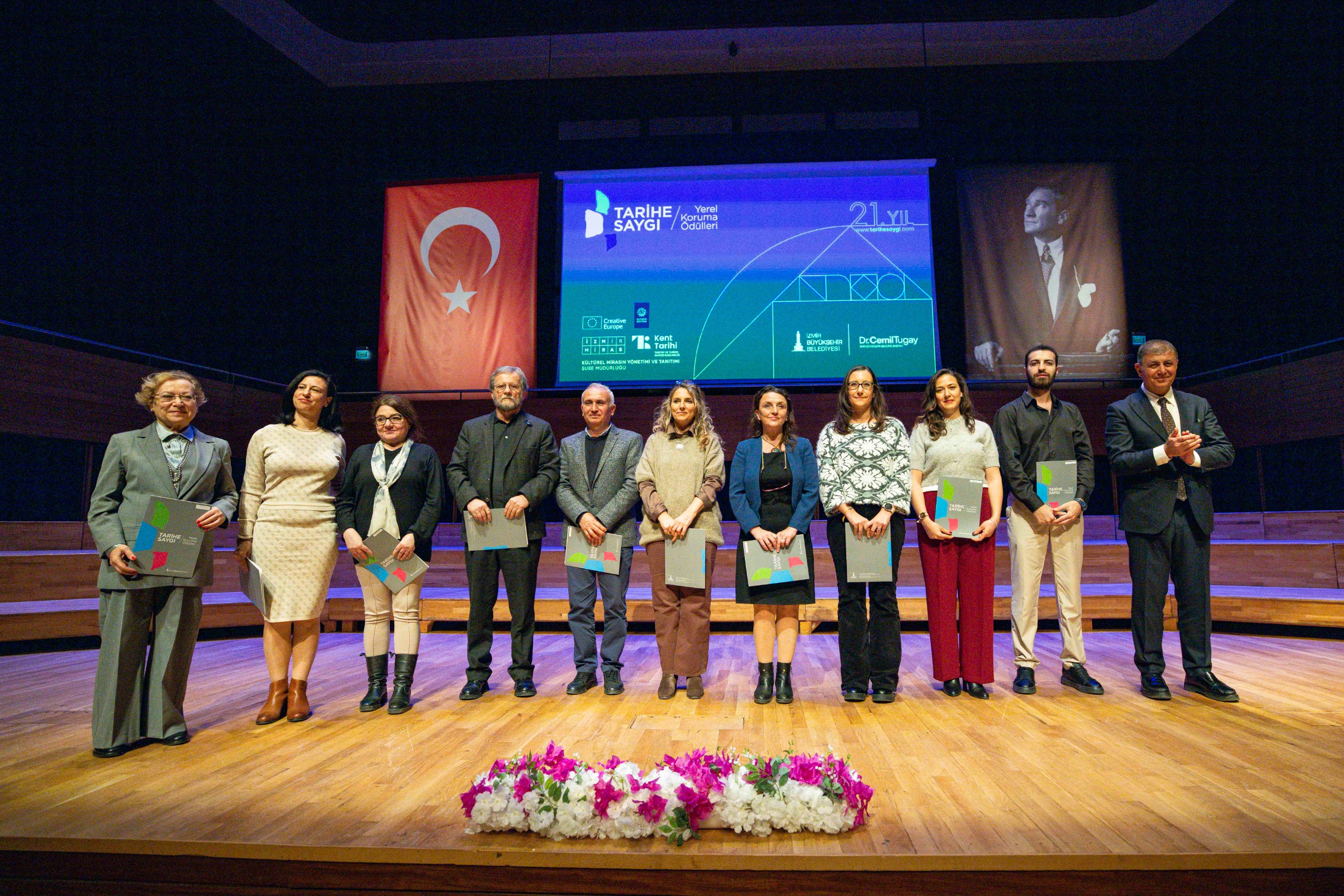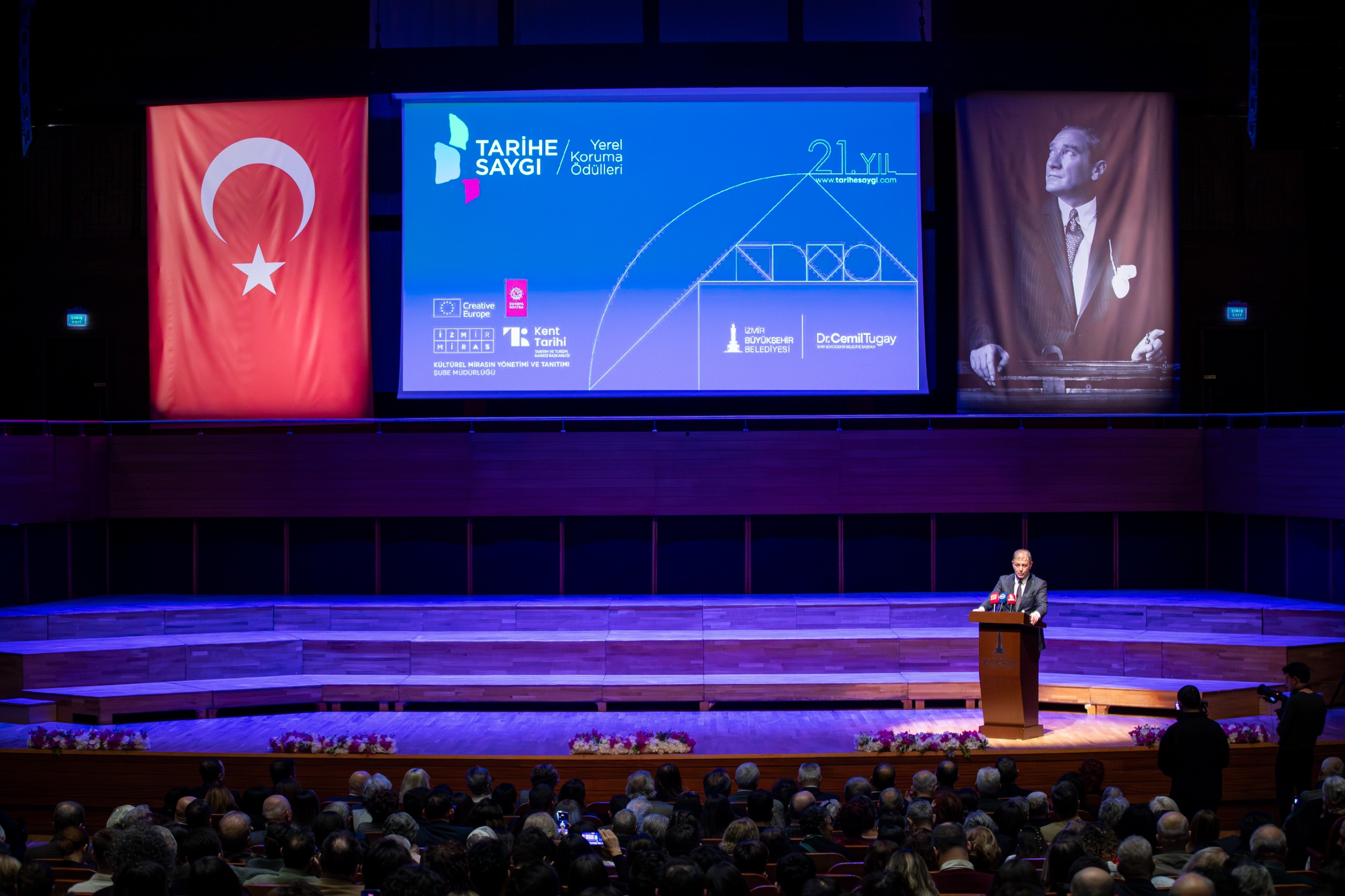 İzmir Büyükşehir Belediyesi’nin kentteki tarihi yapıların korunması, onarılması, kentsel ve yerel koruma bilincinin oluşturulması amacıyla düzenlediği Tarihe Saygı Yerel Koruma Ödülleri sahiplerini buldu. Bu yıl 21’inci kez düzenlenen Tarihe Saygı Yerel Koruma Ödülleri’ni kazananlar, İzmir Büyükşehir Belediye Başkanı Dr. Cemil Tugay'ın ev sahipliğinde yapılan törenle onurlandırıldı. Başkan Tugay, “İzmir’in geçmişine saygı duyan, geleceğini önemseyen tüm yurttaşlarımızla birlikte bu yolu kararlılıkla yürümeye devam edeceğiz” dedi.