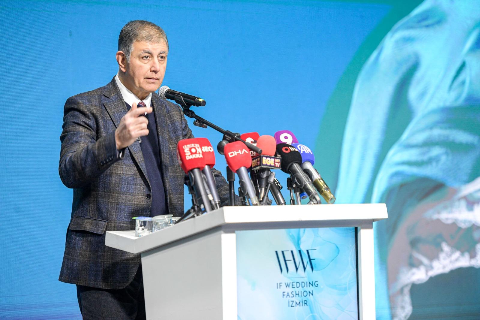 Açılış töreninde konuşan İzmir Büyükşehir Belediye Başkanı Dr. Cemil Tugay, IF Wedding Fashion İzmir ile birlikte İzmir’in emeğini, tasarım gücünü ve 19 yıldır ilmek ilmek işlenen bir başarı öyküsünü hep birlikte kutladıklarını bildirdi. Moda ve hazır giyim sektörünün dünyada kabuk değiştirdiğini, sadece üretmenin yetmediğini aktaran Başkan Tugay, tasarım, özgünlük ve yaratıcılığın asıl katma değeri belirlediğini söyledi. Başkan Tugay, “Rakamlar çok açık; küresel düğün kıyafetleri pazarı 80 milyar doları aşmış durumda ve kısa sürede 100 milyar dolarlık bir dev haline gelecek. Türkiye genel ihracatta zorlu bir dönemden geçiyor. Bu durum, tüm dünyada ticaret savaşlarının yarattığı bir tablo olabilir. Ancak bu darboğazdan çıkış yolumuz, tam da bu salonda gördüğümüz tablodur. Türkiye’nin ortalama ihraç birim fiyatı 1,6 dolar iken, Ege Hazır Giyim ve Konfeksiyon İhracatçıları Birliği üyelerimizin ortalaması 21 doların üzerine çıkıyor. Gelinlik ve abiye söz konusu olduğunda ise bu rakam kilogram başına 100 dolara ulaşıyor. İşte aradığımız formül budur: Katma değer. Katma değer, tasarımın, emeğin ve estetiğin olduğu yerde yükselir” diye konuştu.