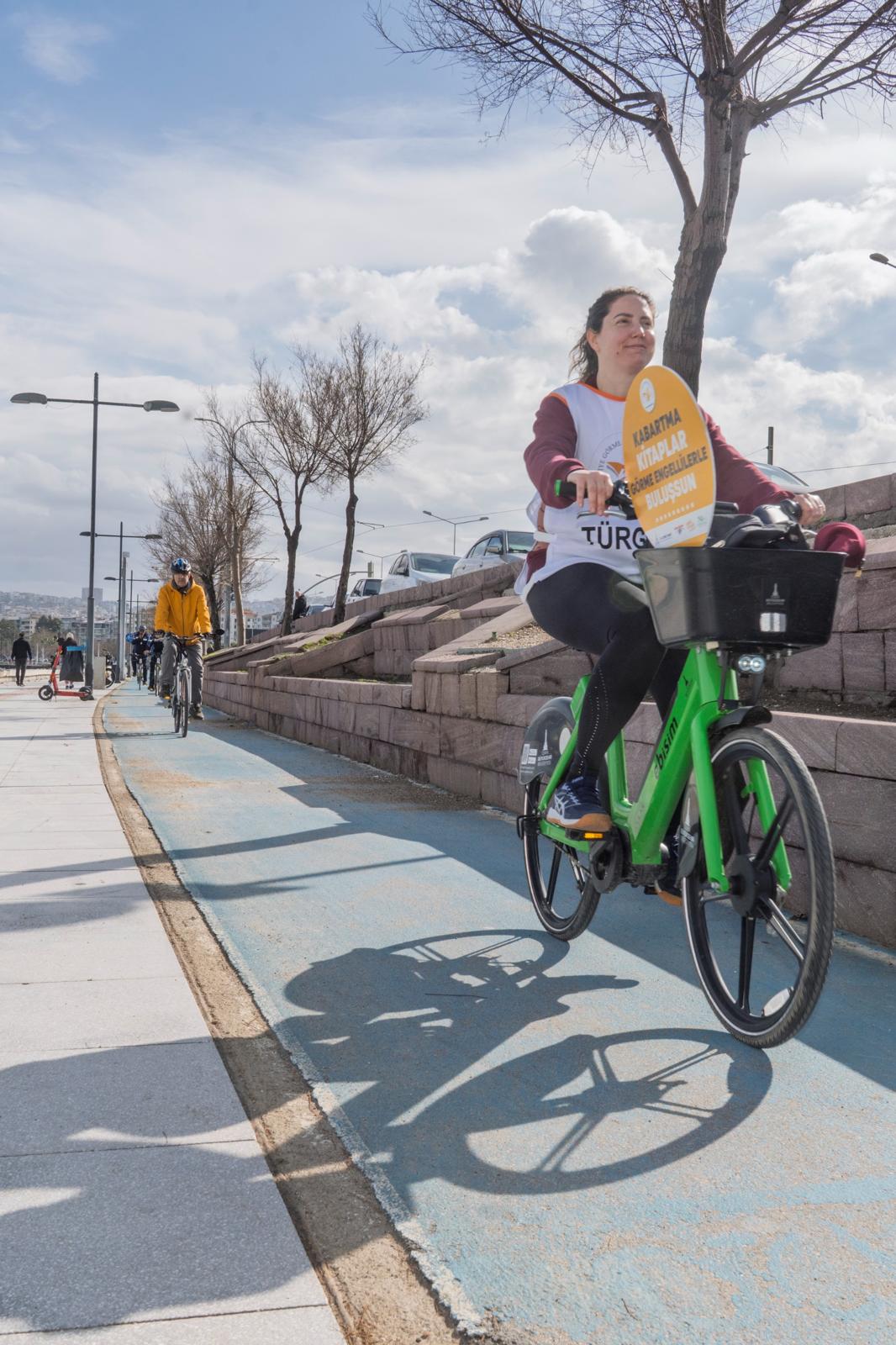 İzmir Büyükşehir Belediyesi ile Türkiye Görme Özürlüler Kitaplığı (TÜRGÖK) iş birliğinde, görme engelli bireylerin kabartma kitaplara erişimine dikkat çekmek ve toplumsal farkındalığı artırmak amacıyla Bostanlı Yasemin Kafe ile İnciraltı Engelliler Parkı arasında bisiklet sürüşü düzenlendi. Beyaz Baston Görme Engelliler Haftası kapsamında gerçekleştirilen etkinlik, “Görmeyenler Daha Çok Kabartma Kitap Okusun Diye Umuda Pedal Çeviriyoruz” sloganıyla hayata geçirildi. Etkinliğe 100’e yakın bisikletli katıldı. Katılımcılar, www.maratonizmir.org adresi üzerinden kayıt yaptırarak Bostanlı Yasemin Kafe önünden başlayıp bisiklet yollarını takip ederek İnciraltı Engelliler Parkı’na kadar farkındalık sürüşü yaptı.