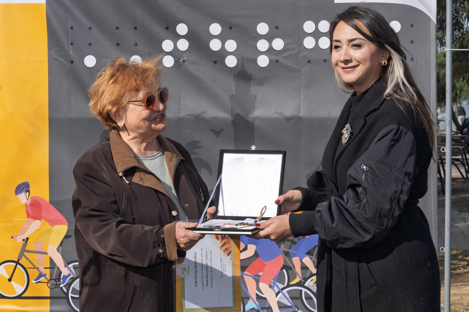 İki saat süren sürüşün ardından bisikletliler İnciraltı’nda toplandı. TÜRGÖK Yönetim Kurulu Başkanı Tülay Yazgan, İzmir Büyükşehir Belediye Meclisi Engelsiz İzmir Komisyonu Başkanı Semiha Memiş Saraç’a plaket ve teşekkür belgesi takdim etti.