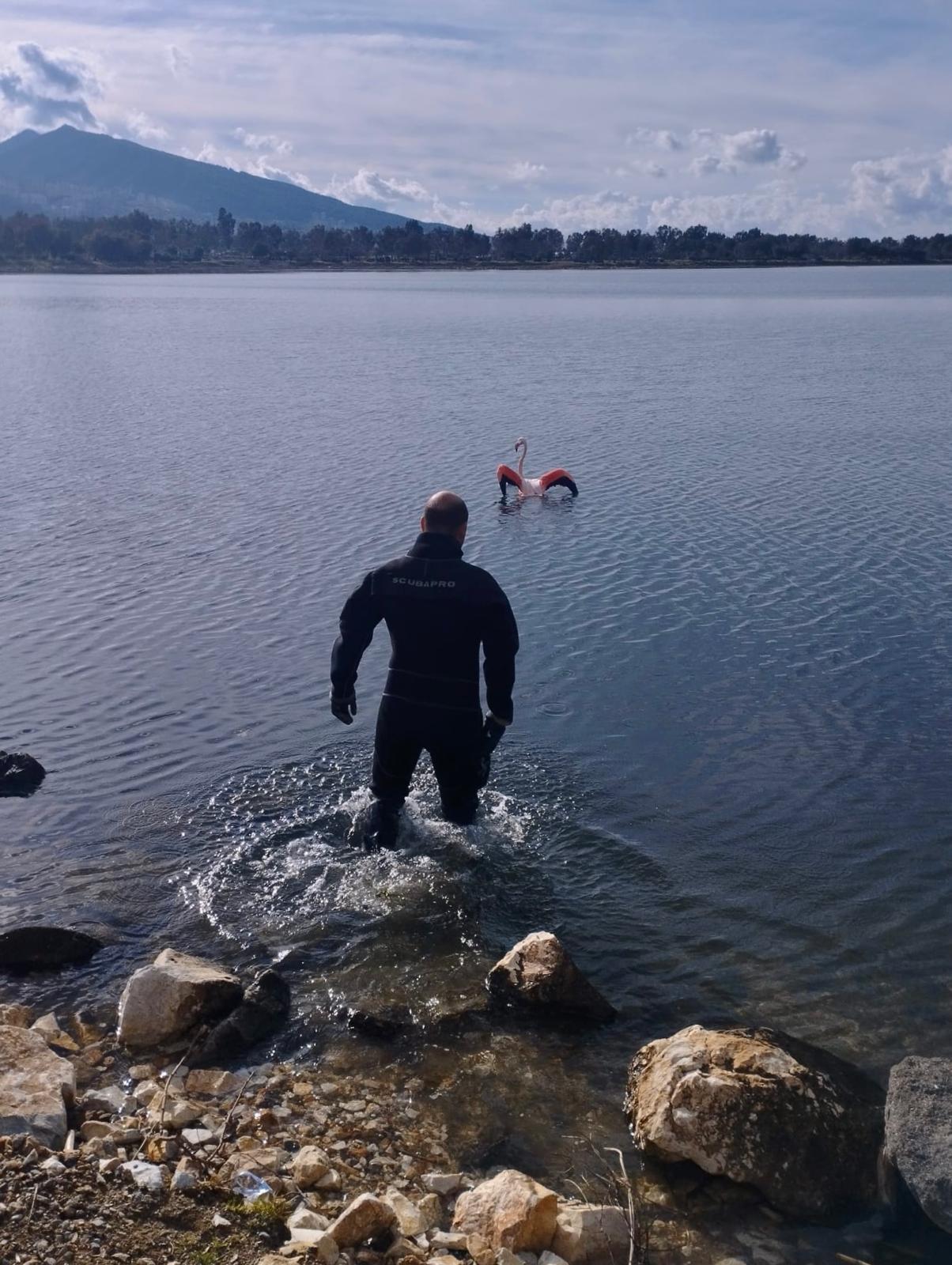 İzmir’in Balçova ilçesindeki İnciraltı Kent Ormanı’nda, vücuduna ip dolanan flamingo, İzmir İtfaiyesi dalgıçlarının yaklaşık 15 dakikalık müdahalesiyle kurtarılarak doğal yaşam alanına salındı.
