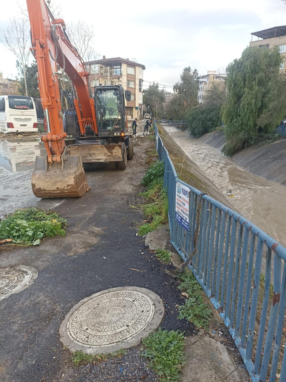 İzmir Büyükşehir Belediyesi Yol Yapım, Bakım ve Onarım Dairesi Başkanlığı, yağışın gece saatlerinde etkili olmaya başlamasıyla birlikte 4 ekip, 21 personel ve çok sayıda araçla sahada çalışma yürüttü. Menderes Sandı Çayı’nda iş makinesiyle menfez önü temizliği yapılarak gerekli güvenlik önlemleri alındı. Buca, Menderes ve Gaziemir’de yağış nedeniyle bozulan yollar hızla onarıldı. Konak Kocakapı Mahallesi’nde çöken taş istinat duvarına hızlı şekilde müdahale edildi. Karabağlar Kavacık Mahallesi’nde dere hattı üzerindeki 3 metrelik yolun kilit parke döşeli bölümünde meydana gelen heyelan nedeniyle kapanan yollar açıldı, göçük oluşan alanlarda set çekilerek müdahale gerçekleştirildi. Narlıdere Narbel’de yaşanan toprak kaymasına da müdahale edilerek gerekli güvenlik önlemleri alındı.