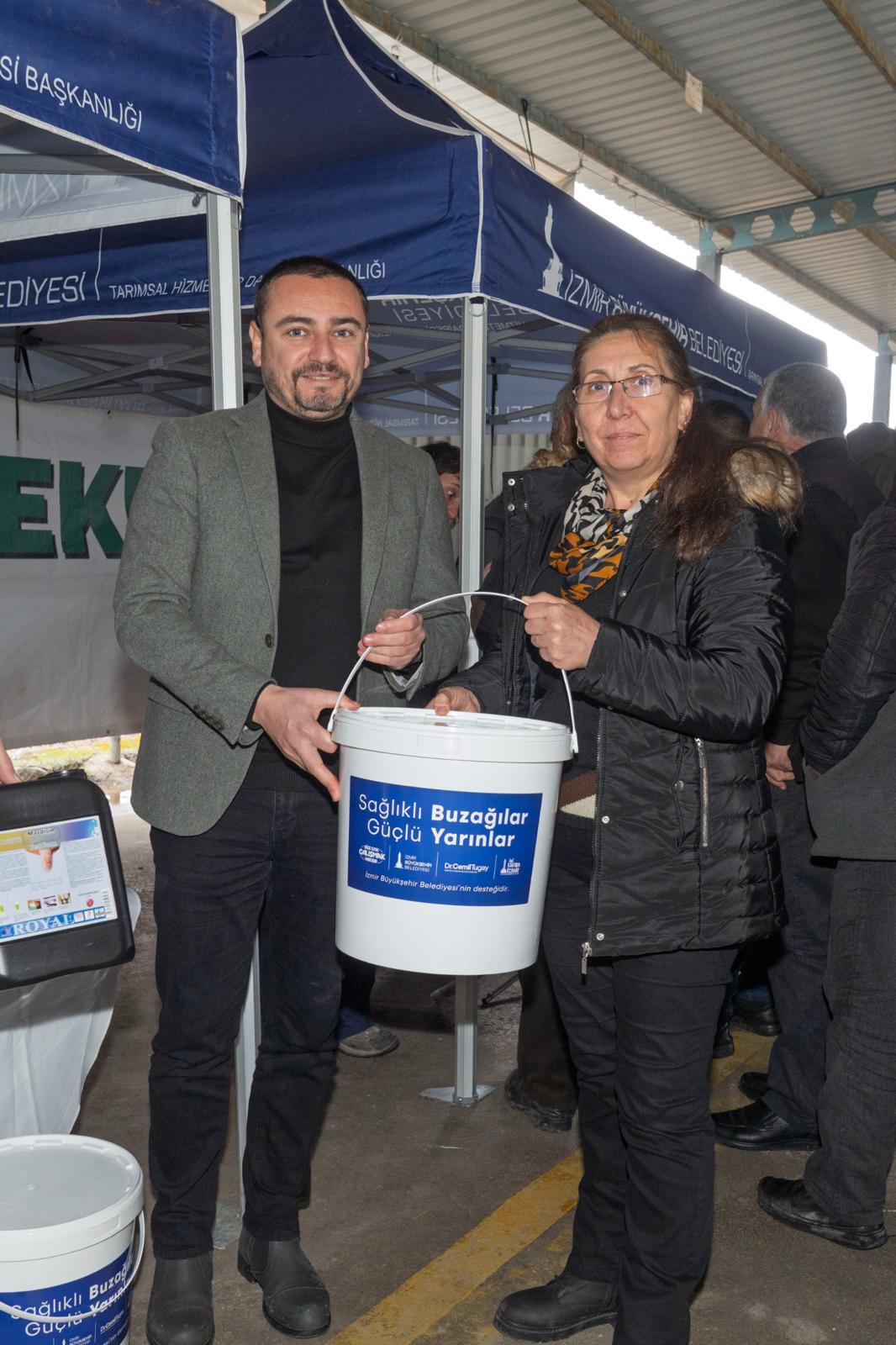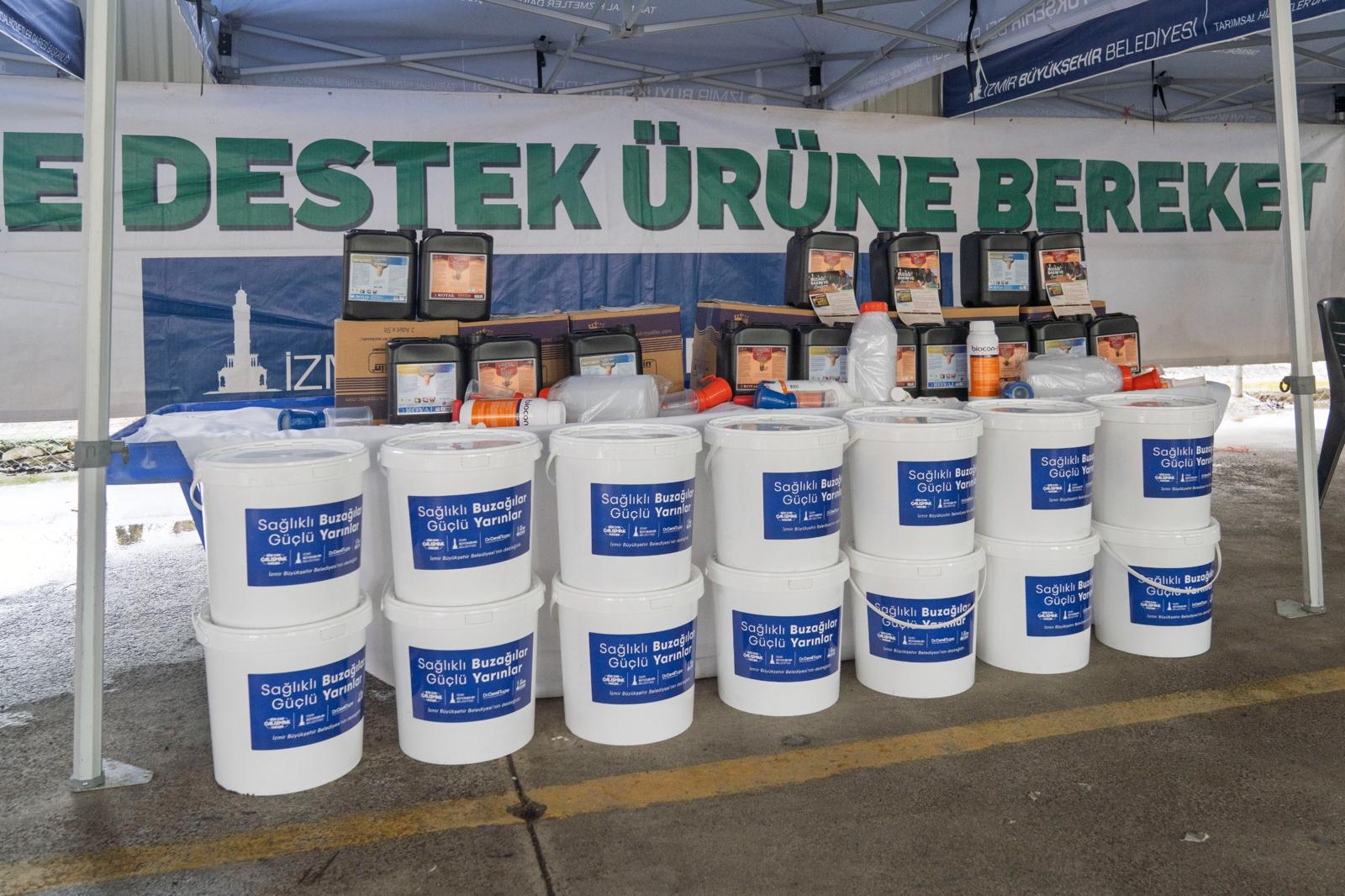 Kınık’ta başlatılan dağıtımlarda buzağıların hijyenini ve bağışıklığını artırmaya yönelik hazırlanan paketler çiftçilere ulaştırıldı. Hazırlanan kitlerde biberon, emzik, göbek klipsi, bağışıklık sistemini destekleyici ağız pastası, sağım öncesi ve sonrası meme daldırma kabı, meme dezenfektanı, kova ve toz dezenfektana yer verildi. Türkiye’nin süt üretiminde lider kenti İzmir’de, Beydağ, Bayındır, Ödemiş, Tire, Kiraz başta olmak üzere büyükbaş hayvancılığın yoğun olduğu ilçelerdeki toplam 3 bin 500 çiftçiye buzağı kiti desteği sağlandı.