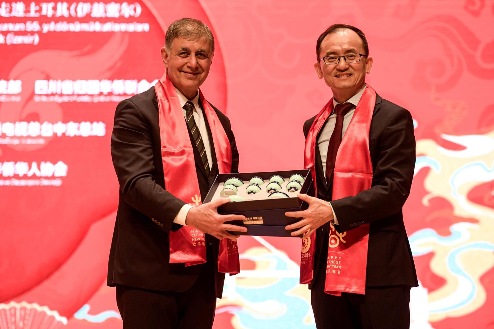 Çin Halk Cumhuriyeti ile Türkiye Cumhuriyeti arasındaki diplomatik ilişkilerin 55. yıl dönümü ve 2026 Çin Yeni Yılı, Ahmed Adnan Saygun Sanat Merkezi'nde düzenlenen özel bir etkinlikte kutlandı. “55 Yıllık Diplomatik Dostluk: Türkiye ve Çin – İzmir Buluşması” temalı geceye; İzmir Büyükşehir Belediye Başkanı Dr. Cemil Tugay, Çin Halk Cumhuriyeti’nin Ankara Büyükelçisi Jiang Xuebin, Sichuan Eyaleti Yurtdışı Çinliler Federasyonu Başkan Yardımcısı Huang Hao, İzmir Çinliler Yardımlaşma ve Dayanışma Derneği Başkanı Yağız Vang, Romanya Başkonsolosu Lilian Zamfiroiu, Kazakistan Başkonsolosu Bauyrzhan Akatayev, İzmir Büyükşehir Belediyesi Genel Sekreter Yardımcısı Prof. Dr. Pınar Okyay, bürokratlar, Çinli konuklar ve İzmirliler katıldı.