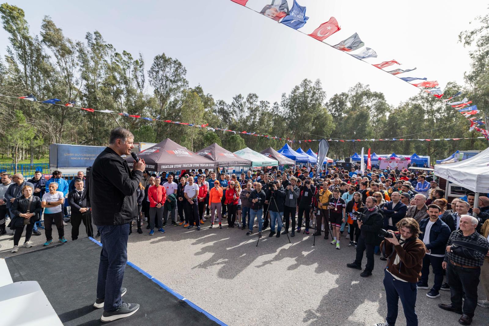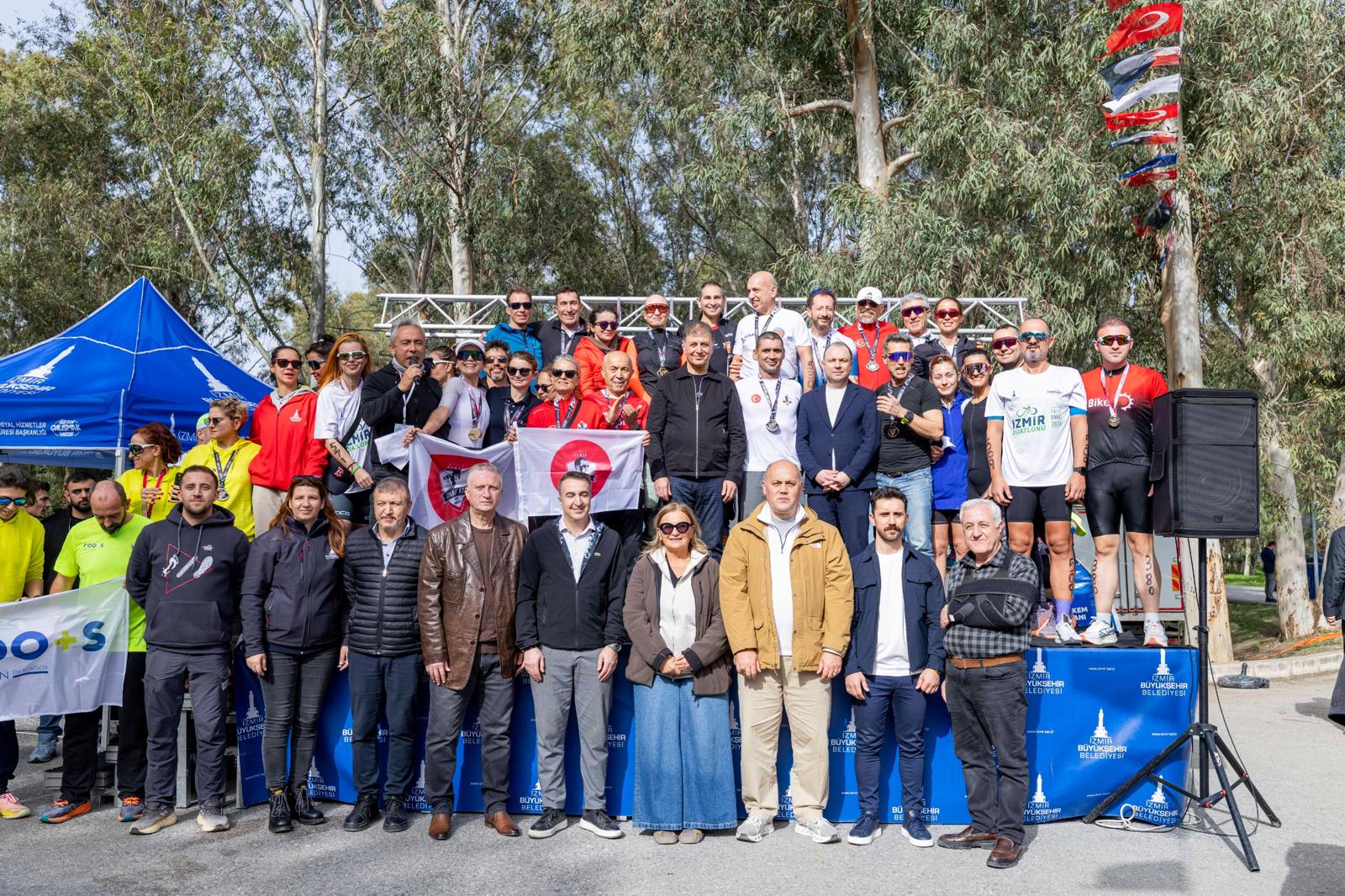 Türkiye’nin en yüksek katılımlı duatlonu olan yarışmada koşu ve bisiklet yarışı aynı parkurda ve aynı ritimde tamamlandı. Programda konuşan İzmir Büyükşehir Belediye Başkanı Dr. Cemil Tugay, kentte sporun gelişmesi adına önemli çalışmalar yaptıklarını belirtti. Böylesine güzel bir organizasyonda olduğu için mutluluk duyduğunu ifade eden Başkan Tugay, “İzmir’i spor açısından çok daha zengin organizasyonlar, tesisler, aktiviteler şehri yapmak için çalışıyoruz. Sizler de bugünkü yarışlarla bize destek verdiniz. Emeği geçen herkese teşekkür ediyorum. İyi ki varsınız. Bu zorlu yarışı bitirmeniz, madalya almanız hepimiz adına çok büyük gurur. Her zaman bu tür organizasyonlara ev sahipliği yapmaktan büyük onur duyacağız. Hepinizi tebrik ediyoruz” dedi.