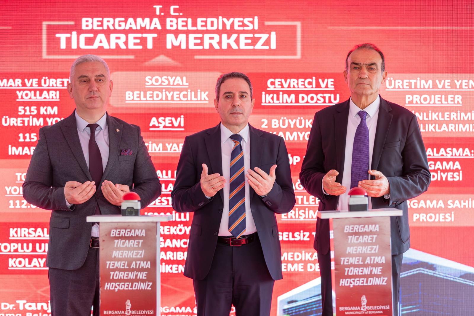 Bergama Belediyesi tarafından kent merkezinde yapılacak Bergama Ticaret Merkezi’nin temeli atıldı. UNESCO Dünya Mirası Listesi’nde yer alan Bergama’ya yeni bir dinamizm kazandırmayı amaçlayan yatırımın temel atma törenine İzmir Büyükşehir Belediyesi Başkan Vekili Dr. Zafer Levent Yıldır, Bergama Belediye Başkanı Prof. Dr. Tanju Çelik, Kınık Belediye Başkanı Sema Bodur ve Bergama Kaymakamı Avni Oral ile çok sayıda yurttaş katıldı.
