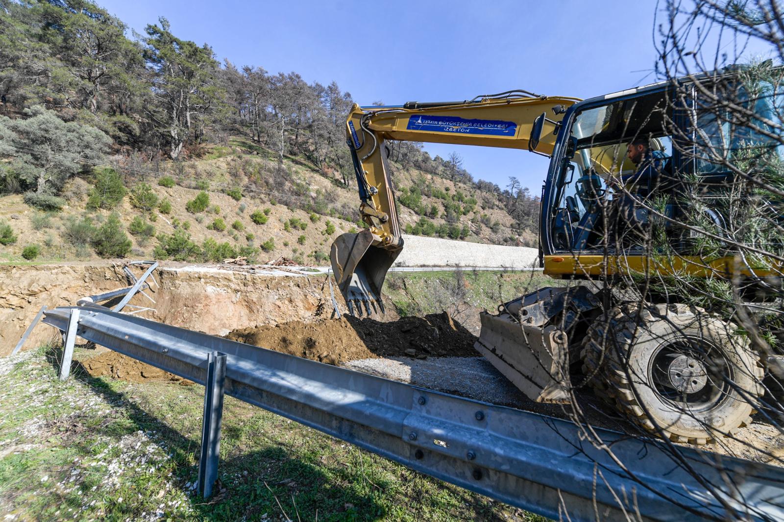 İzmir Büyükşehir Belediyesi, Ödemiş’te Çamyayla-Horzum yolunda orman yangınlarının ardından kesilen tomrukların yağışlar nedeniyle menfezi tıkaması sonucu çöken yolda onarım çalışmalarına başladı. Yoğun yağışta çökme riskini önceden tespit ederek can ve mal kaybını önleyen ekipler, alternatif güzergâh oluşturarak ulaşımın kesintiye uğramasını da engelledi. Menfez temizliği ve dolgu çalışmalarının ardından yol yenilenecek.