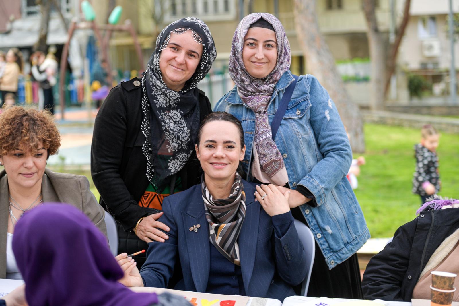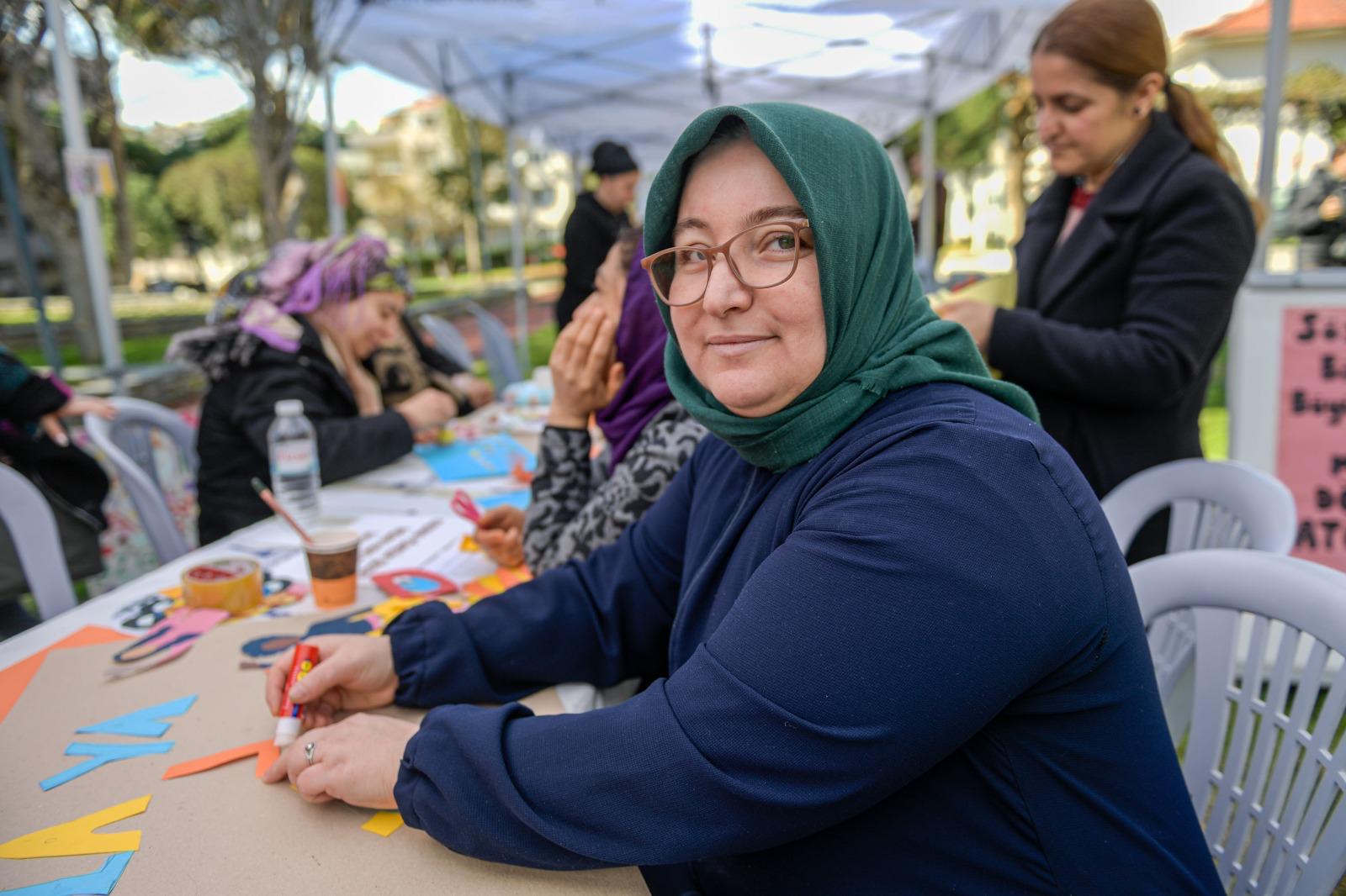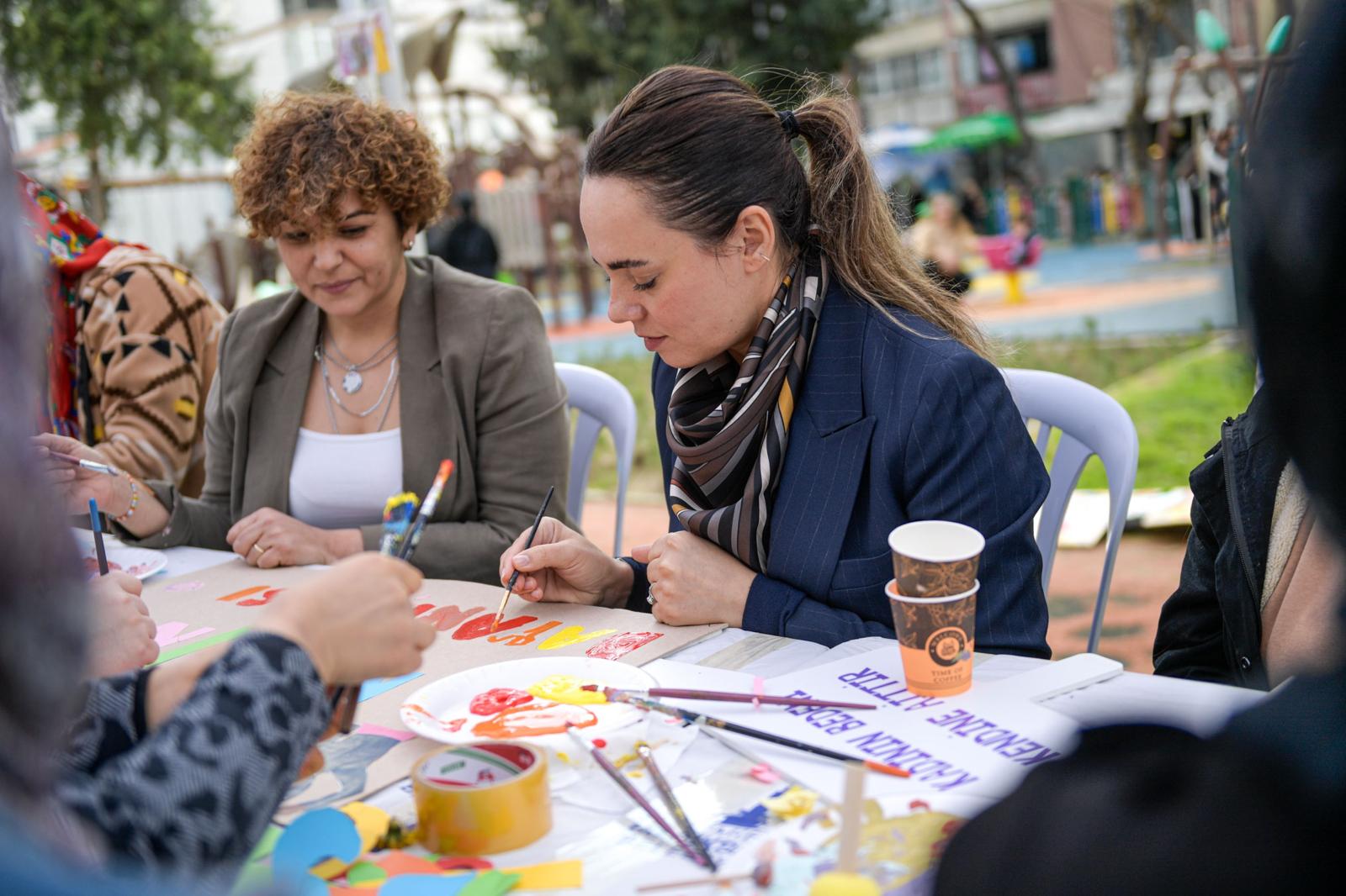 İzmir Büyükşehir Belediyesi Kadın ve Aile Hizmetleri Dairesi Başkanlığı Kadın Çalışmaları Şube Müdürlüğü, 8 Mart Dünya Kadınlar Günü kapsamında “8 Mart Dayanışma Noktaları” oluşturdu. Kadınlar, Kadifekale, Agora, Hatay ve Örnekköy’de bulunan kadın dayanışma merkezlerinde sunulan hizmetleri deneyimliyor, kadın sağlığı ve toplumsal cinsiyet eşitliği gibi konularda bilgilendiriliyor, 8 Mart’a özel pankart hazırlama etkinliklerine katılıyor. Çocuklar için de oyun etkinliklerinin hazırlandığı dayanışma noktaları, dayanışmayı güçlendirerek deneyim paylaşımına imkân tanıyor. İzmir Büyükşehir Belediye Başkanı Dr. Cemil Tugay’ın eşi Öznur Tugay, Behçet Uz Parkı’nda düzenlenen dayanışma noktasında kadınlarla bir araya geldi. 8 Mart Dünya Kadınlar Günü temalı pankartlar hazırlayan Tugay, kadınlarla sohbet etti.