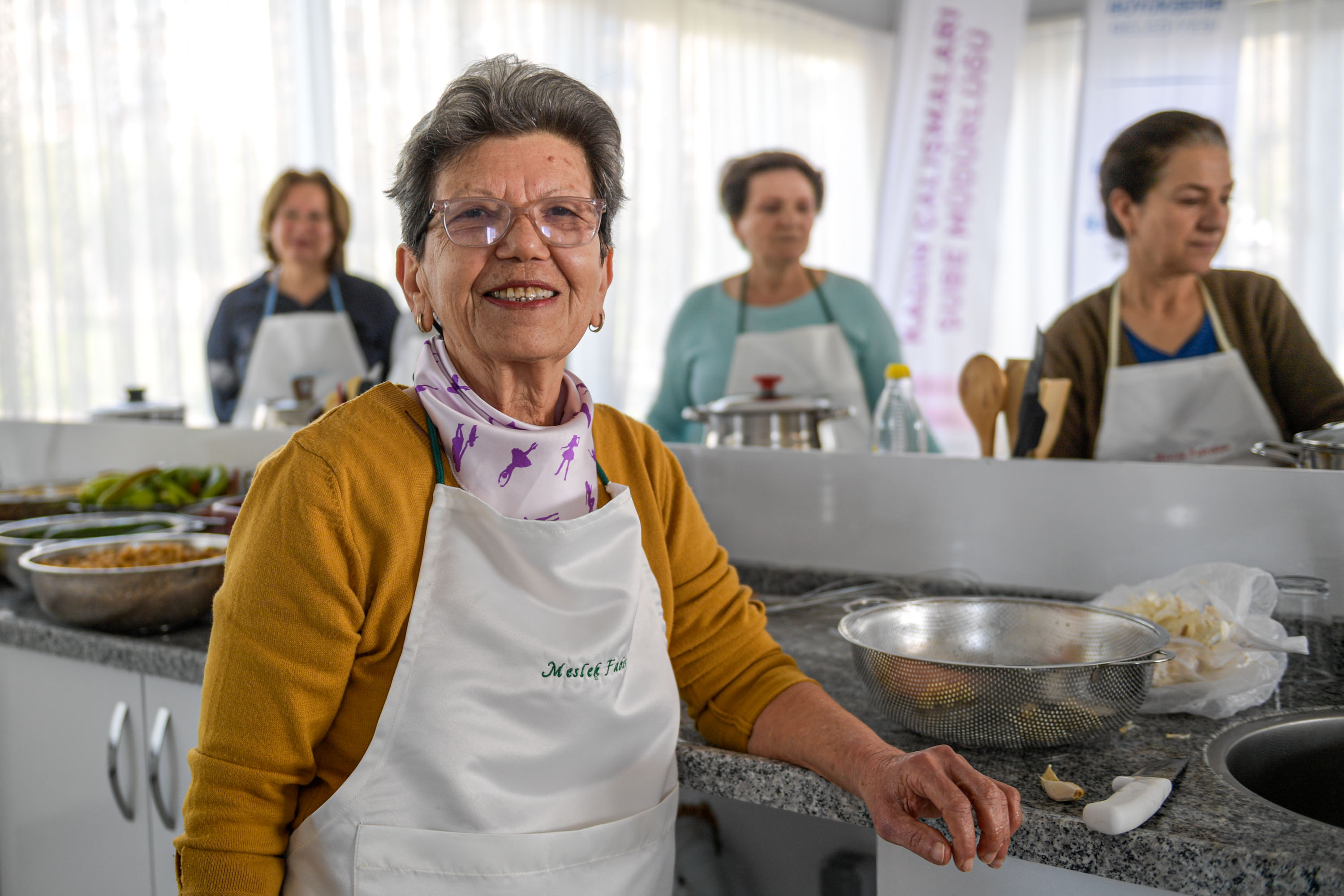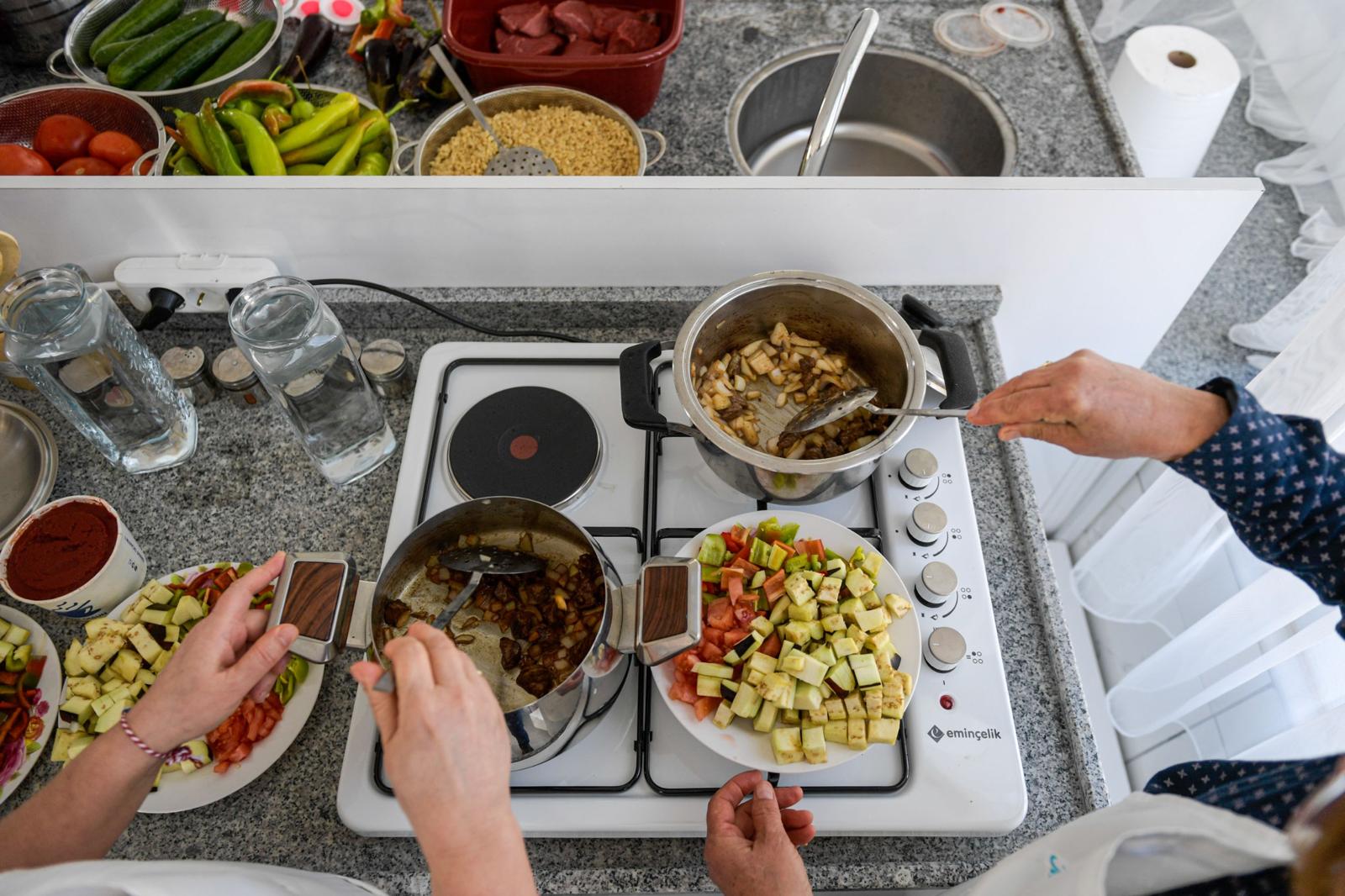 Aşevleri Şube Müdürlüğü’nde görevli gıda mühendisi Melisa Müldür, “Burası, dayanışmanın bir örneği. Bizler de gıda mühendisleri olarak yemeklerin sağlıklı koşullarda, sağlıklı hammadde ile uygun pişirme koşullarında üretilmesi ve evlere doğru şekilde muhafaza edilerek götürülmesi için buradayız. Yemek pişirme öncesinde ve pişirilme aşamasında biz de burada olacağız. Aşevleri Şube Müdürlüğü olarak yemeklerin hammaddelerini biz temin edeceğiz. Kadınlar da yemeklerini yaparak sağlıklı koşullarda evlerine götürecek” diye konuştu. Projede Meslek Fabrikası’nda yiyecek ve içecek alanlarında eğitmen olarak görev yapan personel de kadınlarla birlikte menü oluşturarak pişirme süresi boyunca onlara eşlik ediyor.