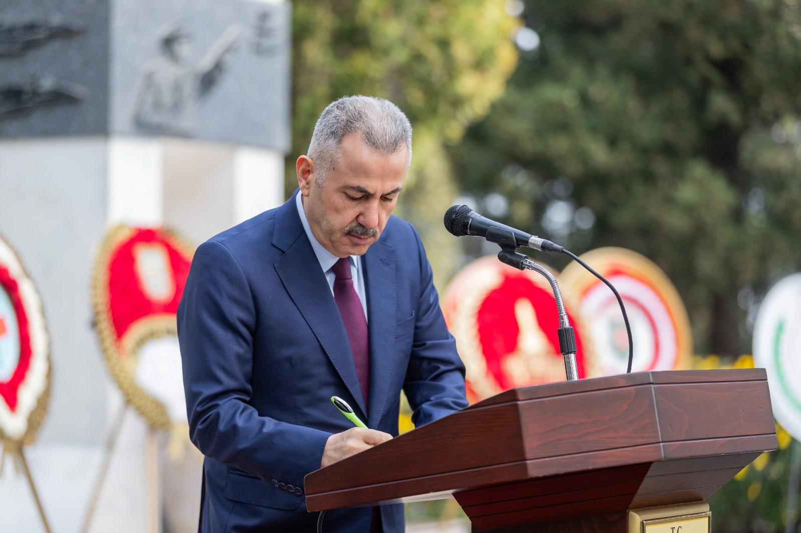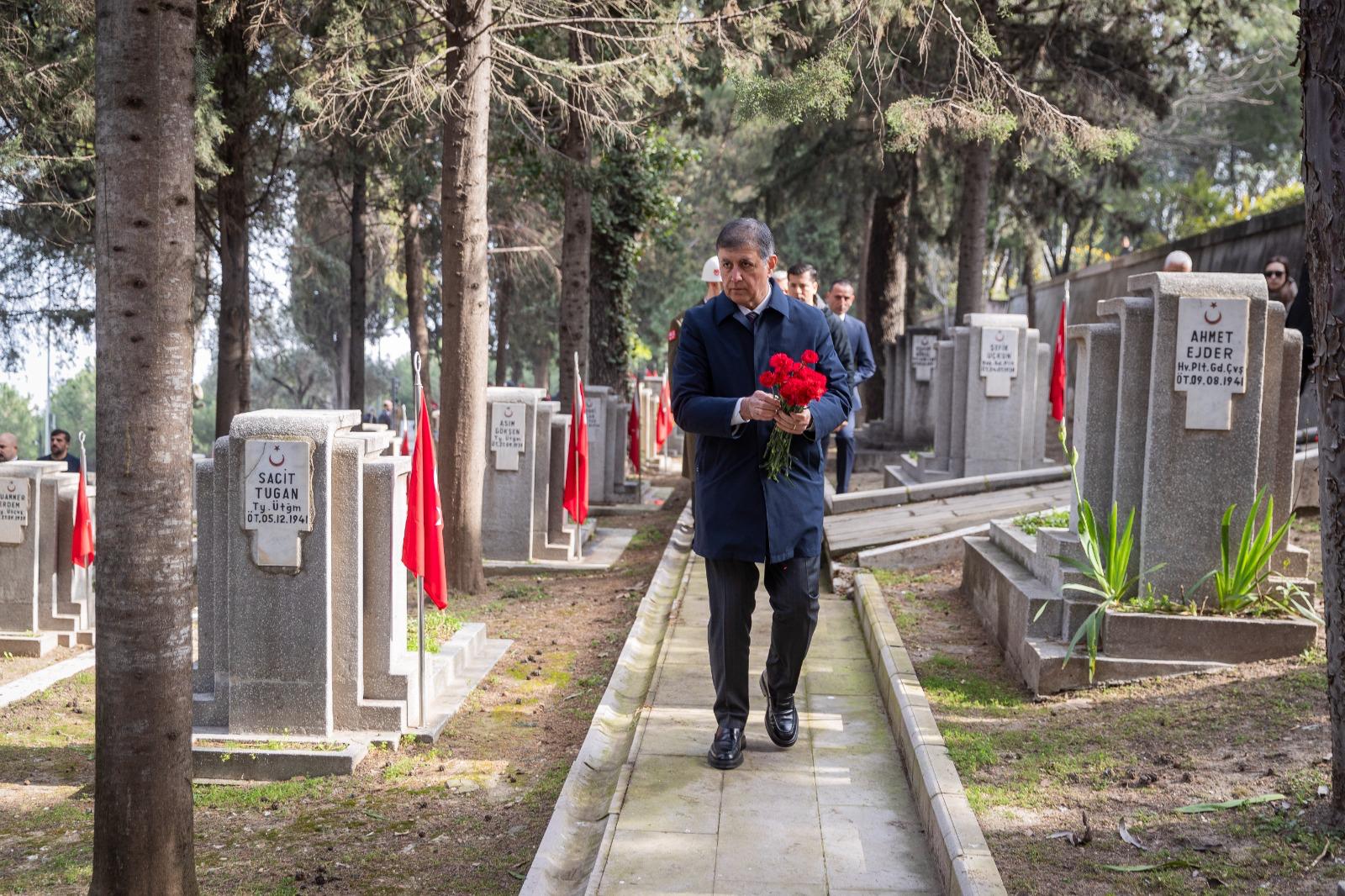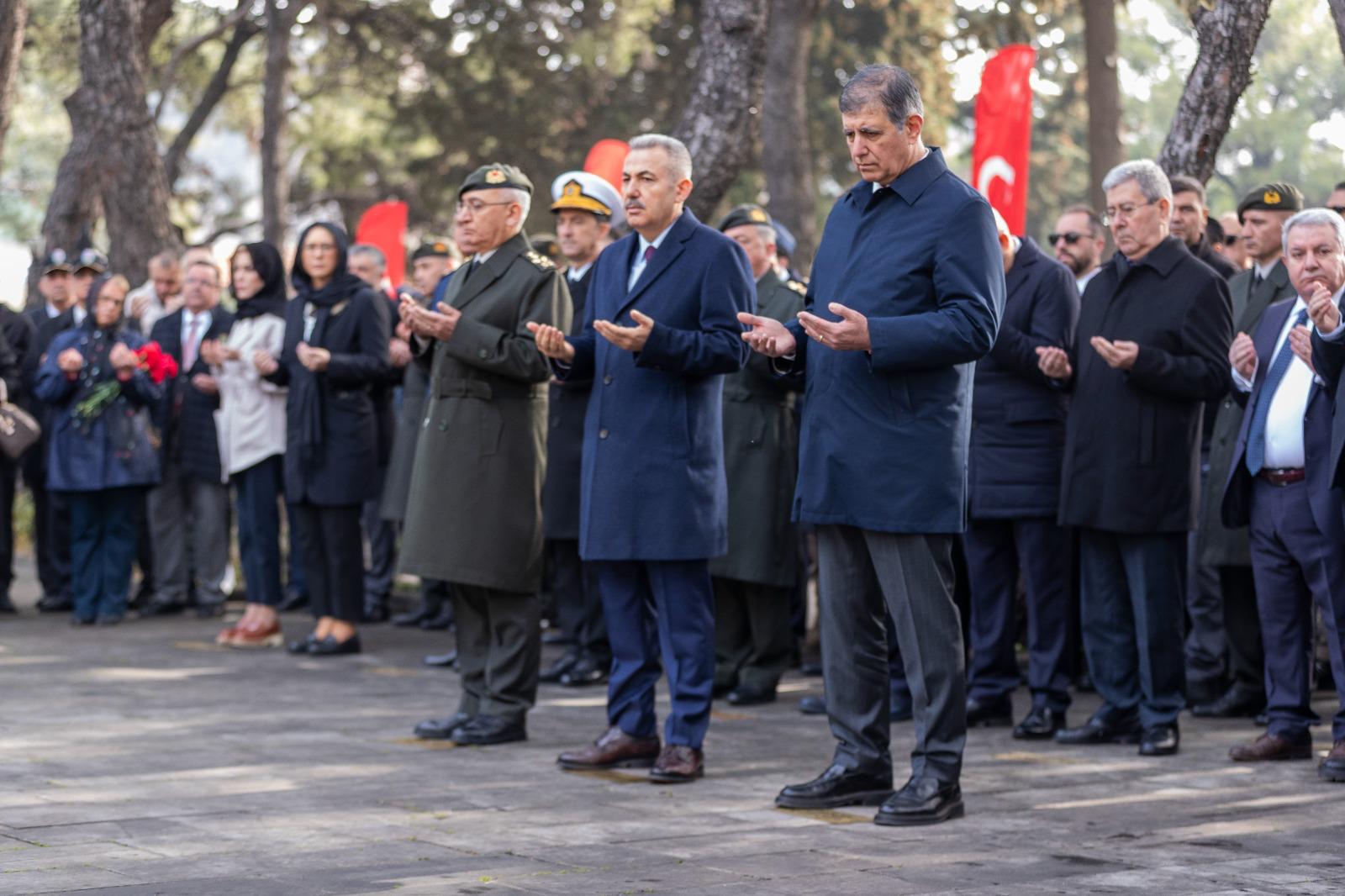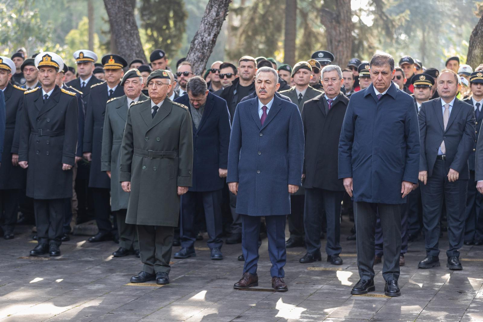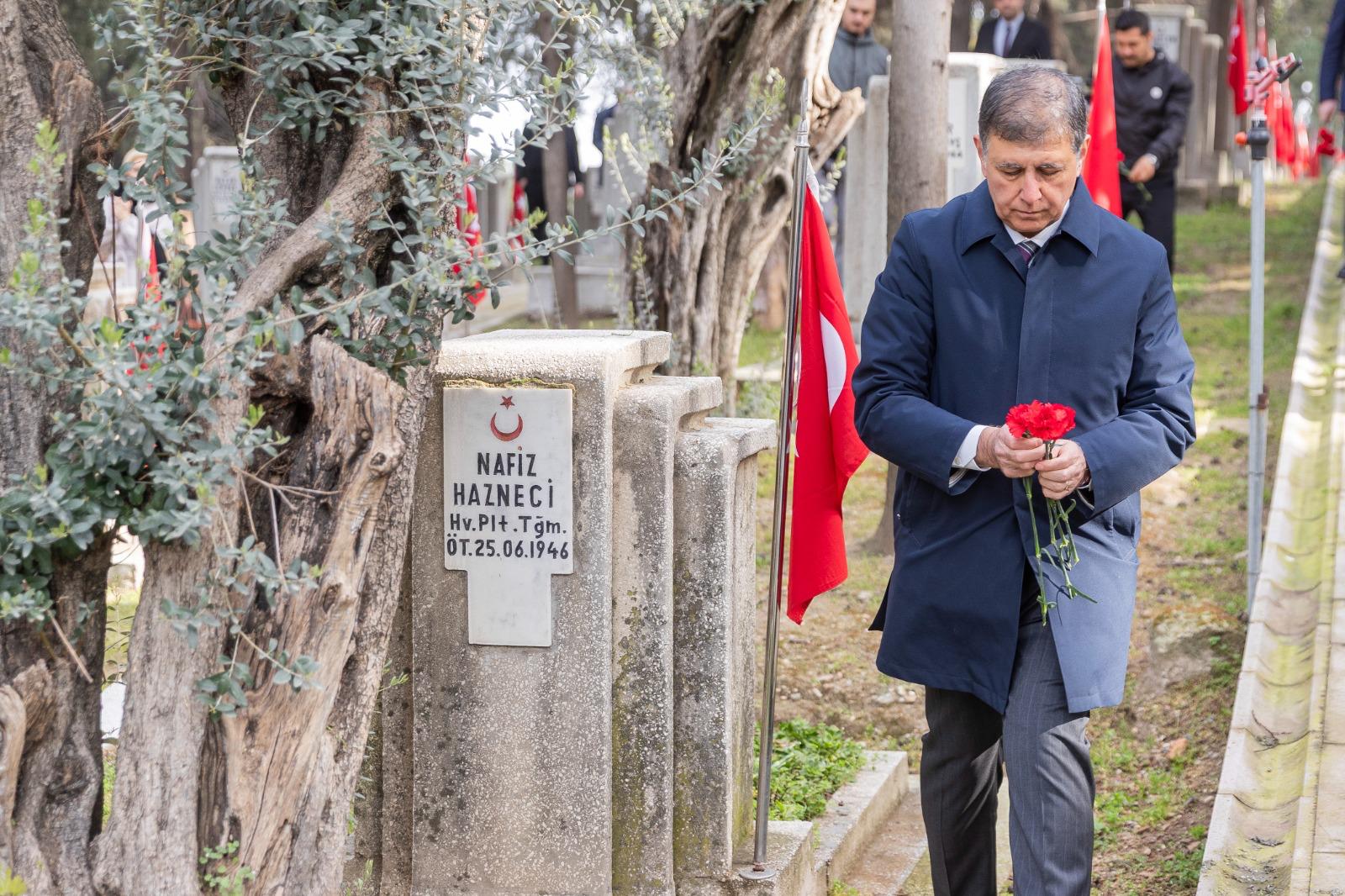 Törende Narlıdere Arkas Mesleki Teknik Anadolu Lisesi öğrencisi Gökçe Kurtcebe, “Çanakkale” adlı şiiri okudu. İzmir Valisi Dr. Süleyman Elban şehitlik defterini imzalandı. Kuran-ı Kerim Tilaveti ve dua okundu. Daha sonra şehit kabirleri ziyaret edildi ve karanfil bırakıldı. Şehitliklere karanfil bırakarak dua okuyan İzmir Büyükşehir Belediye Başkanı Dr. Cemil Tugay, şehit yakınları ve gazilerle de sohbet etti. Tugay, geçtiğimiz günlerde kullandığı F-16 tipi savaş uçağının düşmesi sonucunda şehit olan Hava Pilot Binbaşı İbrahim Bolat’ın kabrini de ziyaret edip ailesine başsağlığı diledi.