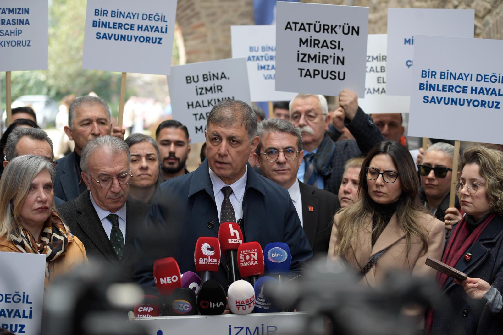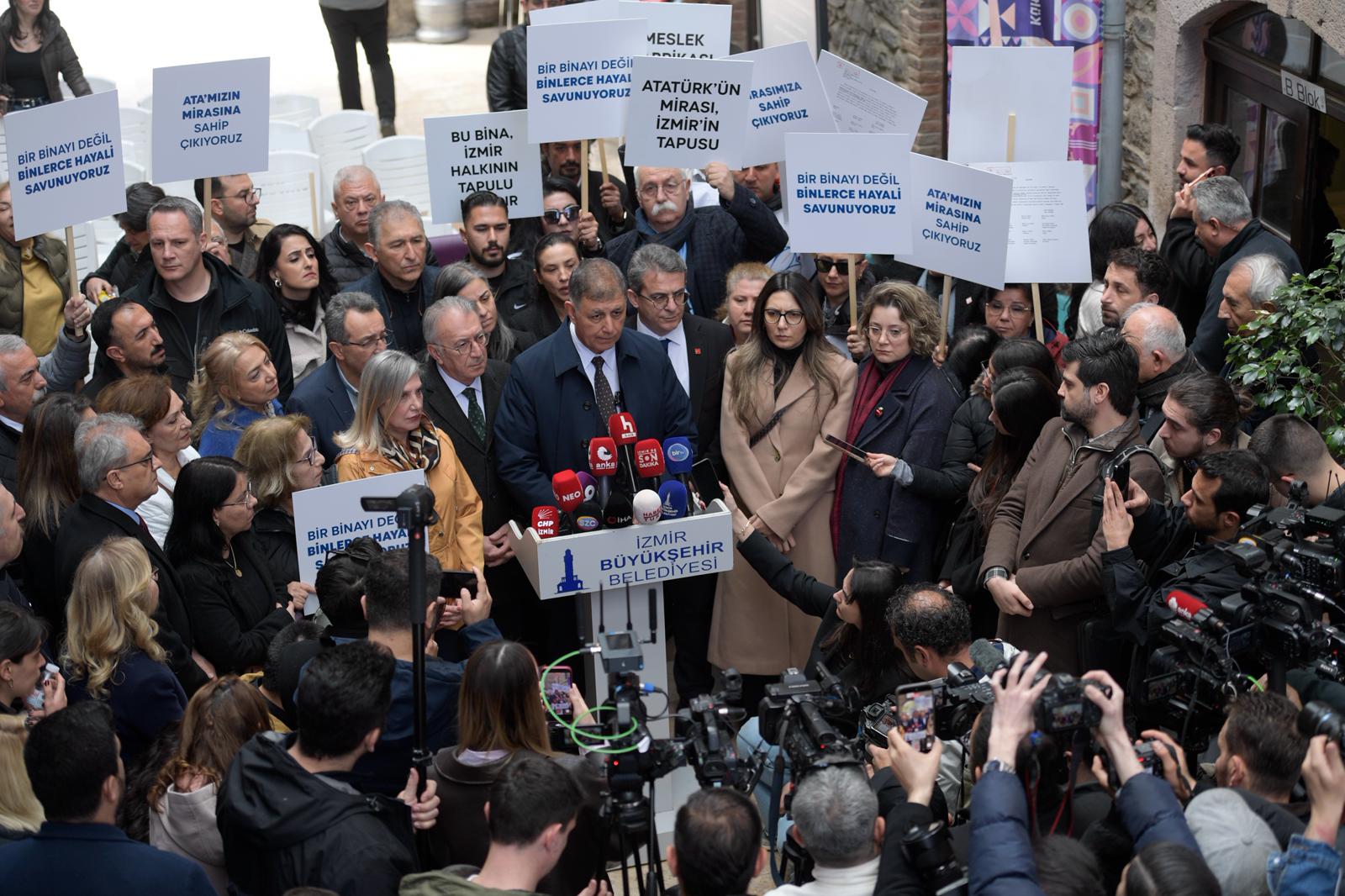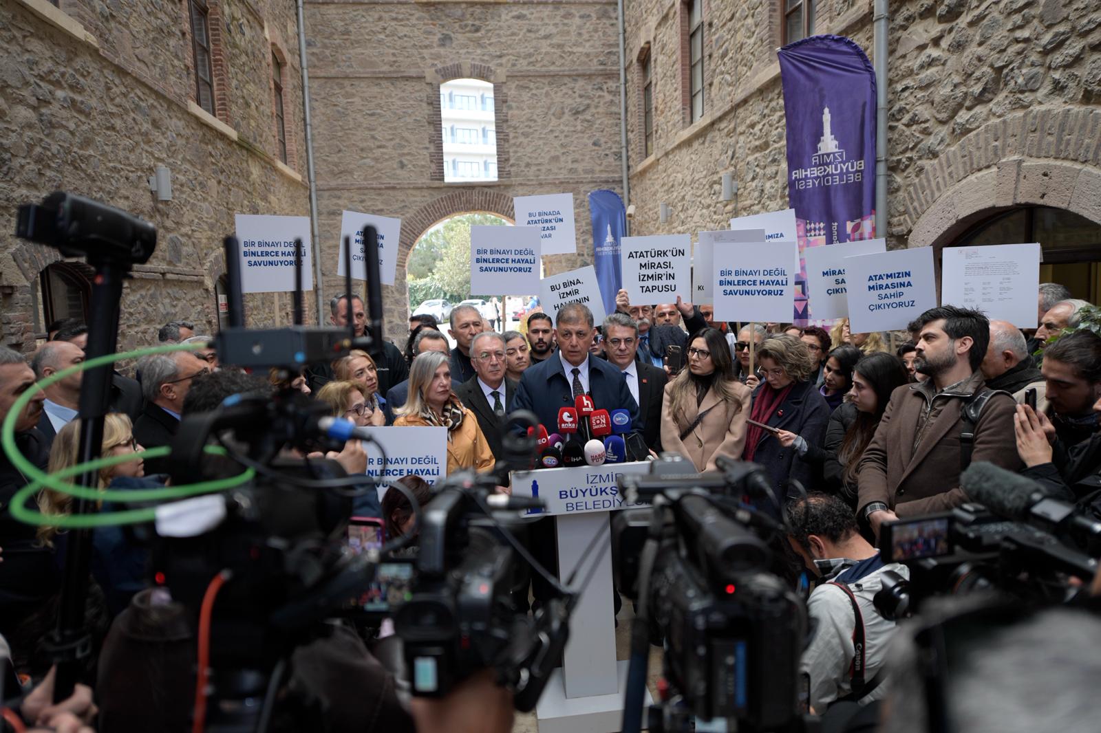 Hiçbir zaman yanlışın tarafında olmadıklarını, yanlışa boyun eğmediklerini kaydeden Başkan Tugay, konunun çok hassas olduğunu belirterek binanın tarihine dikkat çekti. 1926 yılında dönemin cumhurbaşkanı Gazi Mustafa Kemal Atatürk ve bakanlar kurulunun imzasıyla binanın kamulaştırıldığını, 1940 yılından beri belediyenin mülkiyetinde olduğunu hatırlatan Başkan Tugay, 2007 yılında Vakıfların şerhinin kaldırılması için yüklü bir ödeme yapıldığını ve yine büyük bir masrafla binanın restore edilerek Meslek Fabrikası olarak hizmet verdiğini söyledi. Meslek Fabrikası’nda kursların devam ettiğini ifade eden Başkan Tugay, “Bizim ne bu binayı vermemiz ne de bu hizmetten vazgeçmemiz mümkün değil. Alelacele ‘burayı boşaltın’ isteğini bir telaş olarak görüyoruz. Bu istekte bulunanları da tamamen İzmir’e zarar verme amacı güden ve İzmir’in hakkına hukukuna saygı göstermeyen insanlar olarak görüyoruz. Bu işin arkasında bir siyasi irade var. Birileri siyasi olarak bu konuyu sahipleniyorlar ve bir telaş içindeler. Burayı elimizden zorla almaya çalışıyorlar” açıklamasında bulundu.
