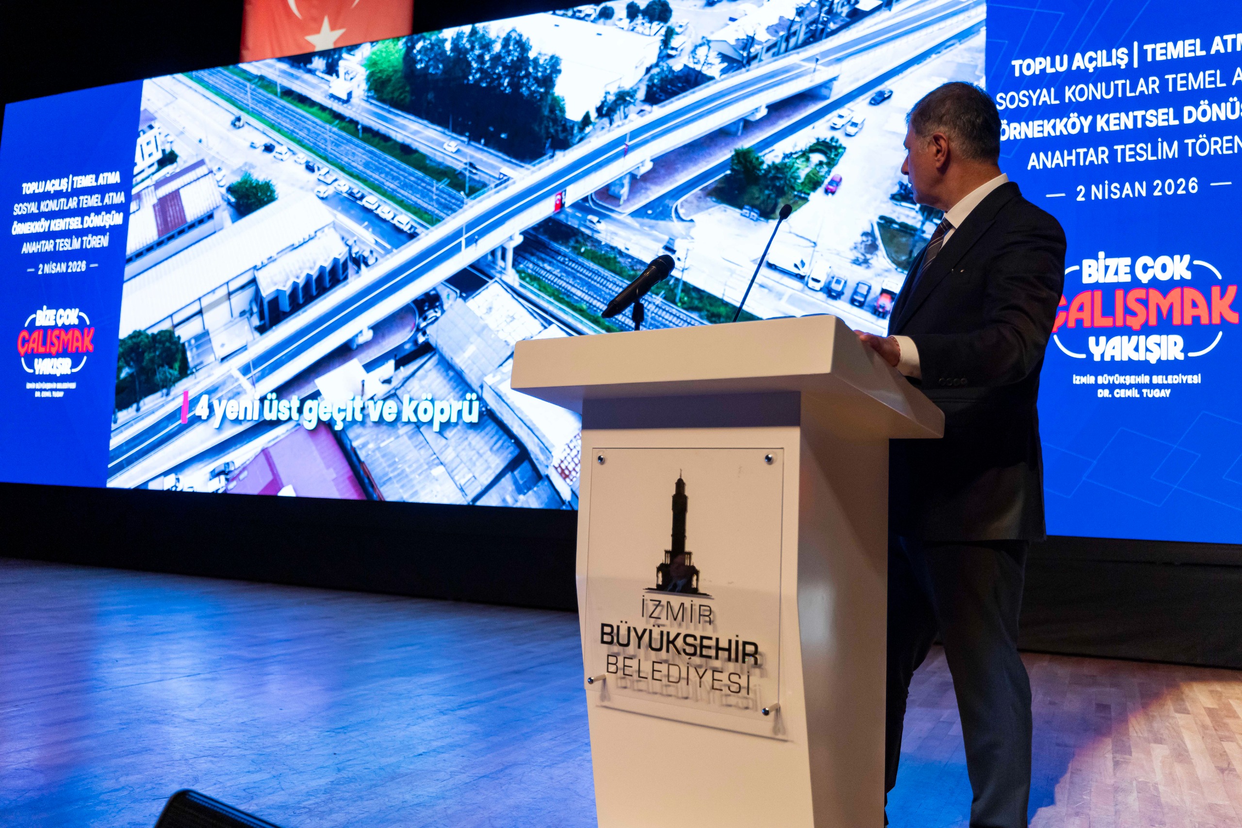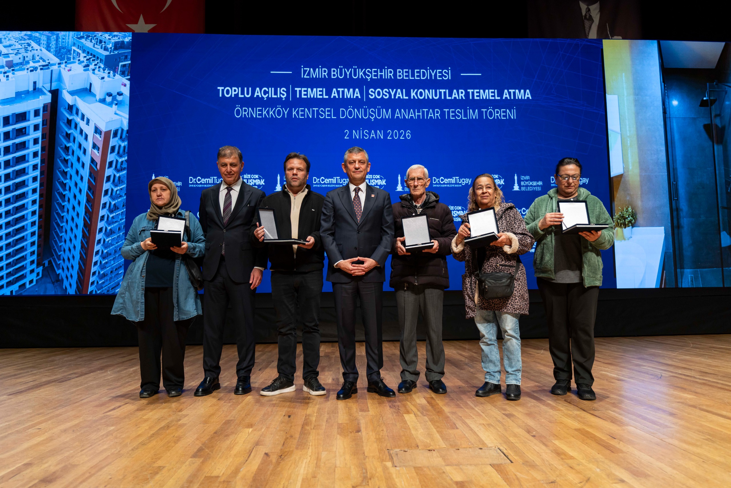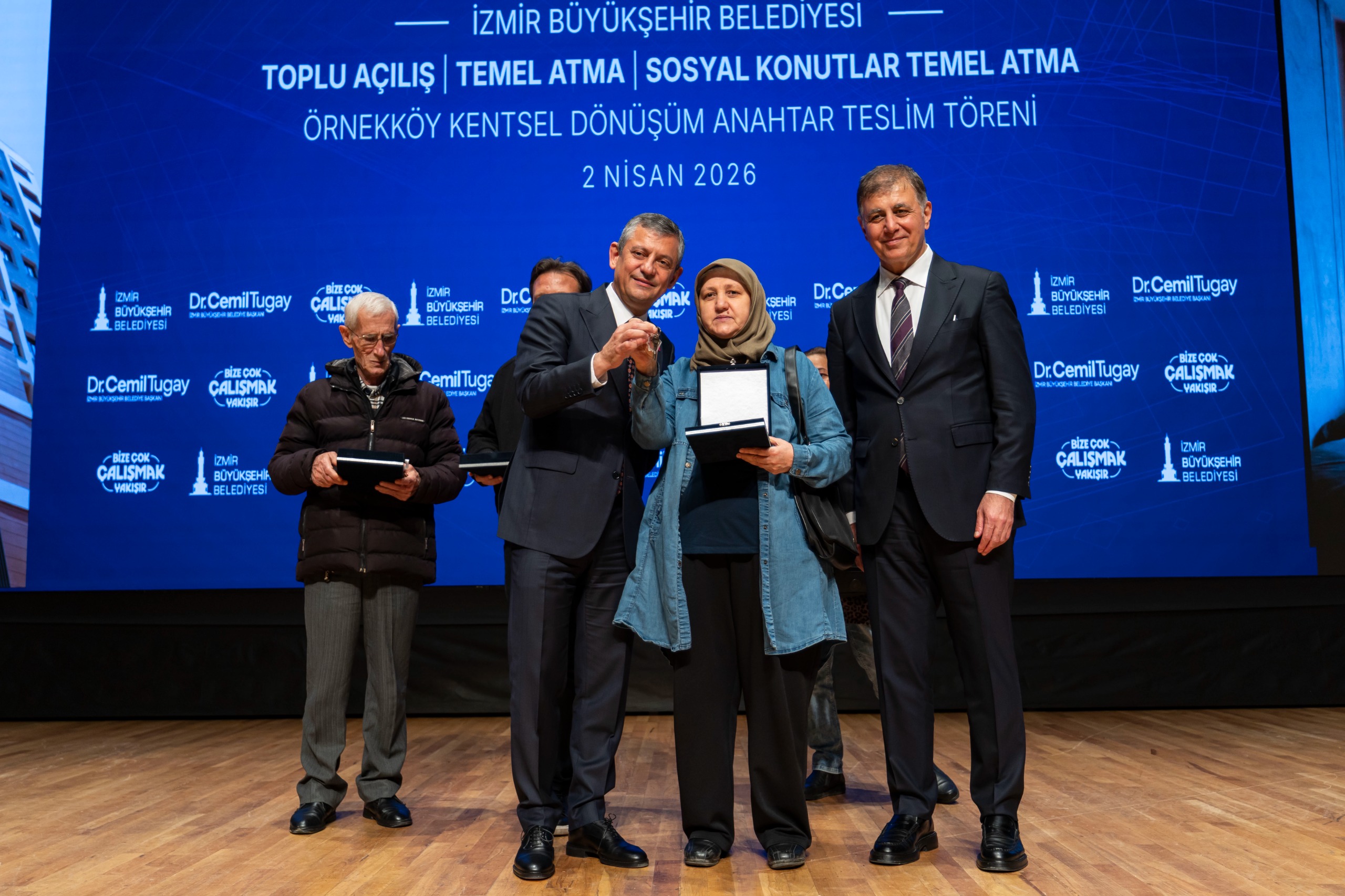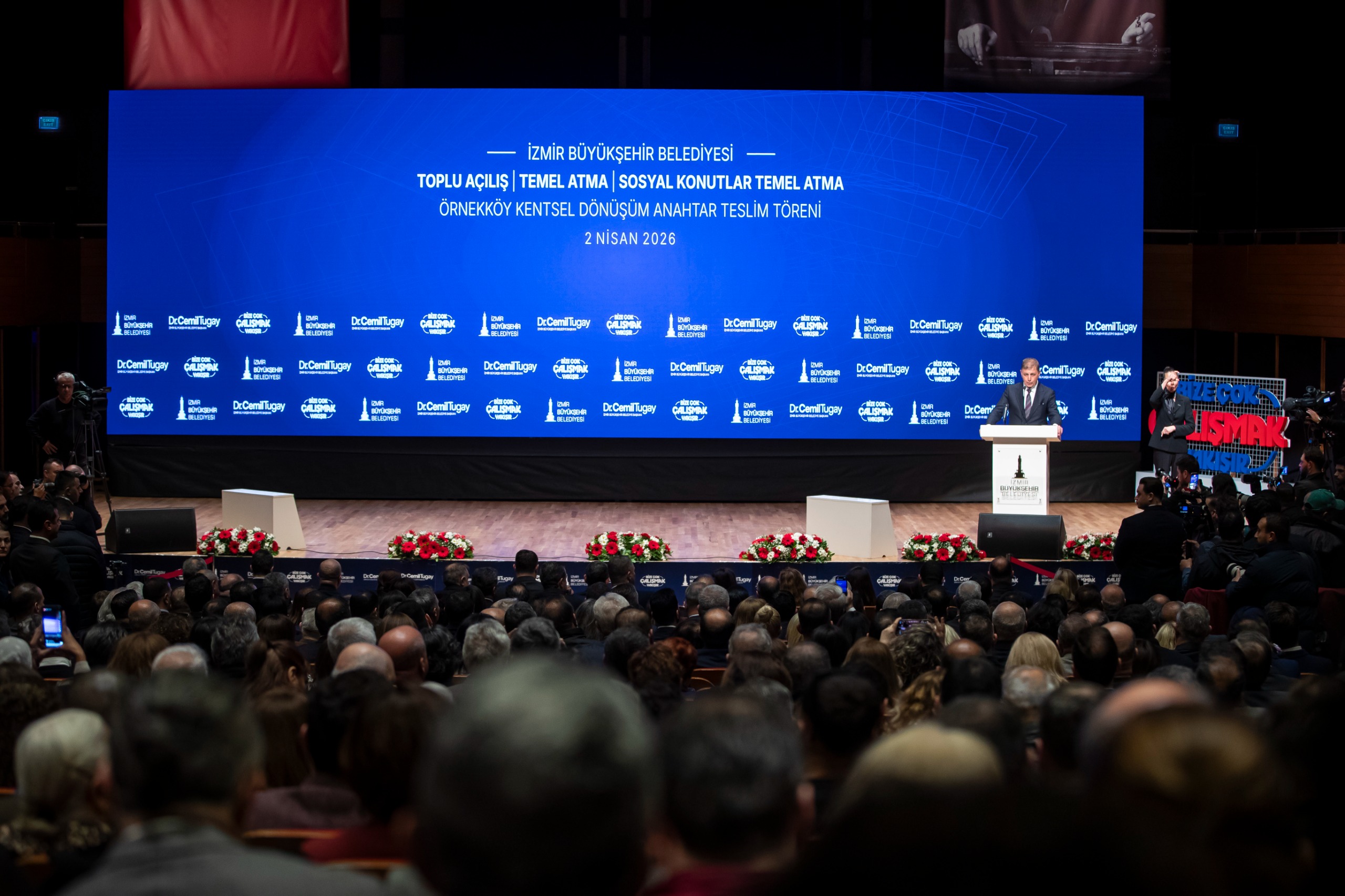Buluşma kapsamında Başkan Tugay’ın seçim vaatlerinden Egeşehir Menemen Konutları’nın ilk iki etabının temeli atıldı. Ayrıca Örnekköy’de 4. Etap’ta inşaat çalışmaları tamamlanan 114 bağımsız bölüm için bazı hak sahiplerine anahtarları teslim edildi. Program kapsamında İzmir genelinde iki yıl boyunca hayata geçirilen yatırımlar, temeli atılacak dev projeler ve açılışı yapılan hizmetler tanıtıldı. Ayrıca tören sırasında canlı bağlantı kurularak Egeşehir Menemen Konutları, Dikili İtfaiye Hizmet Binası, Hasan Ali Yücel Kütüphanesi, Dikili ve Aliağa Şakran ileri biyolojik atık su arıtma tesisler ve kanalizasyon altyapı inşaatlarının temelleri atıldı.