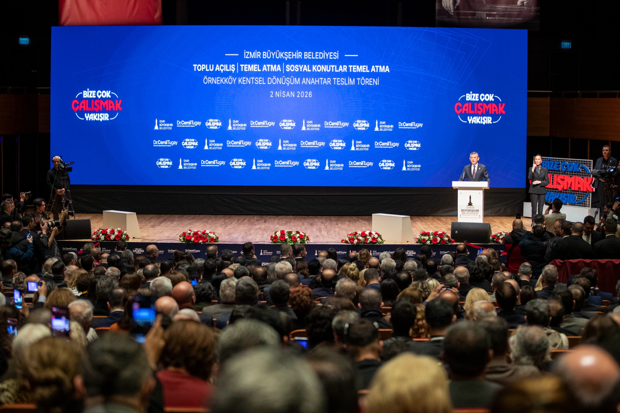 - İzmir Büyükşehir Belediyesi’nin kentin dört bir yanında hayata geçirdiği projelerin toplu açılış, temel atma, anahtar teslim töreni Cumhuriyet Halk Partisi Genel Başkanı Özgür Özel’in katılımıyla yapıldı. Tarihi buluşmada konuşan CHP Lideri Özel, İzmir’deki çalışmaları örnek gösterirken, “İzmir’de olmaktan, böyle bir ekiple çalışıyor olmaktan çok büyük memnuniyet duyuyorum. İyi ki İzmir var. İyi ki CHP’nin amiral, sancak gemisi… İyi ki CHP’nin çok sevdiği bu güzel şehir var. Çok daha güzel günleri sizin sayenizde Türkiye görecek” dedi.