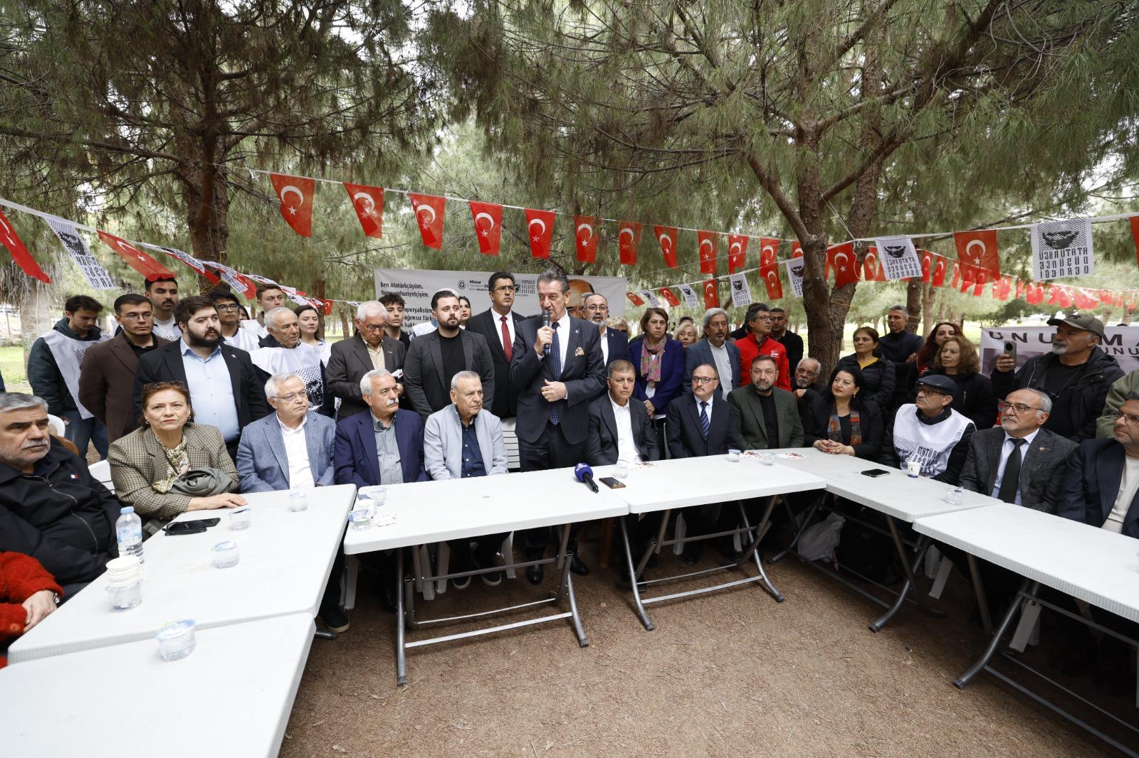 Toplantıda konuşan Başkan Dr. Cemil Tugay, “Burada olmanız bizim için çok değerli ve anlamlı. Bize cumhuriyeti miras bırakan Ata’mızın İzmir’e armağan ettiği bir bina. En azından bu mirasa, İzmir’in şehitlerine saygılı bir duruş göstermeleri gerekirdi. Türkiye’de ilk defa bir kamu kurumu başka bir kamu kurumuyla mülkiyet tartışması yaşıyor. Normalde iki ayrı kurumun bir şekilde hukuk zemininde uzlaşması gerekirken, bina sabahın 5’inde polis baskınıyla ablukaya alınıyor. Bu hukuksuz tavra karşı sessizce buradan çıkıp gitmemizi söylediler. Bunu yapamadık. Bu konu sadece İzmir Büyükşehir Belediye Başkanının sorunu değil. Sadece bir mülkiyet sorunu da değil. Bu, büyük bir saygısızlık. İzmir halkına ait olan herhangi bir mülke devlet kurumu da olsa bu şekilde el konulamaz. Türkiye’nin pek çok şehrinde benzer durumu görüyoruz. Bu hukuksuzluk, devlet geleneğine saygısızlık, halkın hakkına saygısızlık normalleştirilmeye çalışılıyor” ifadelerini kullandı.