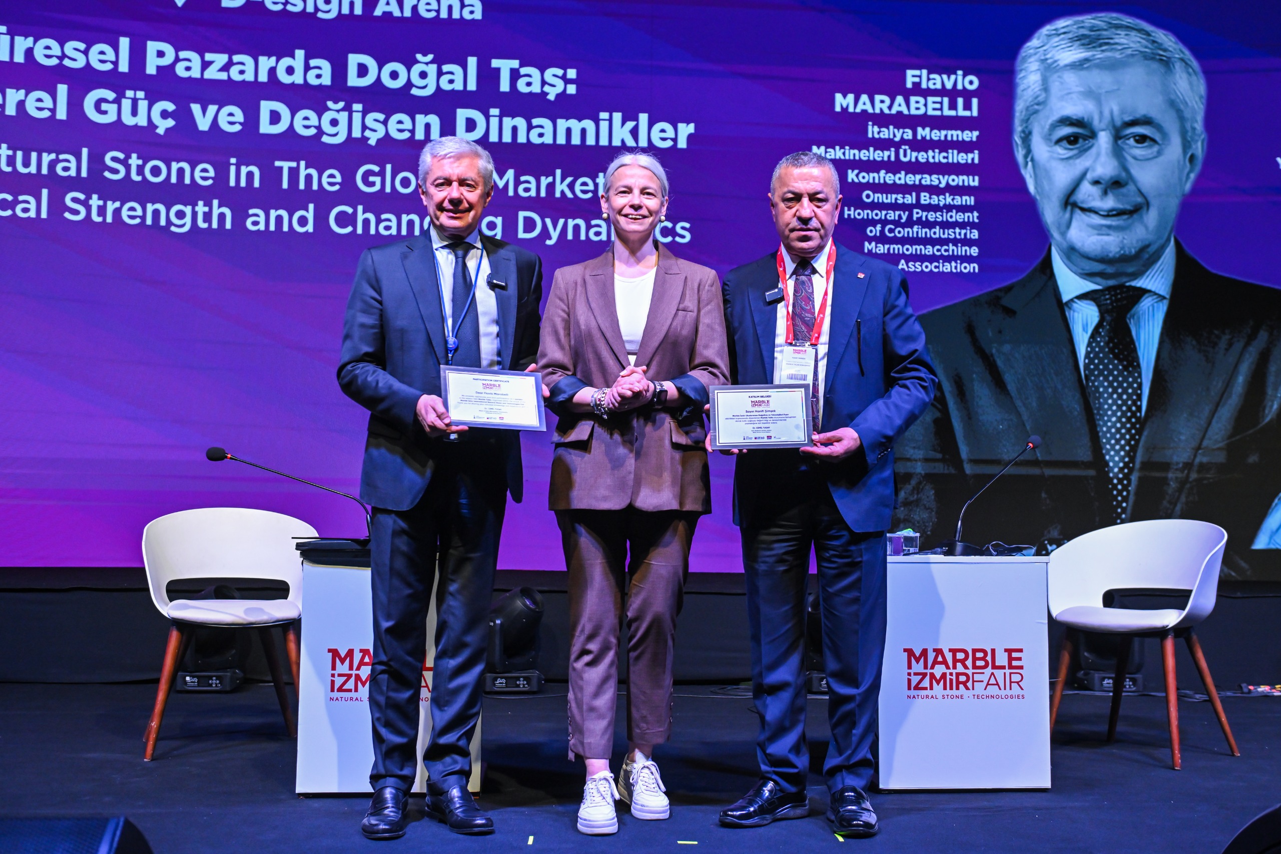 Küresel ticarette yaşanan gelişmelere de değinen Flavio Marabelli, artan vergiler, ticaret engelleri ve jeopolitik gelişmelerin sektörü doğrudan etkilediğini ifade ederek özellikle ABD ve Körfez ülkeleri pazarlarında yaşanan değişimlerin ticaret akışını ve sektör içindeki ilişkileri zorlaştırdığını dile getirdi. Sektörün, ülke ayrımı olmadan birlikte hareket etmesi gerekliliğine dikkat çeken Marabelli, “Doğal taş sektörü, yapısı gereği zaten uluslararası bir üretim modeliyle ilerliyor. Aynı projede farklı ülkelerden gelen taş, teknoloji ve uygulamalar birlikte bulunabiliyor. Bu zaten birlikte üretimin kendisi. Ülkelerin birbirini rakip olarak konumlandırması doğru bir yaklaşım değil. Asıl mesele, doğal taşı taklit eden ürünlere karşı sektörün ortak hareket etmesi olmalı” diyerek doğal taşın sürdürülebilirliği, kültürel değeri ve özgünlüğünün birlikte anlatılmasının önemini vurguladı.
