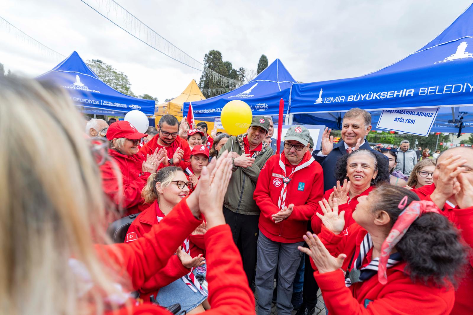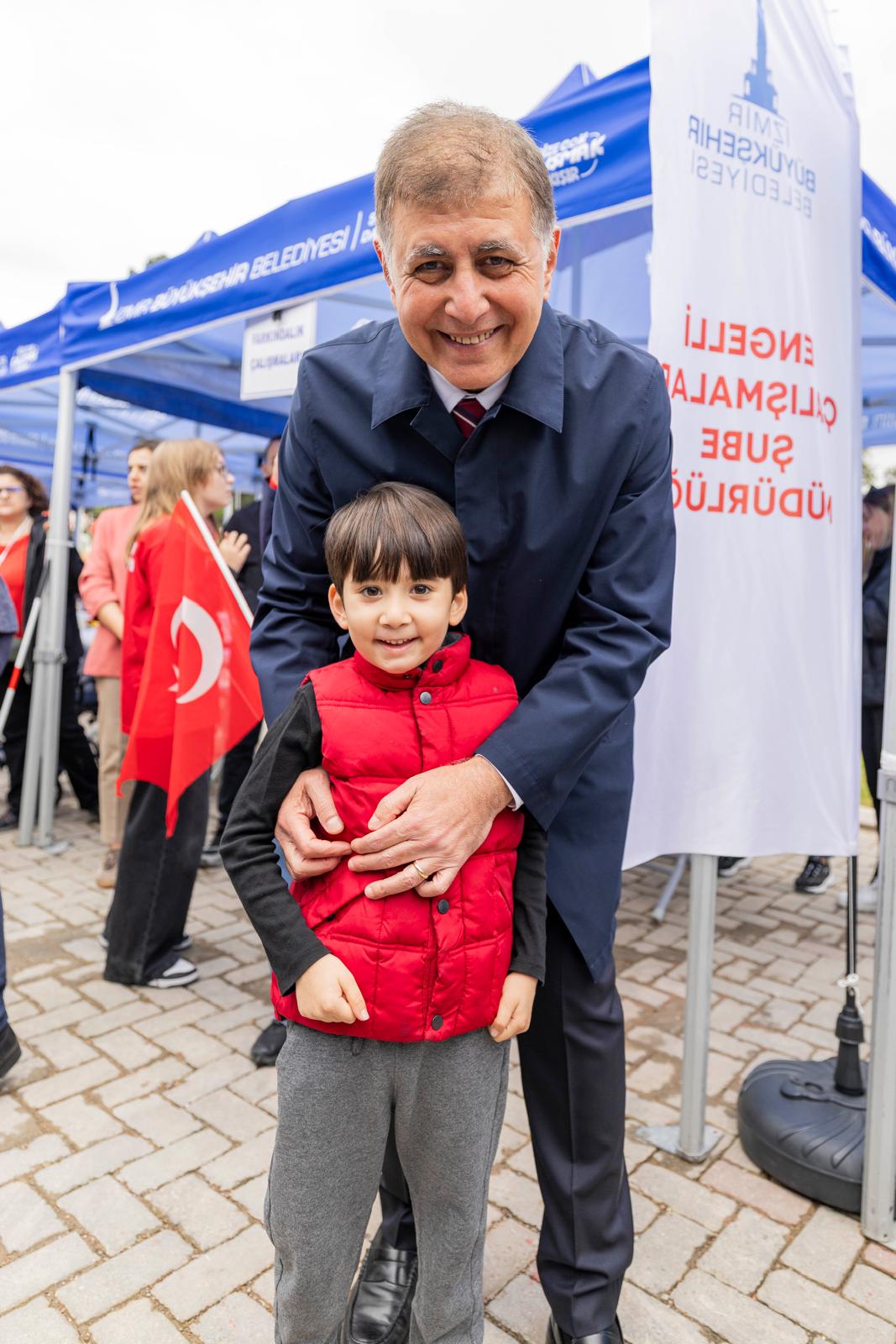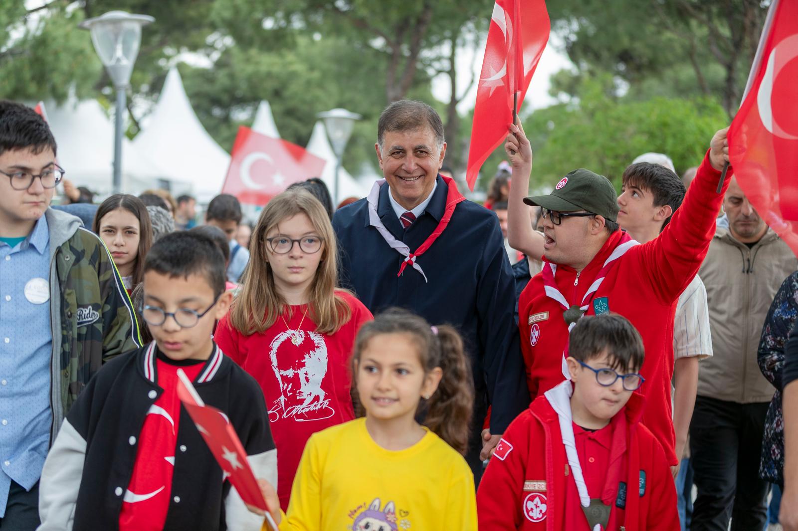 İzmir’de 23 Nisan Ulusal Egemenlik ve Çocuk Bayramı sabahın ilk saatlerinden itibaren coşkuyla kutlanıyor. İzmir Büyükşehir Belediyesi tarafından kentin dört bir yanında düzenlenen etkinlikler, Kültürpark’ta gerçekleştirilen programla taçlandı. Kültürpark’taki kutlamalar, İzmir Büyükşehir Belediye Başkanı Dr. Cemil Tugay’ın katıldığı kortej yürüyüşü ile başladı. Kaskatlı Havuz’dan bando eşliğinde etkinlik alanına kadar süren korteje çocuklar ve aileleri, ellerindeki Türk bayraklarıyla eşlik etti. Başkan Tugay, etkinlik alanına Melek İzciler adlı izci grubundan otizmli Ömercan Anamer ve Osman Türkekul ile birlikte girdi. Çocukların yoğun ilgisiyle karşılanan Tugay, kurulan stantları gezerek çocuklarla sık sık fotoğraf çektirdi.