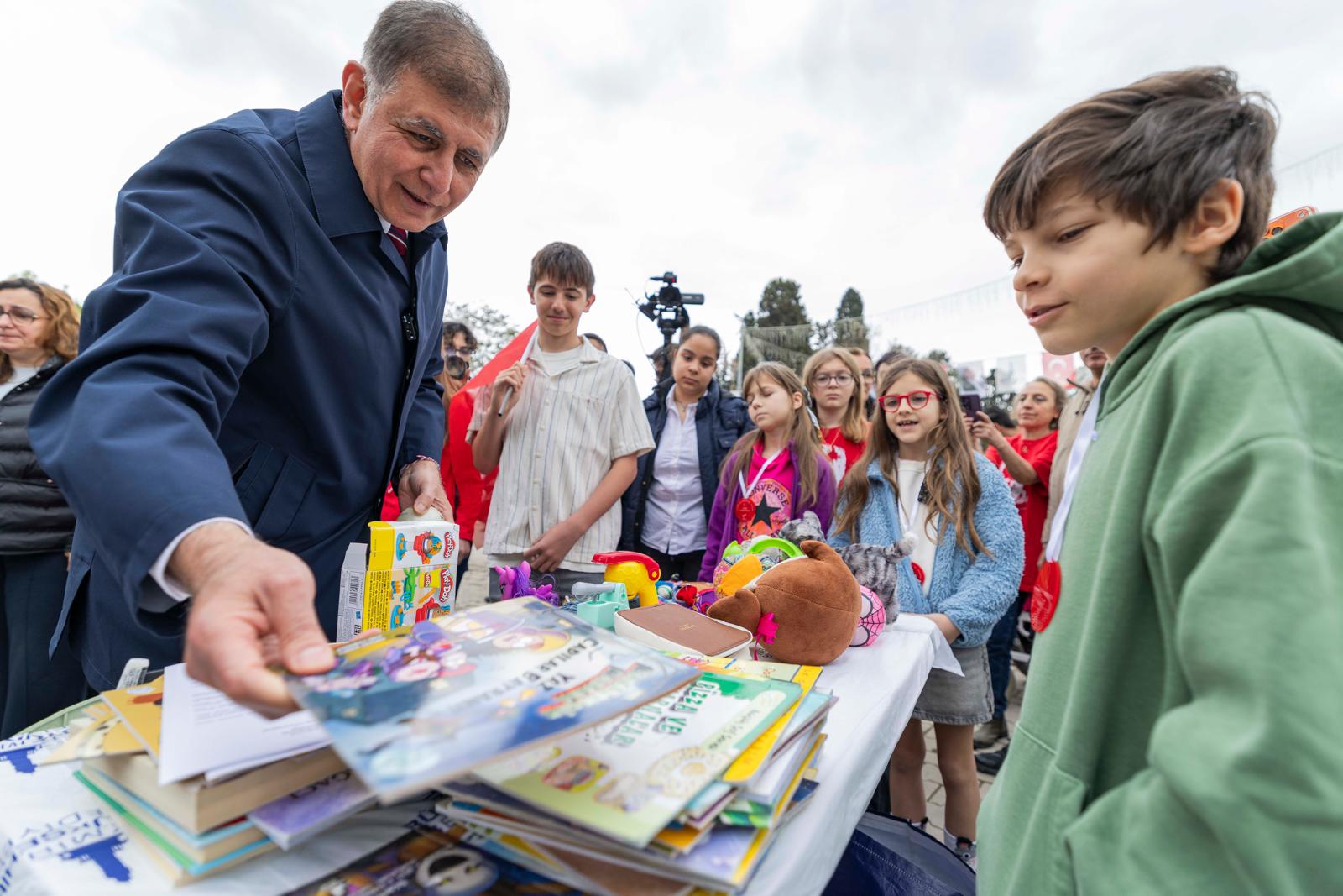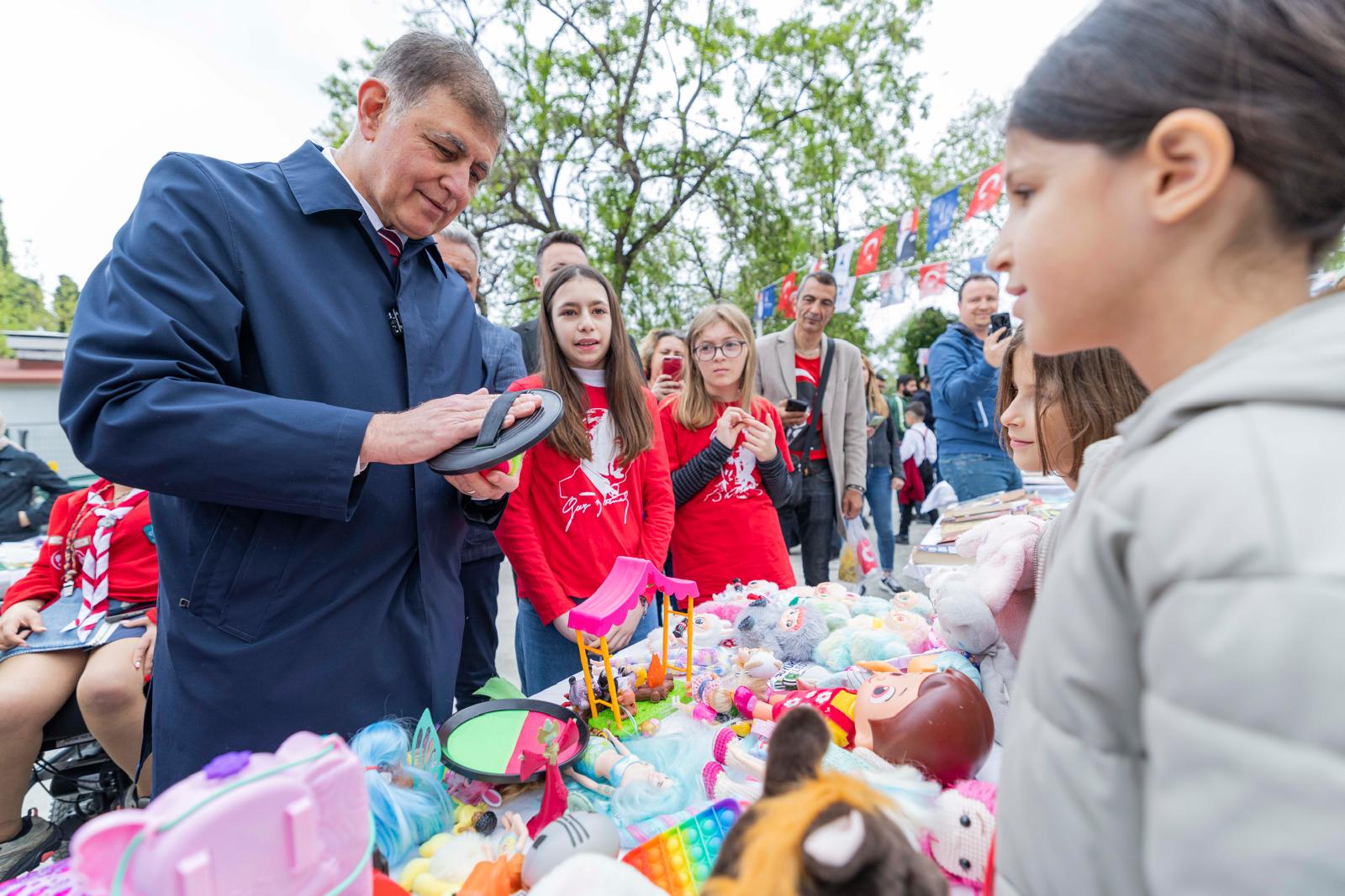 23 Nisan Ulusal Egemenlik ve Çocuk Bayramı programı kapsamında Kültürpark etkinlik alanında çocuklara yönelik “İkinci El Pazarı” kuruldu. Çocukların paylaşma kültürünü deneyimlemesi, üretmenin değerini fark etmesi ve küçük bir alışveriş deneyimi yaşamaları amacıyla düzenlenen pazarda kitaplar, oyuncaklar, spor malzemeleri ve çeşitli eşyalar yeniden kullanıma kazandırıldı. 7–14 yaş arası çocukların katılımına açık olan pazarı İzmir Büyükşehir Belediye Başkanı Dr. Cemil Tugay da ziyaret etti. Çocuklardan oyuncak ve kitap satın alan Tugay, aldığı ürünleri etkinlik alanındaki çocuklara hediye etti.