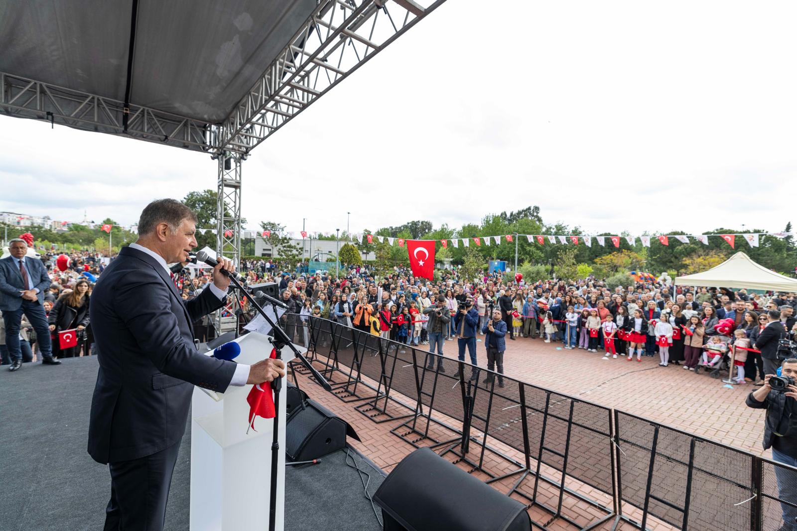 İzmir Büyükşehir Belediye Başkanı Dr. Cemil Tugay, 23 Nisan Ulusal Egemenlik ve Çocuk Bayramı etkinlikleri kapsamında Bornova Belediyesi tarafından Aşık Veysel Rekreasyon Alanı'nda düzenlenen Geleneksel Uçurtma Şenliği'ne katıldı. Bornova Belediye Başkanı Ömer Eşki'nin de eşlik ettiği Tugay, çocukların neşesine ortak oldu. Şenlikte, okul saldırılarında hayatını kaybedenleri anmak ve farkındalık yaratmak için gökyüzüne 9 siyah balon bırakıldı. Başkan Tugay ile Ömer Eşki, Belediye Çocuk Korosu ile İzmir Marşı'nı seslendirdi.