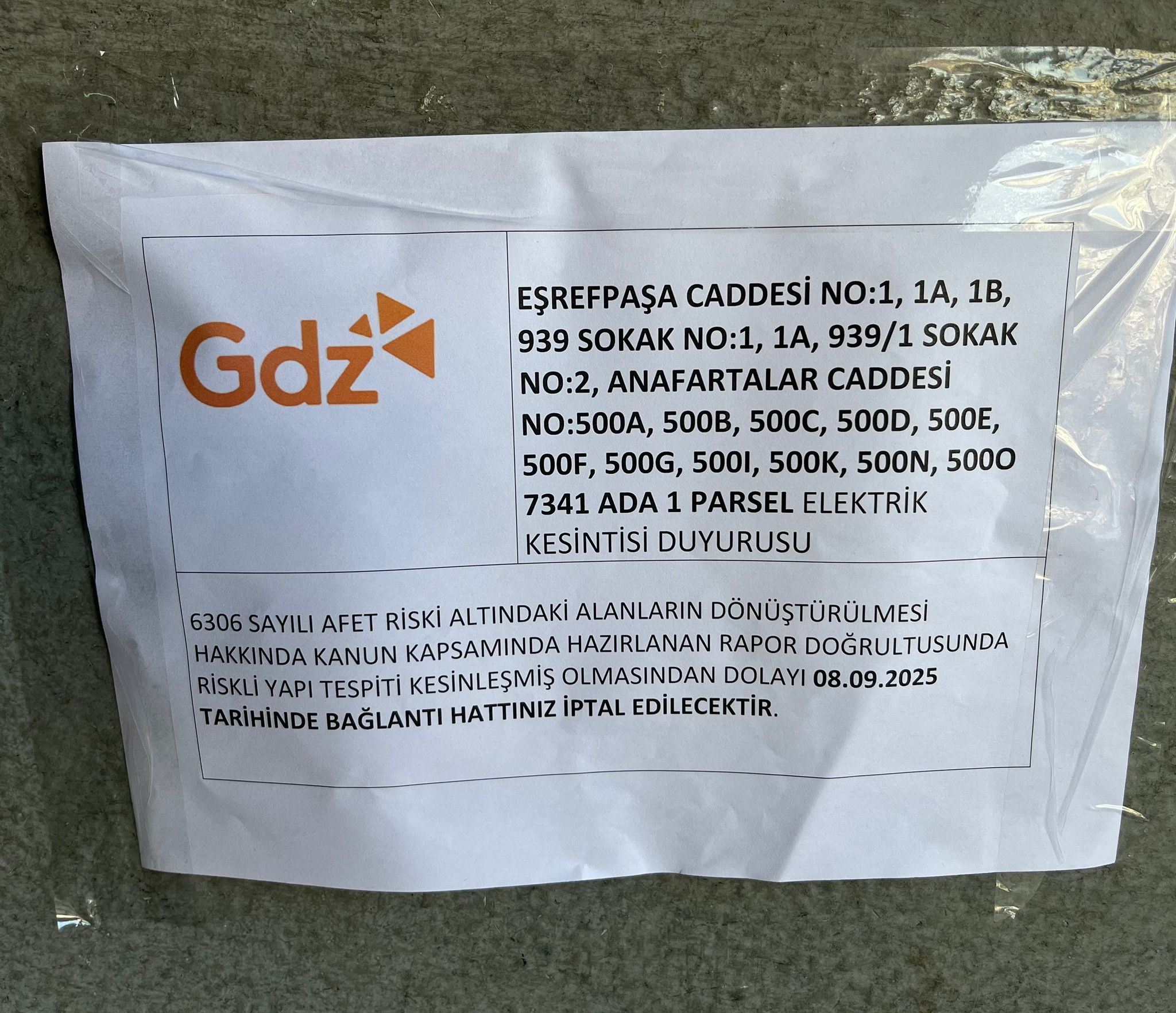 Sonraki aşamada ise Çevre, Şehircilik ve İklim Değişikliği İzmir İl Müdürlüğü’nün 29.07.2025 tarihli yazısı ile söz konusu taşınmazın ilgili kurumlarca elektrik, su ve doğal gaz hizmetlerinin durdurulması ve yıkım işlemlerine başlanılması gerektiği bildirilmiştir. Bu kapsamda GDZ Elektrik Dağıtım AŞ tarafından yapıya bağlantı hattının 08.09.2025 tarihinde iptal edileceği duyurusu asılmıştır.